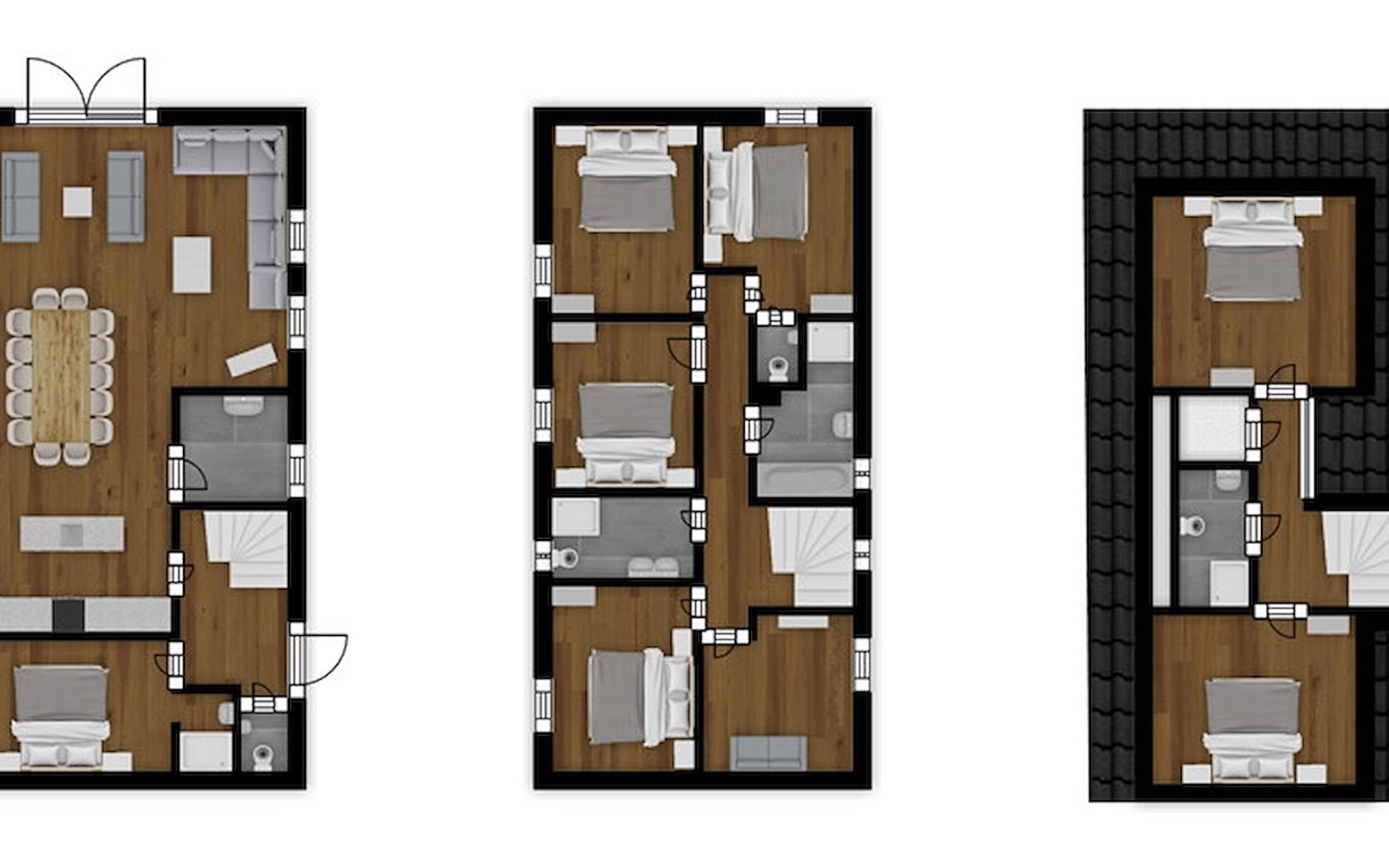 Op de tweede verdieping bevinden zich 2 tweepersoonsslaapkamers met 2 éénpersoonsbedden. Ook hier is een vierde badkamer met een douche, wastafel en toilet.