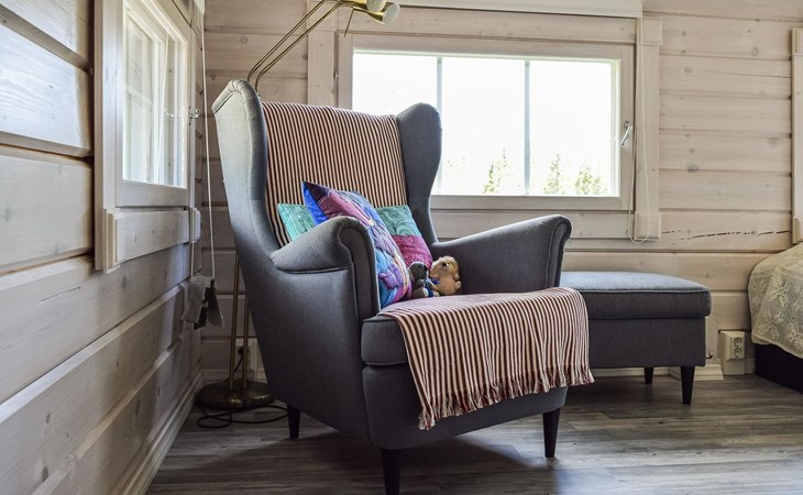 Shallow loft space with double bed and a seating group, steep stairs to loft.
