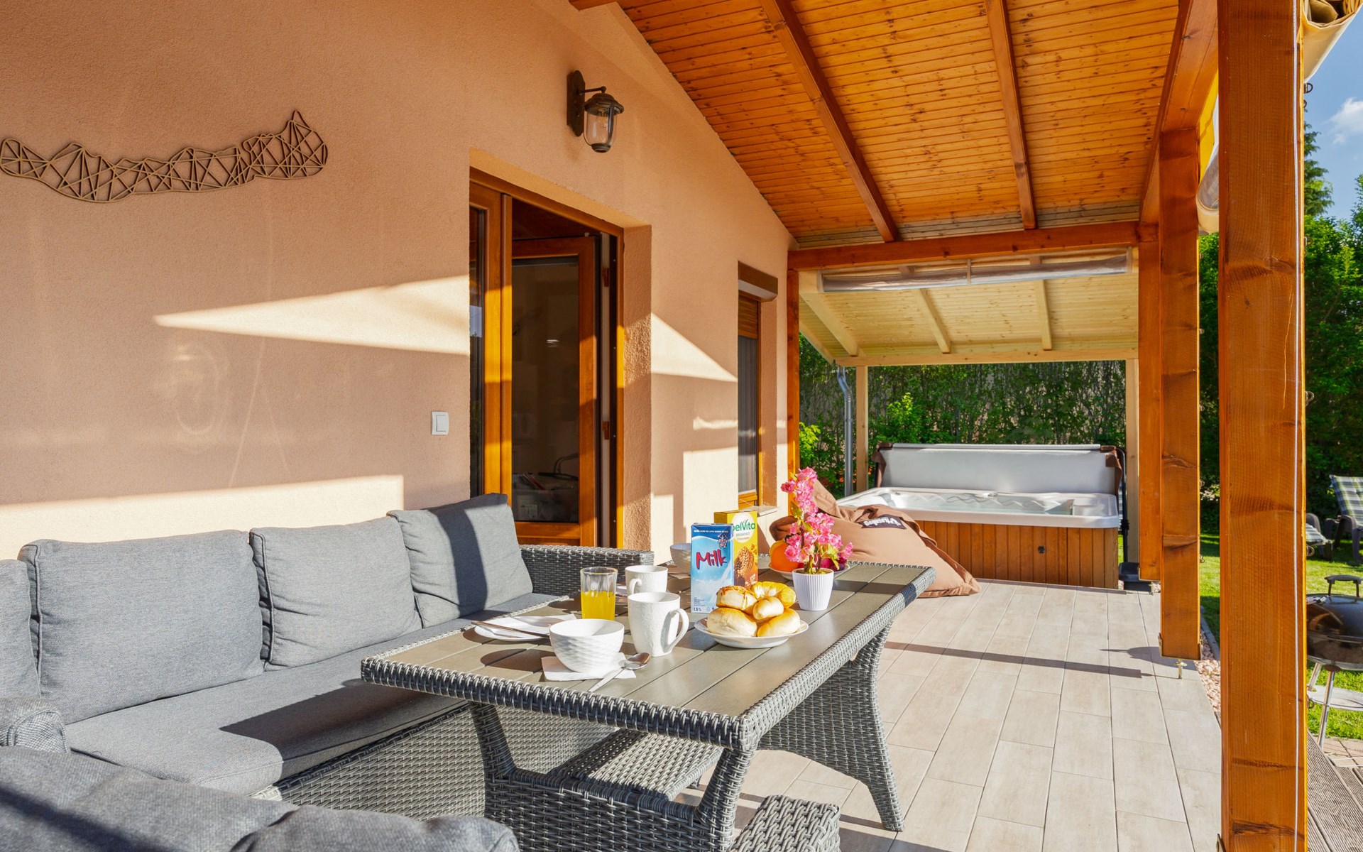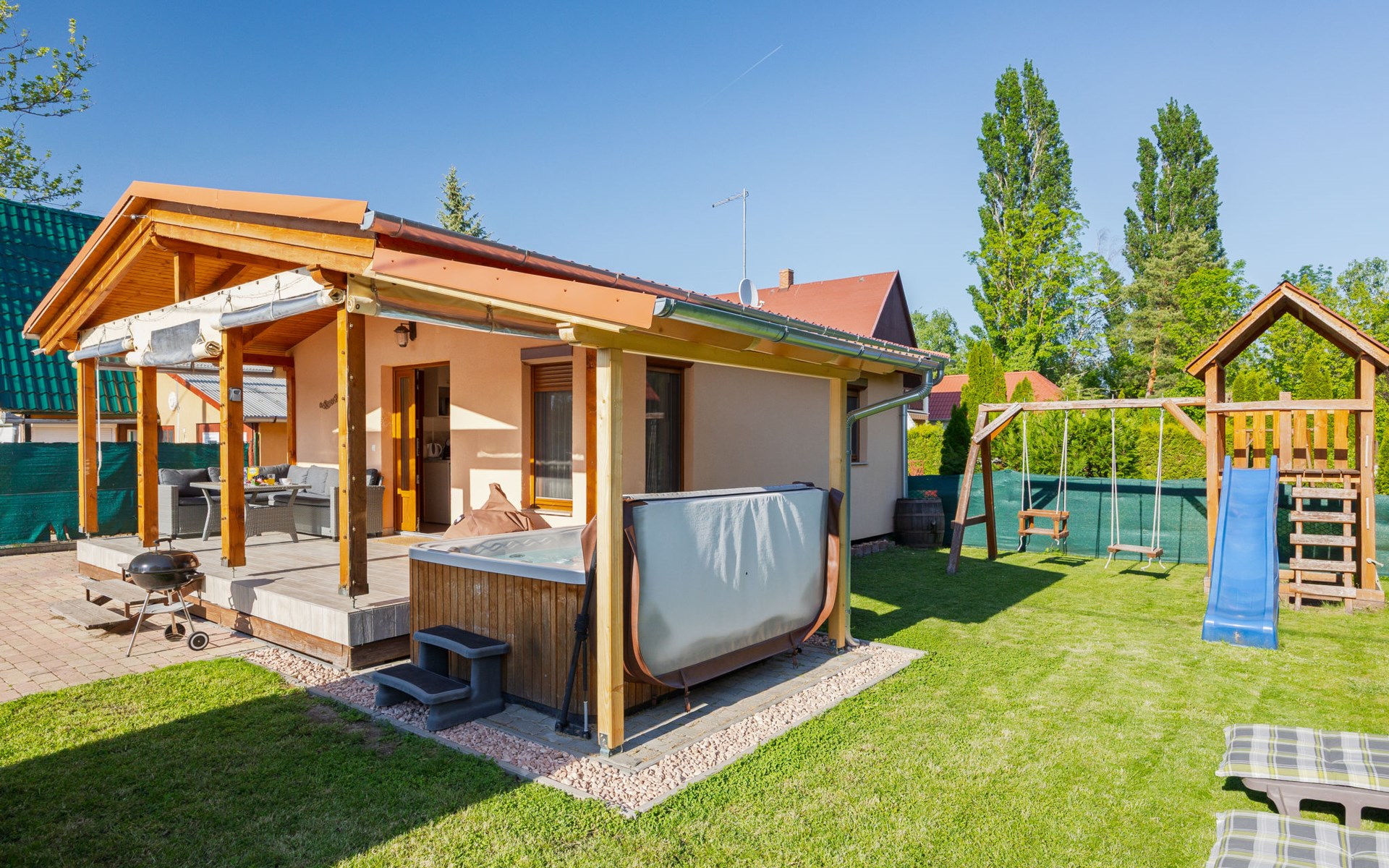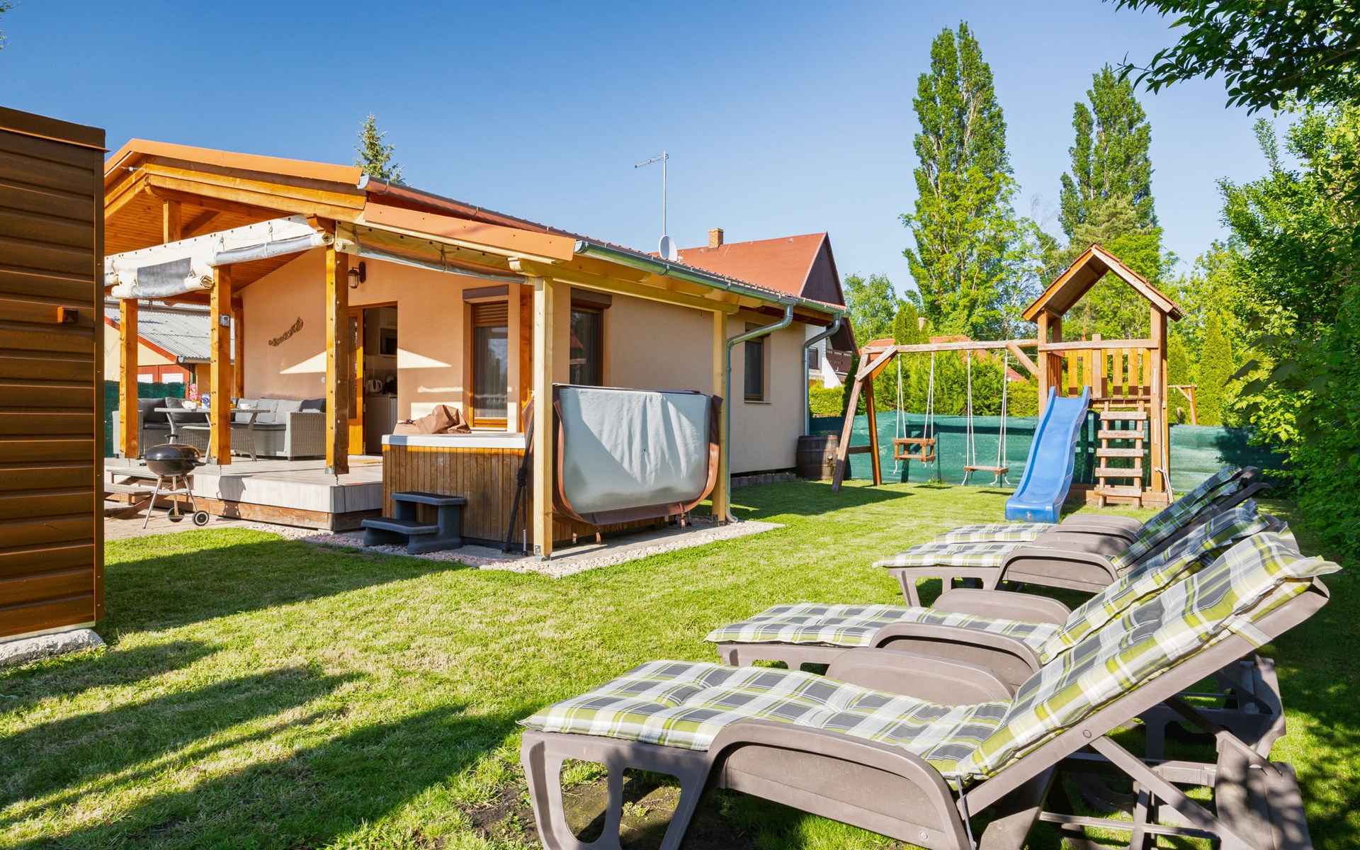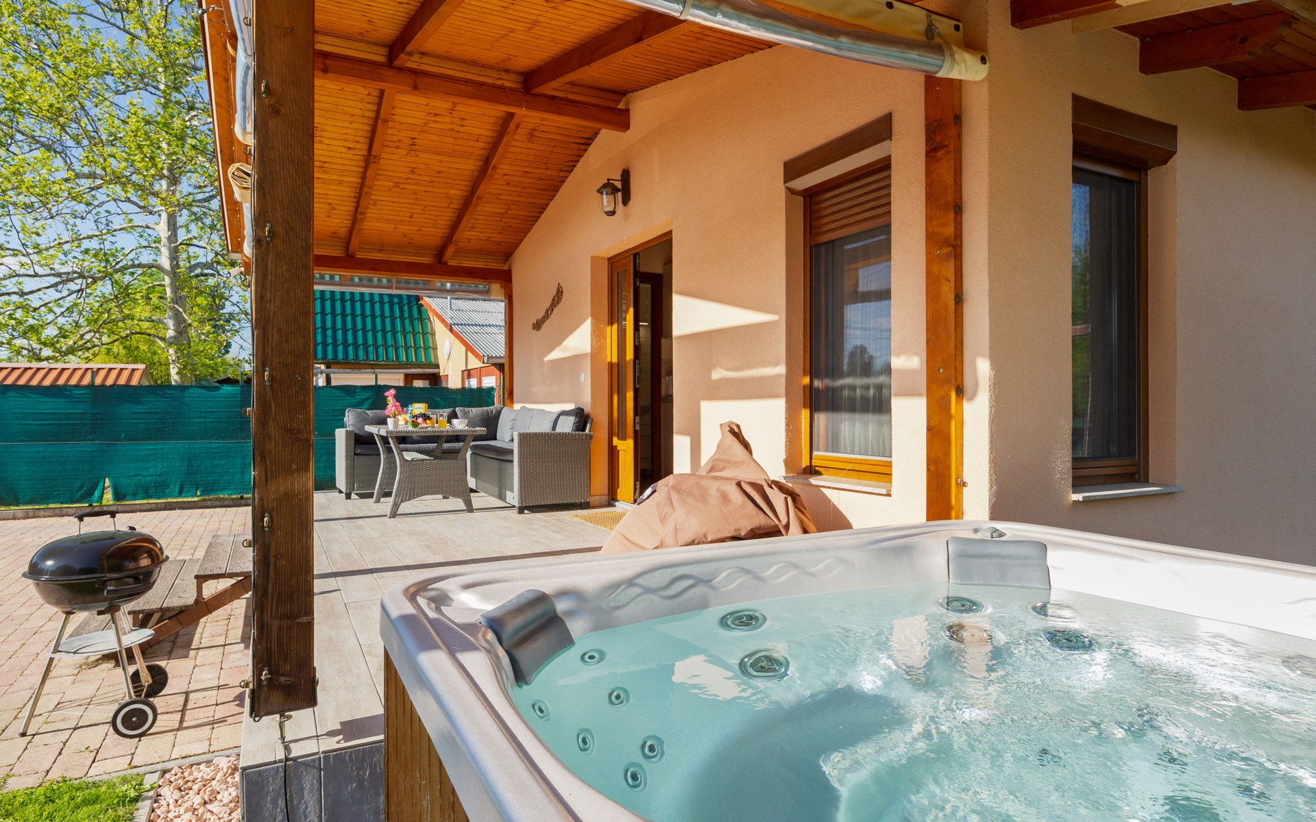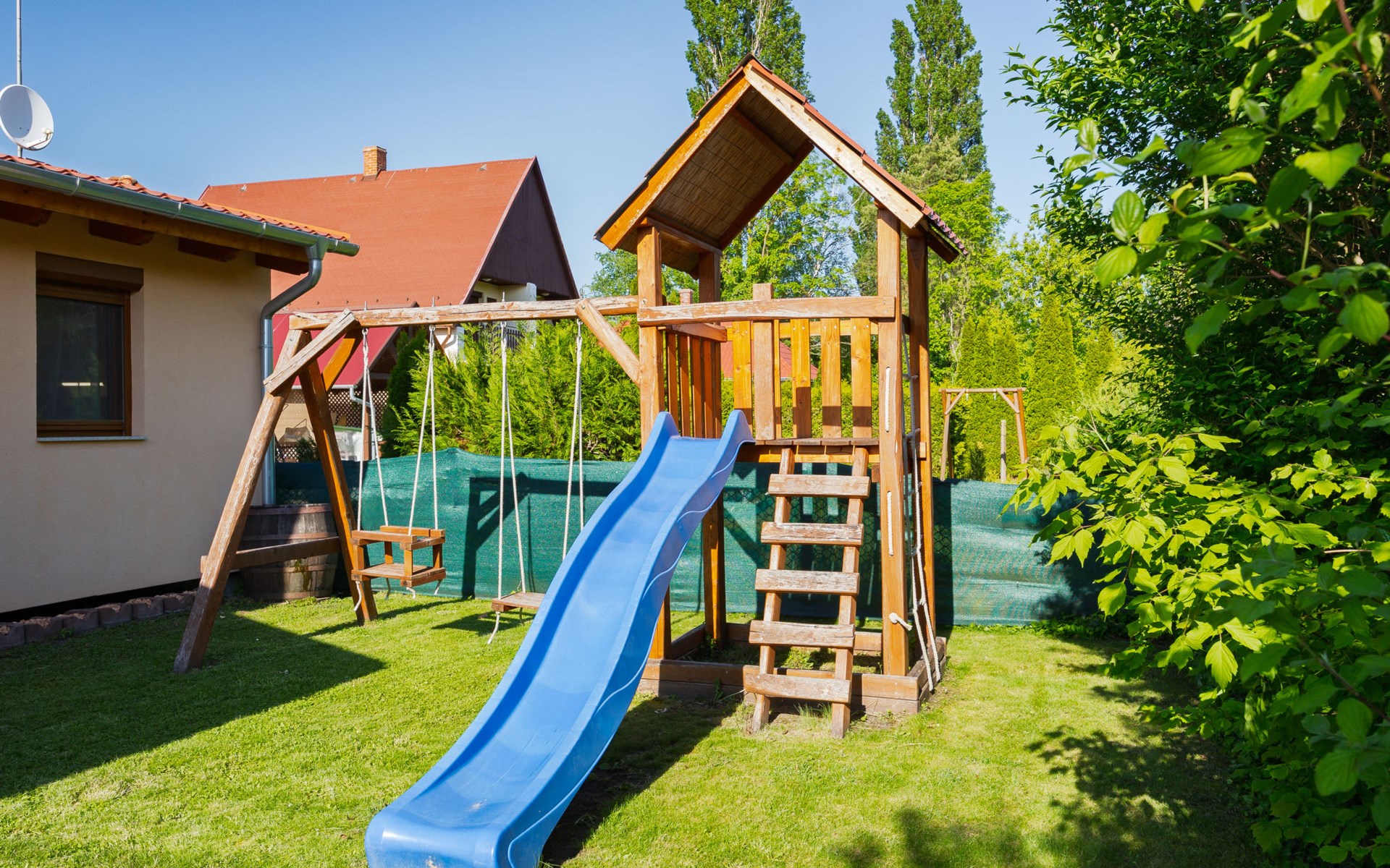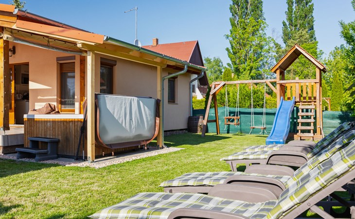 Balatonmáriafürdő 20 km van Balatonboglár: Klein, gezellig huis "Hullám". Rustige, zonnige ligging, 350 m van het meer, 700 m van het strand, op het zuidwesten. Voor alleengebruik: terrein (omheind), ligweide. Hot tub, kinderspeelplaats (glijbaan, schommel). In het huis: Internet (WiFi), centrale verwarming, air-conditioning. Parkeerplaats (voor 2 auto's) op het terrein. Levensmiddelenwinkel 1.5 km, supermarkt 4 km, restaurant 550 m, fietsverhuur 4 km, treinstation 500 m, grasstrand 700 m, thermaalbad "Hévíz" 29 km. Tennis 4 km, fietspad 50 m, kinderspeelplaats 700 m. Attracties in de buurt: Balatonlelle Giant Wheel 28 km, Kis-Balaton Visitor Center 18 km, Kereki Dino Park 49 km, Festetics Castle 24 km, Kristinus Wine Estate 12 km, Bobo Fun Park 29 km. Spoorweg in de buurt 80 m van het huis.