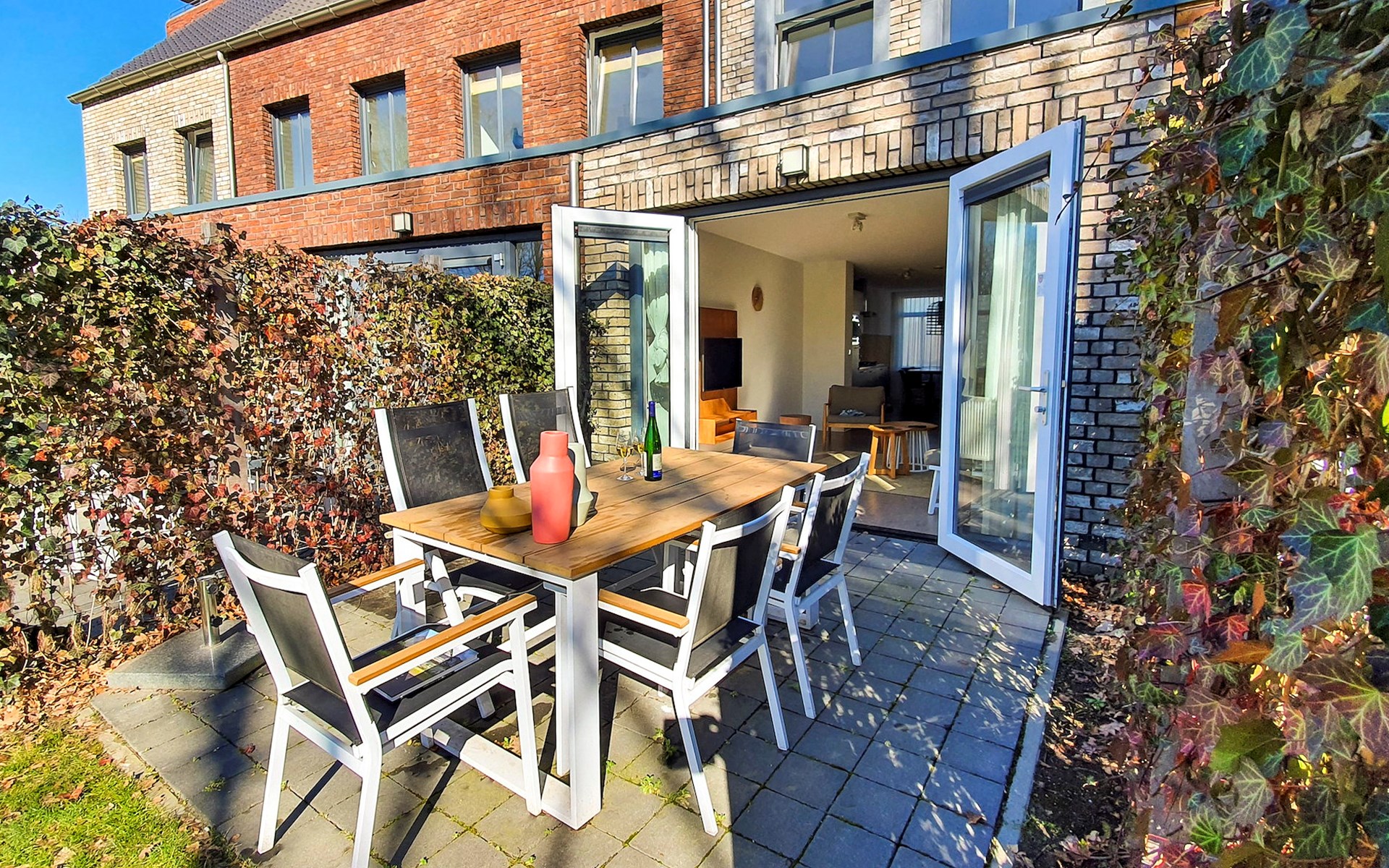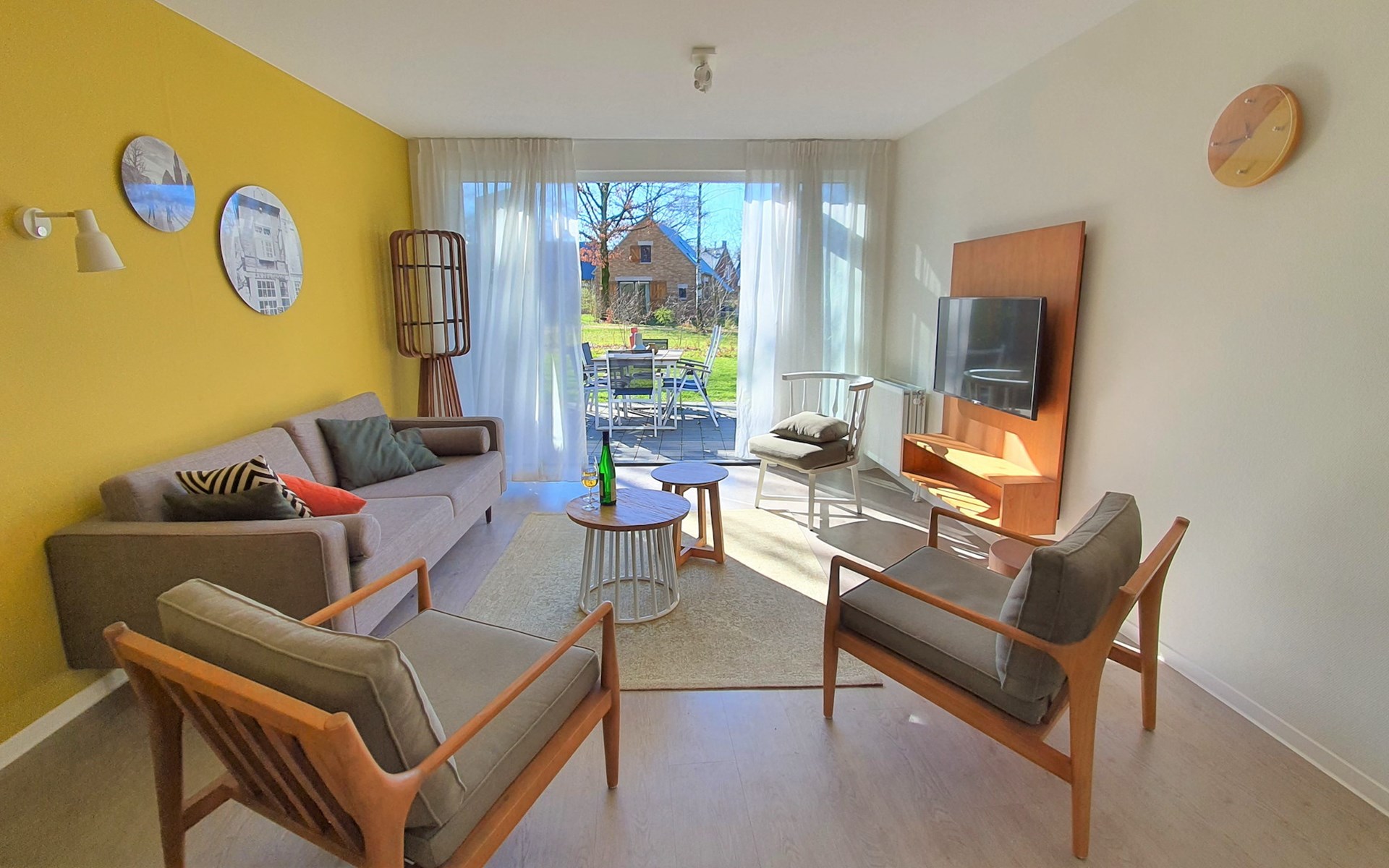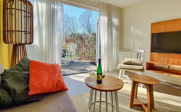 Er is een zeer ruime tuingerichte woonkamer met zithoek, een open keuken met luxe apparatuur en eethoek. De tuin heeft een terras op het zuiden, die je bereikt via de openslaande deuren in de woonkamer.