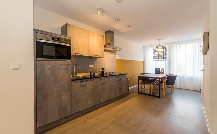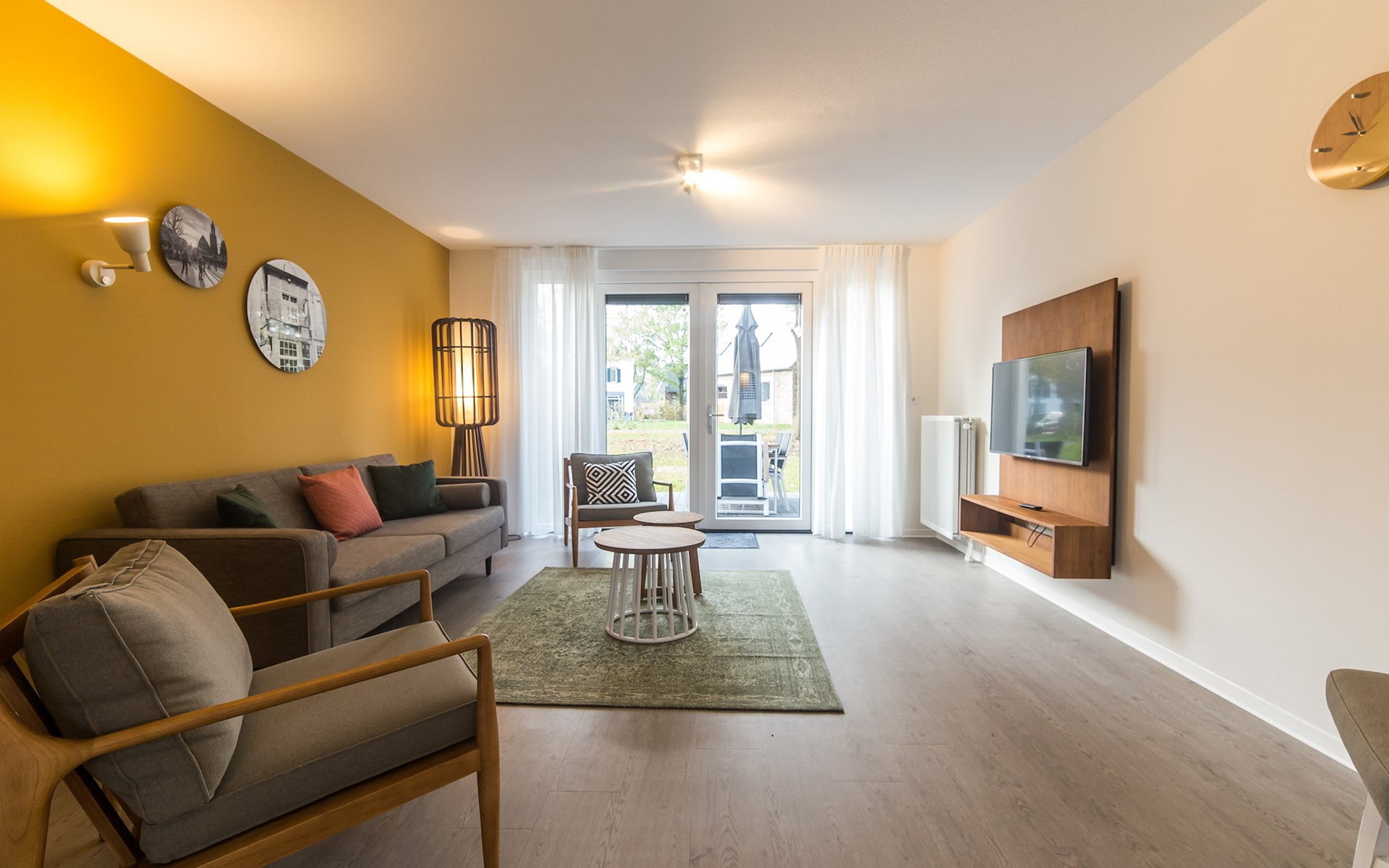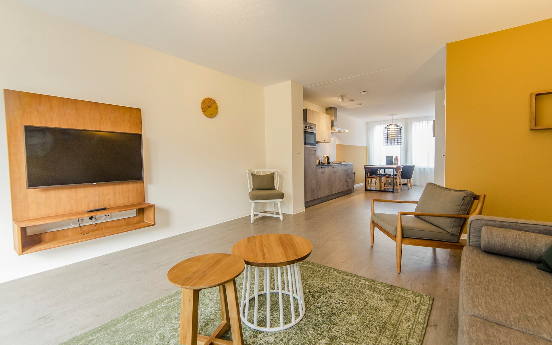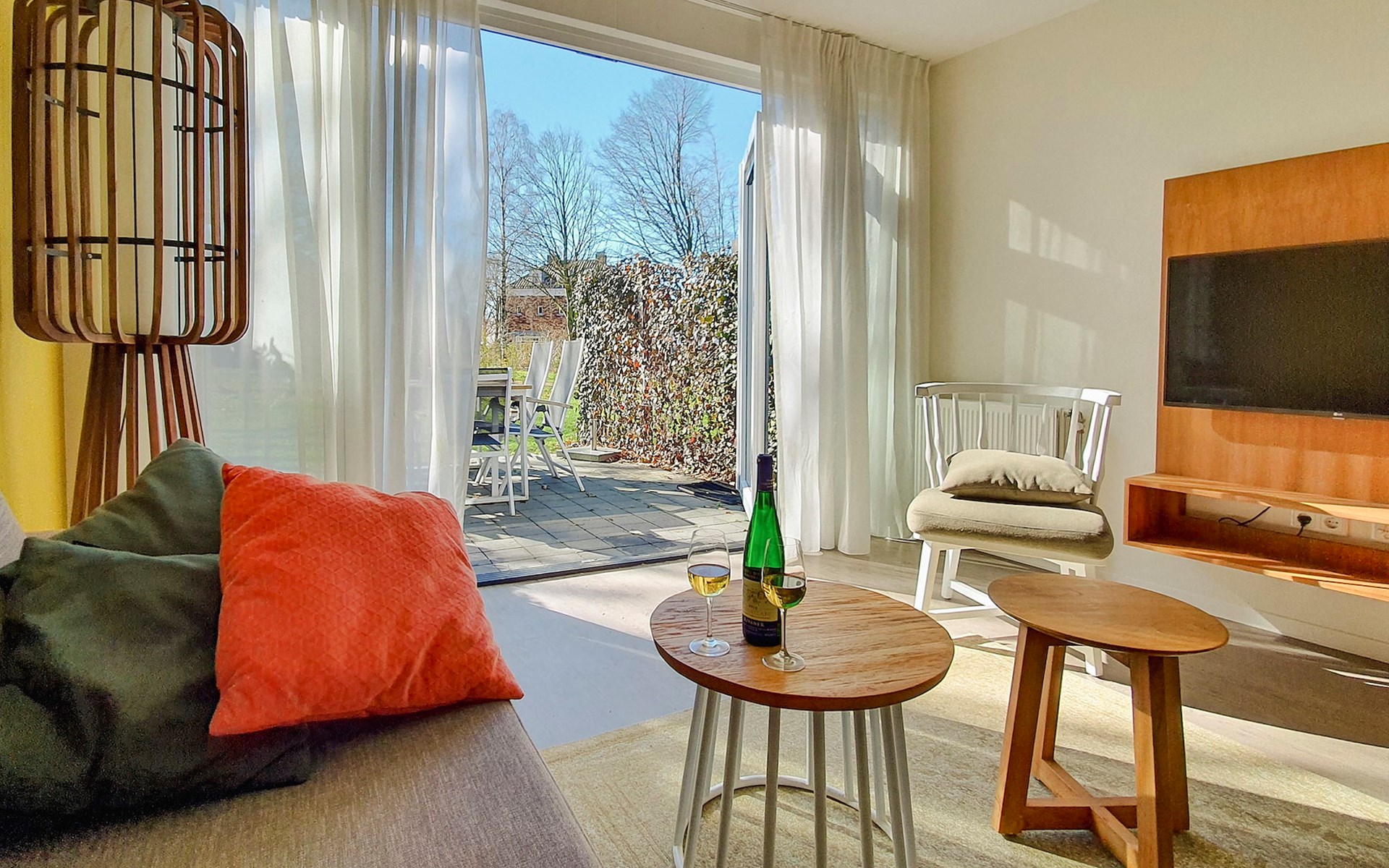 Er is een zeer ruime tuingerichte woonkamer met zithoek, een open keuken met luxe apparatuur en eethoek. De tuin heeft een terras op het zuiden, die je bereikt via de openslaande deuren in de woonkamer.