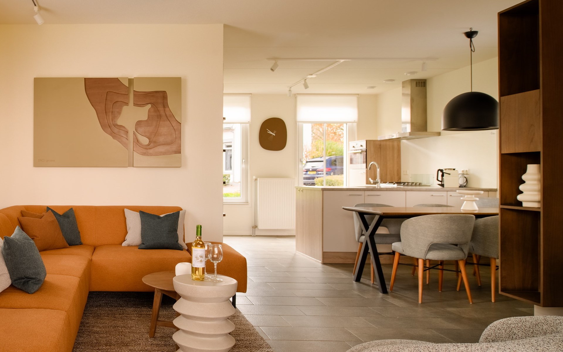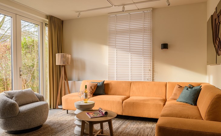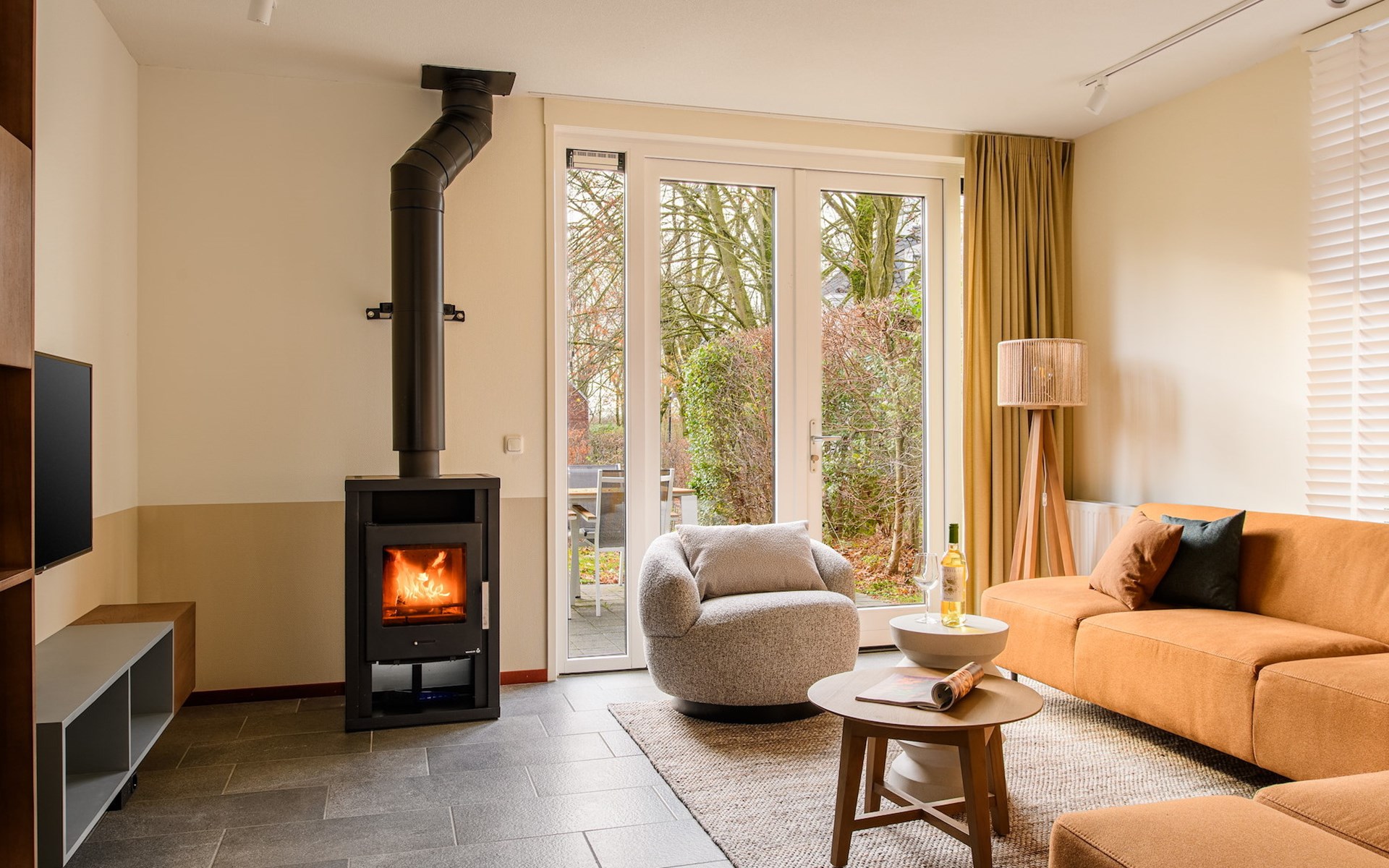 De woonkamer is voorzien van een zithoek met een open haard en televisie. Daarnaast is er een eethoek met eettafel. De luxe keuken is van alle gemakken voorzien met onder andere een koelkast, combi-oven, vaatwasser, waterkoker, kookplaat, broodrooster en een Nespresso apparaat. Via de openslaande deuren bereik je vanuit de woonkamer de tuin met een gemeubileerd terras.