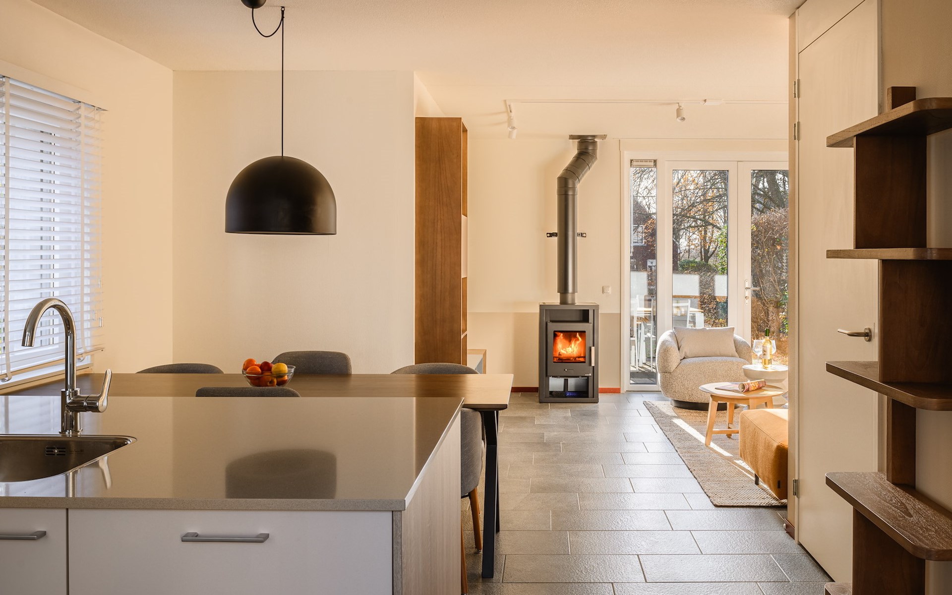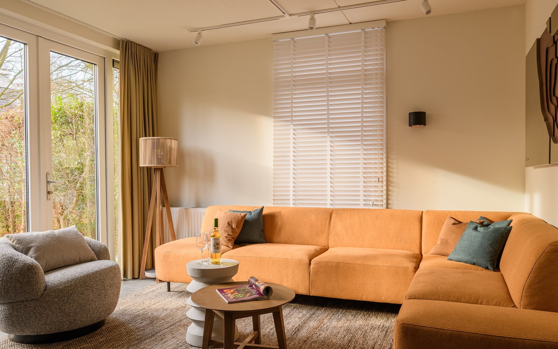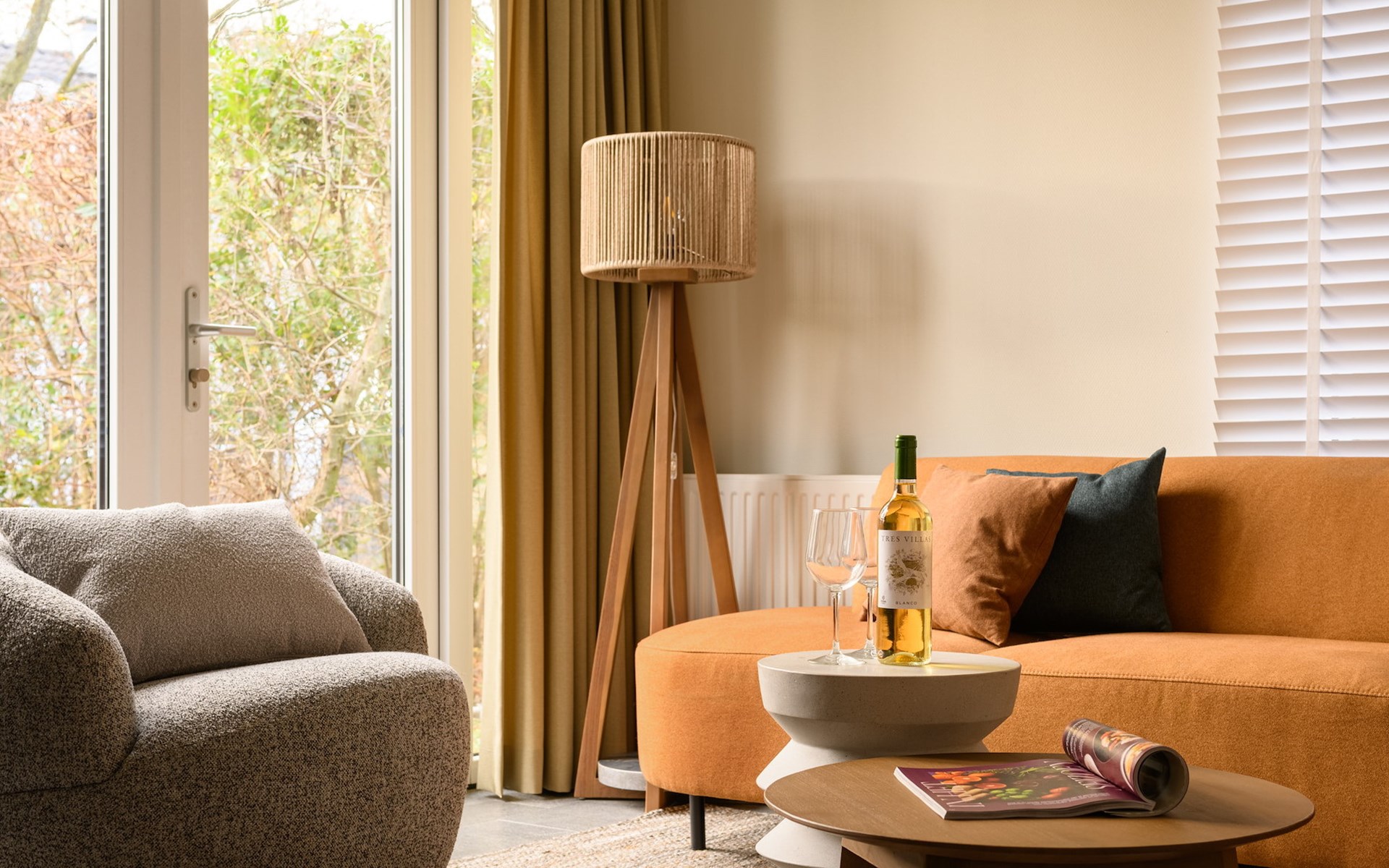 De woonkamer is voorzien van een zithoek met een open haard en televisie. Daarnaast is er een eethoek met eettafel. De luxe keuken is van alle gemakken voorzien met onder andere een koelkast, combi-oven, vaatwasser, waterkoker, kookplaat, broodrooster en een Nespresso apparaat. Via de openslaande deuren bereik je vanuit de woonkamer de tuin met een gemeubileerd terras.