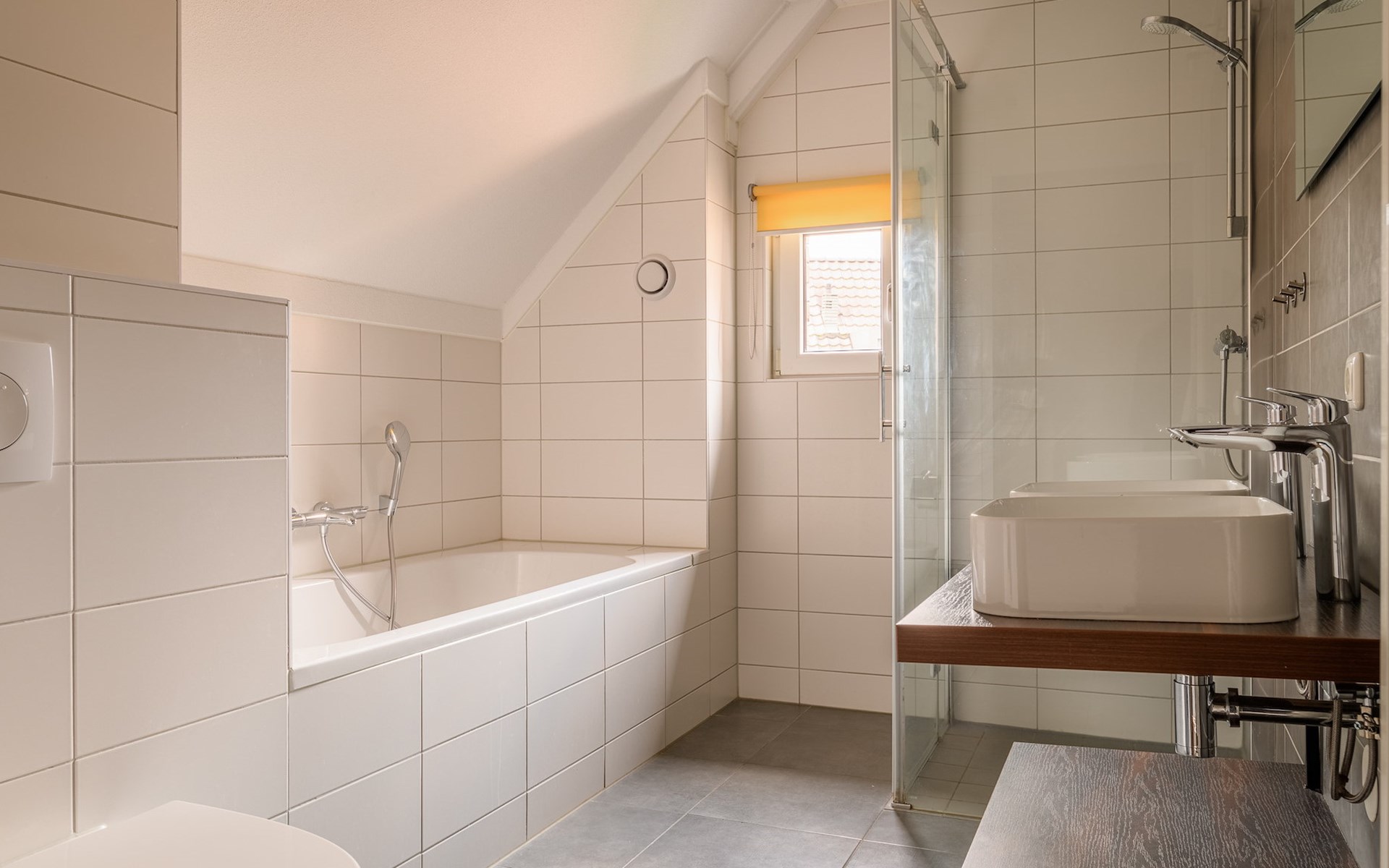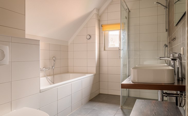 Op de eerste verdieping zijn er 3 slaapkamers met 2 éénpersoonsbedden aanwezig. De badkamer is voorzien van een ligbad, douche, wastafel en toilet. Daarnaast is er in de woning een separaat toilet en een berging.