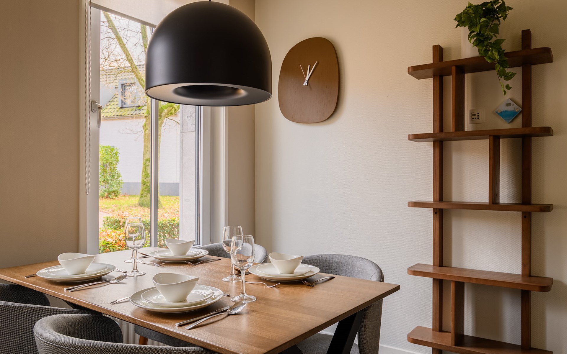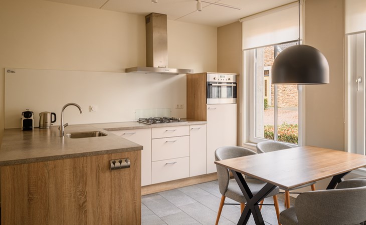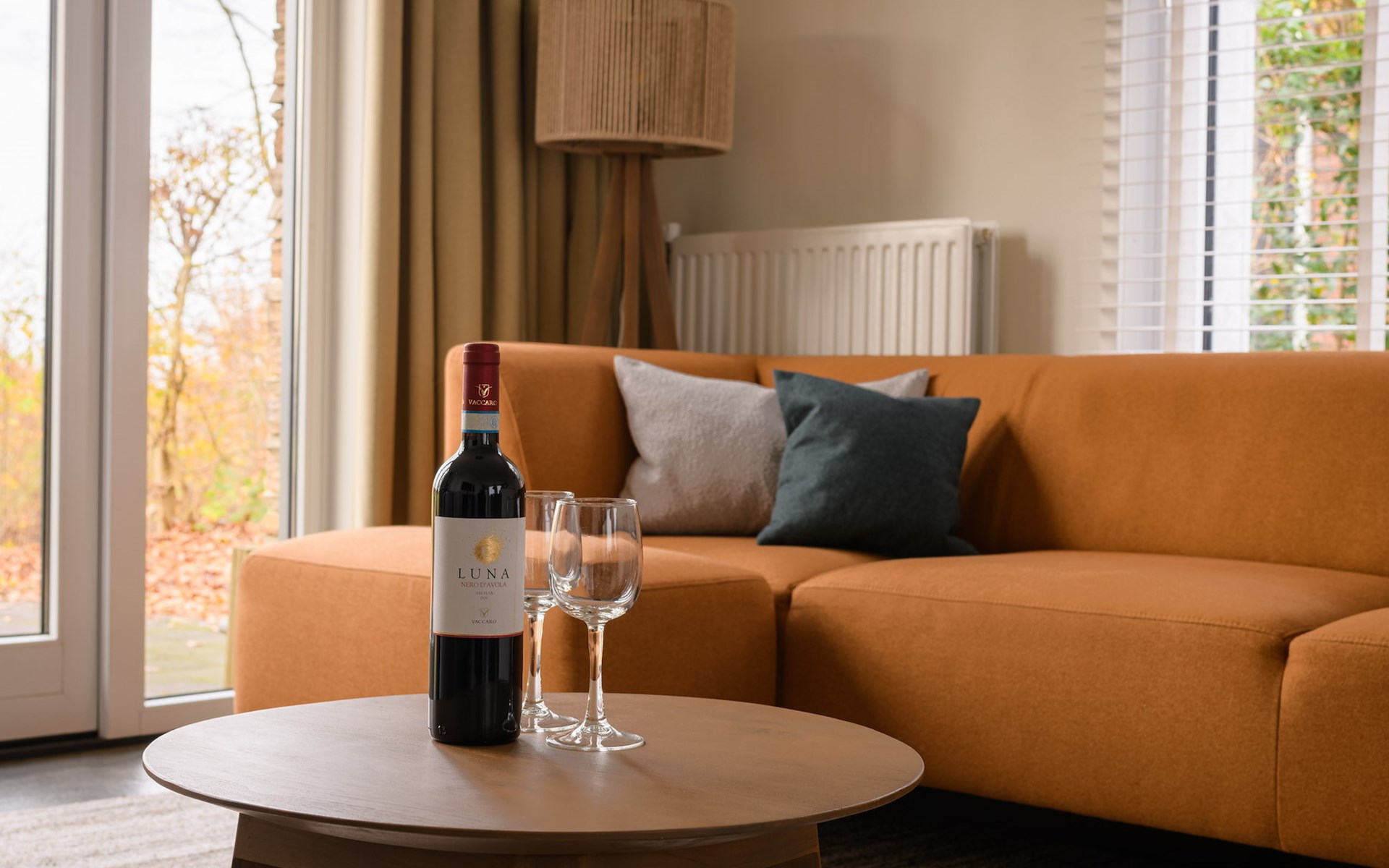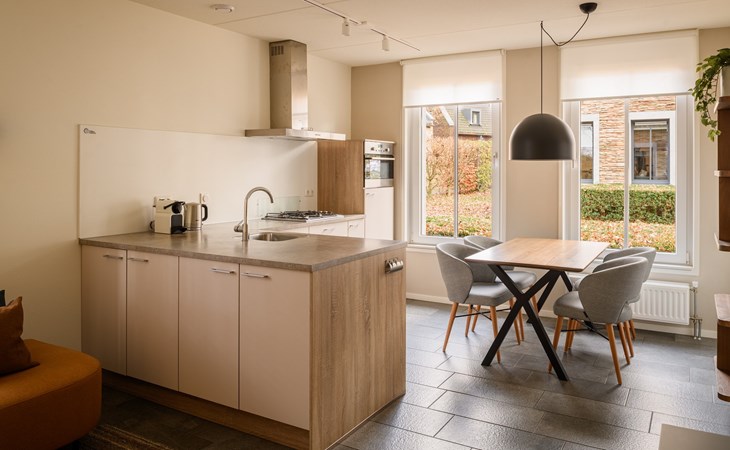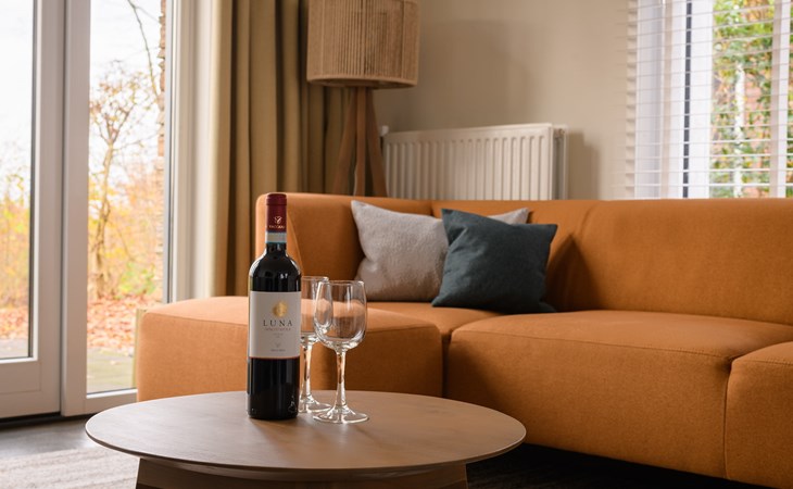 De royale woonkamer is voorzien van een gezellige zithoek met open haard en televisie. Daarnaast is er een eetgedeelte met eettafel. De luxe keuken is compleet uitgerust met onder andere een koelkast, combi-oven, vaatwasser, waterkoker, kookplaat, broodrooster en een Nespresso apparaat. Via de openslaande deuren kom je vanuit de woonkamer op een gezellig, gemeubileerd terras.