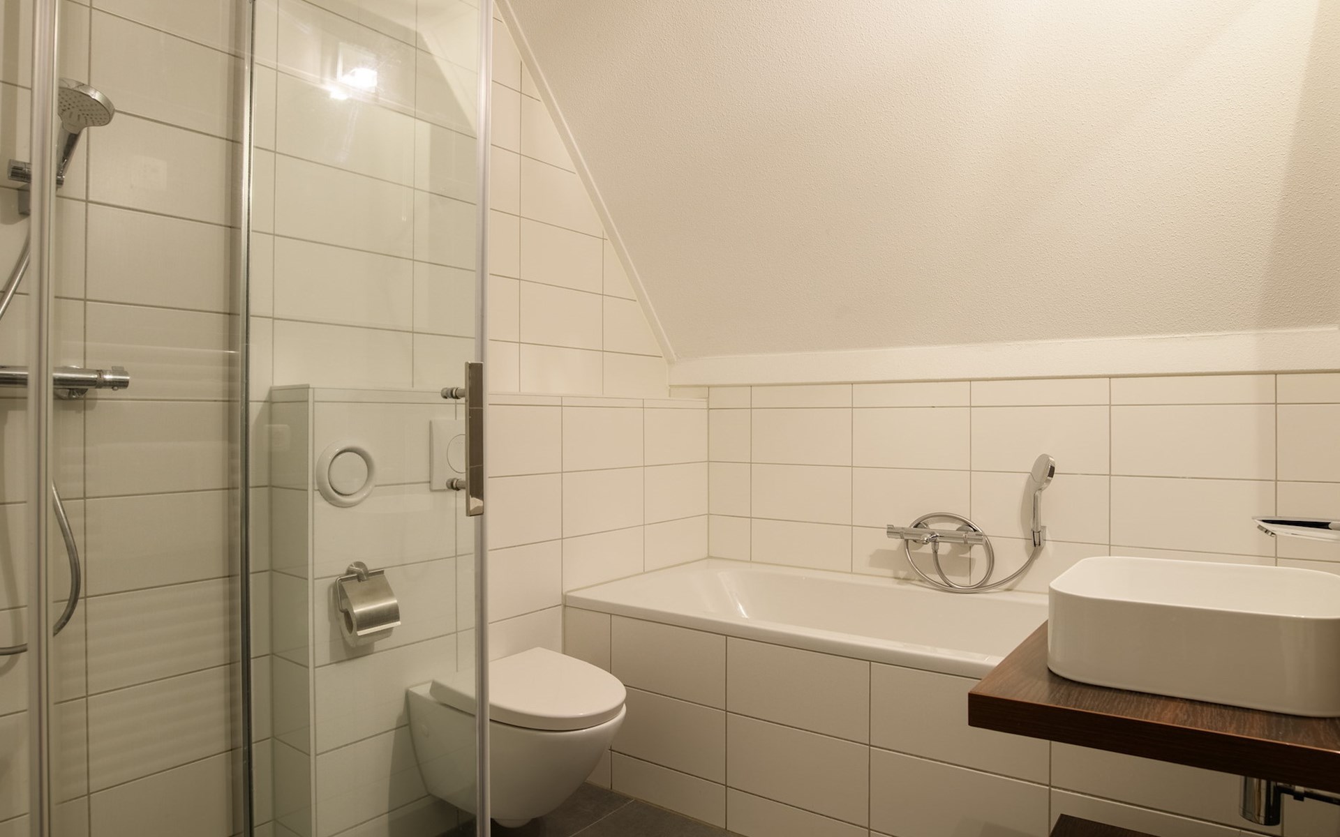 Op de eerste verdieping zijn er 2 slaapkamers met 2 éénpersoonsbedden. De badkamer is voorzien van een ligbad, douche, wastafel en toilet. Er is ook een separaat toilet aanwezig.