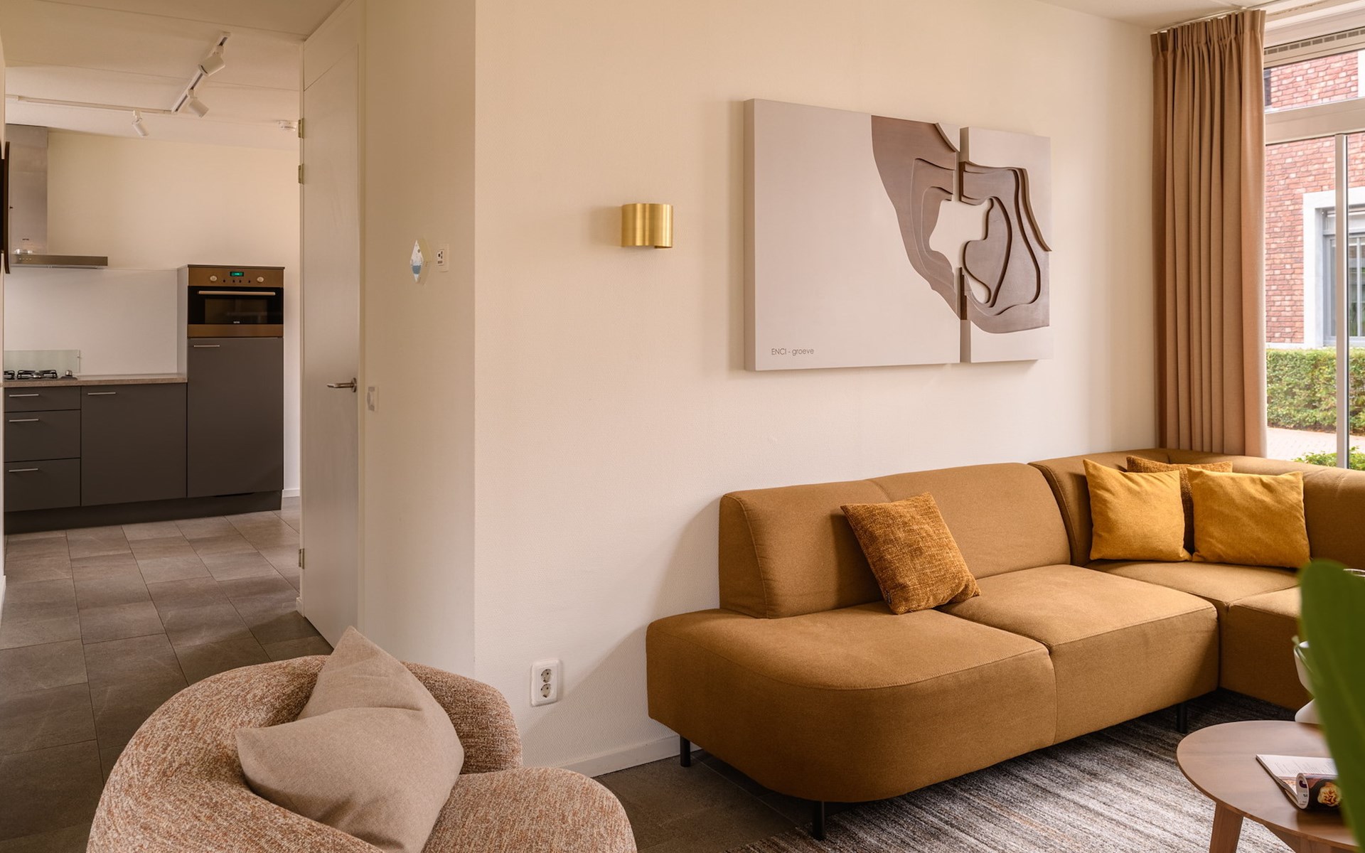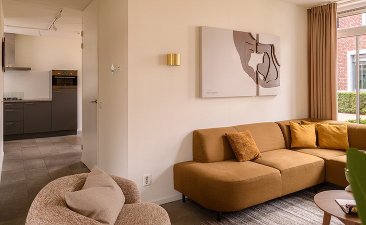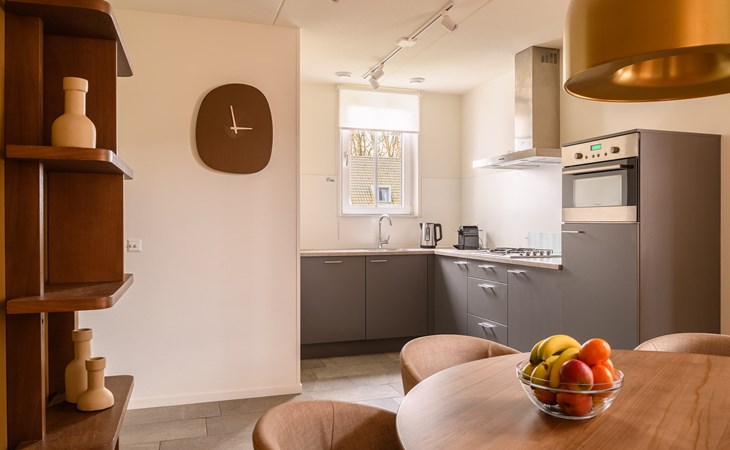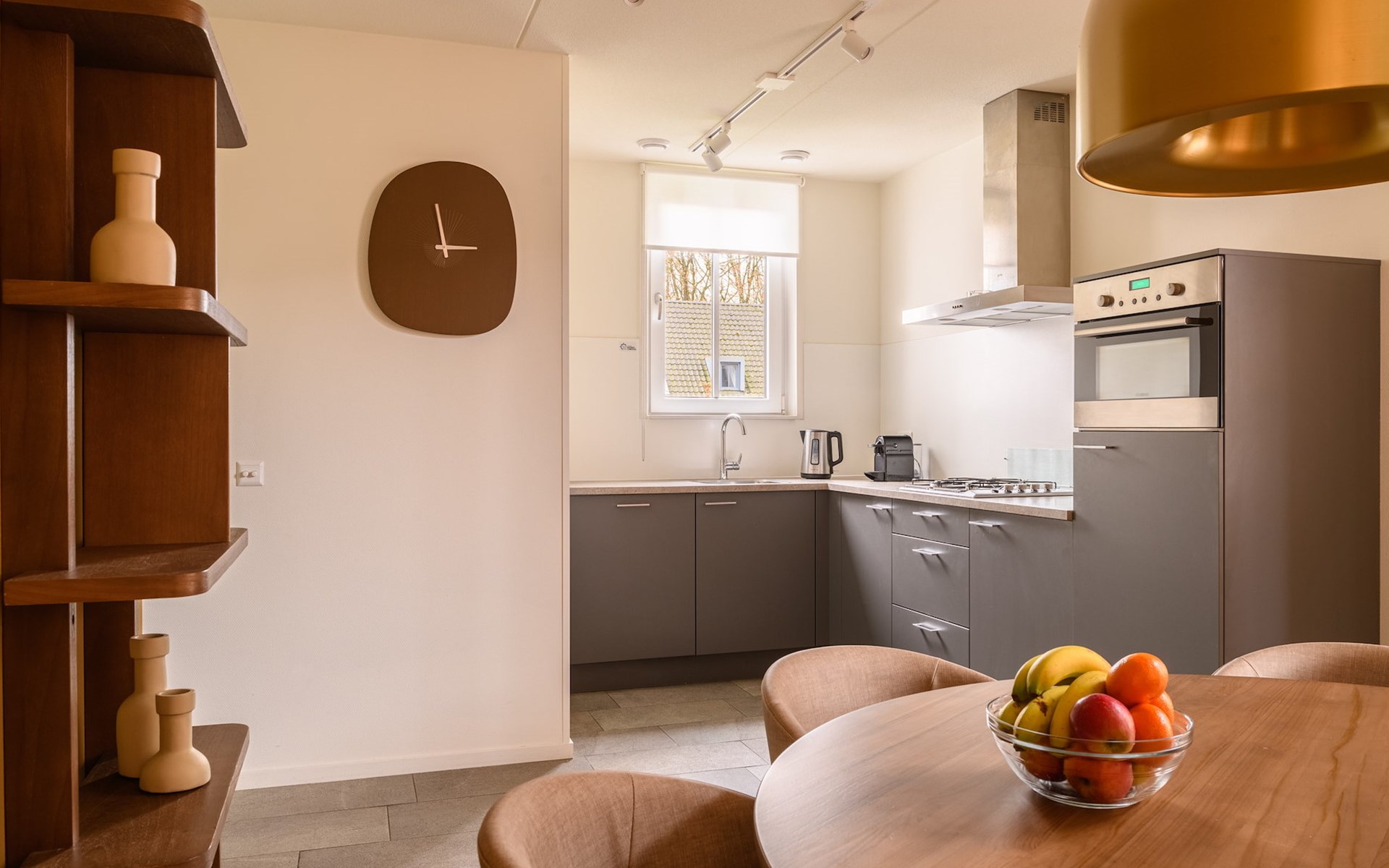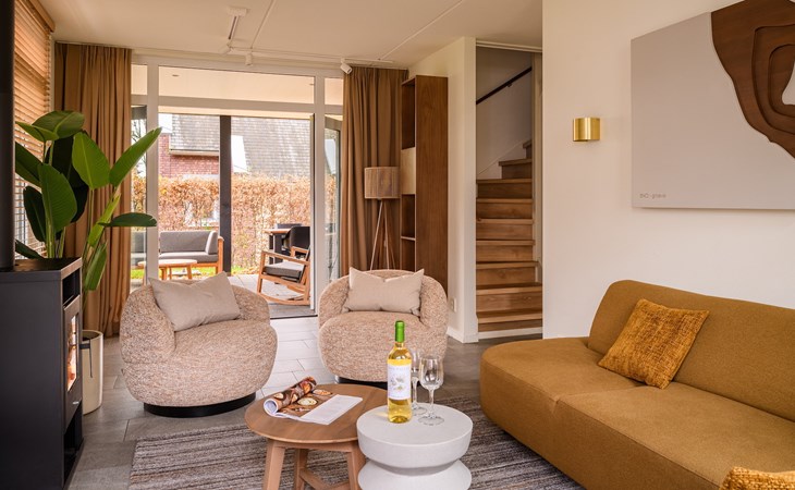 De royale woonkamer heeft een sfeervolle zithoek met een vrijstaande houtkachel en televisie. Daarnaast is er een eethoek met eettafel. De luxe keuken is volledig uitgerust met onder andere een koelkast, magnetron, vaatwasser, waterkoker, oven, kookplaat, broodrooster en een Nespresso apparaat.