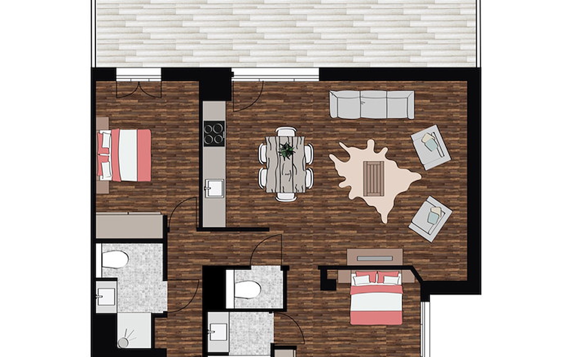 In het penthouse heb je de beschikking over 2 slaapkamers met 2 aparte éénpersoonsbedden (enkele appartementen hebben een tweepersoonsbed in één van de slaapkamers). Er zijn 2 badkamers aanwezig waarvan één met douche, wastafel en toilet en één met ligbad, wastafel en toilet.