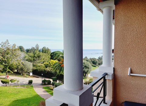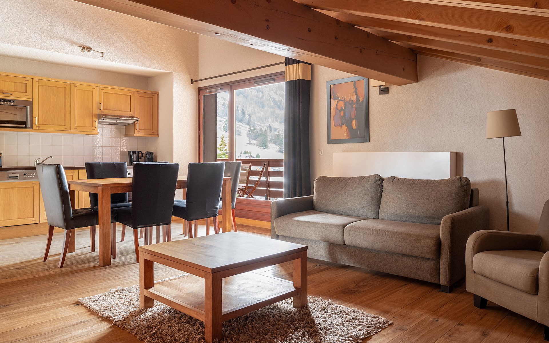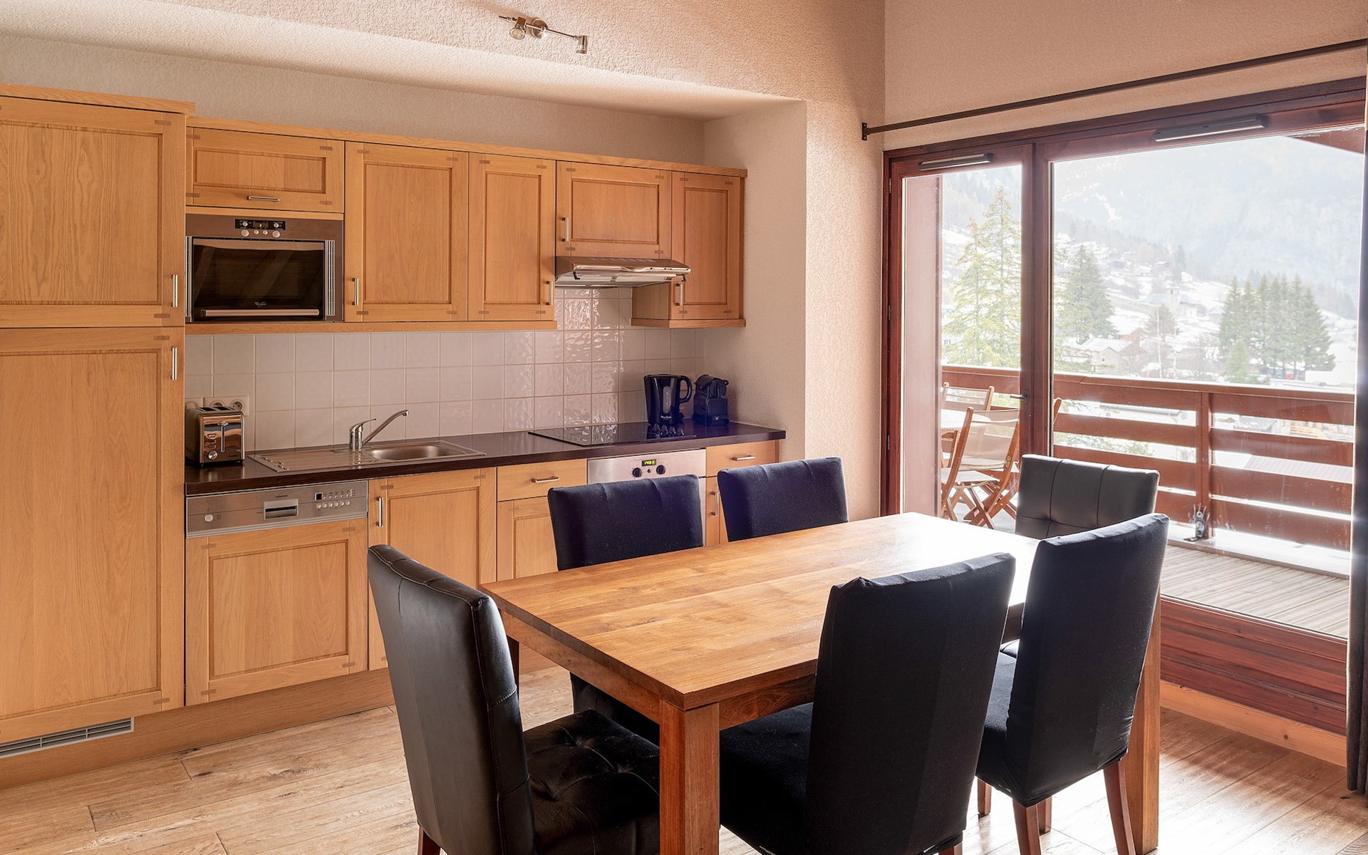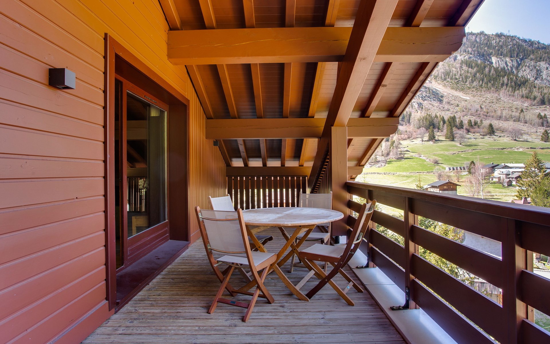 Op het royale, gemeubileerde balkon, bereikbaar via de woonkamer en één van de slaapkamers, heb je een fantastisch zicht op de omliggende bergmassieven.