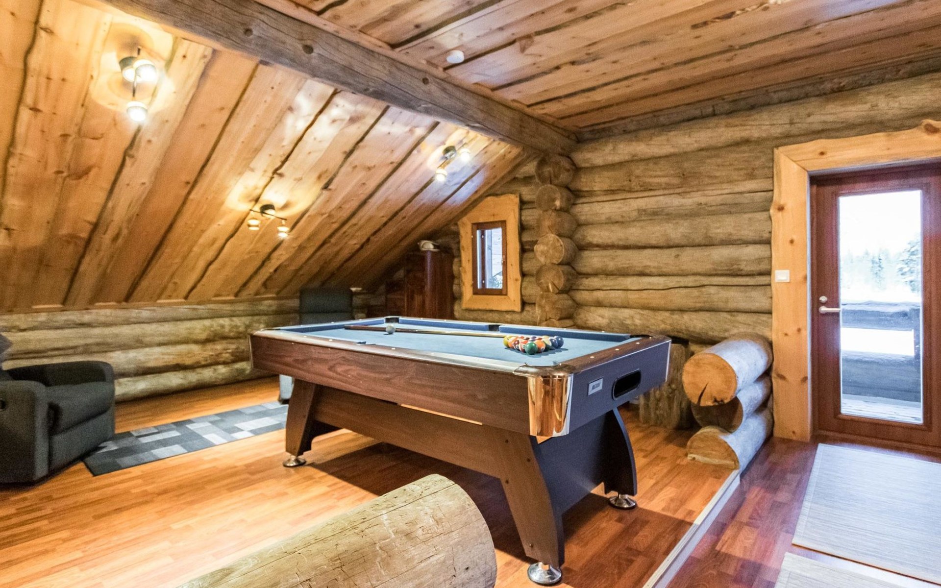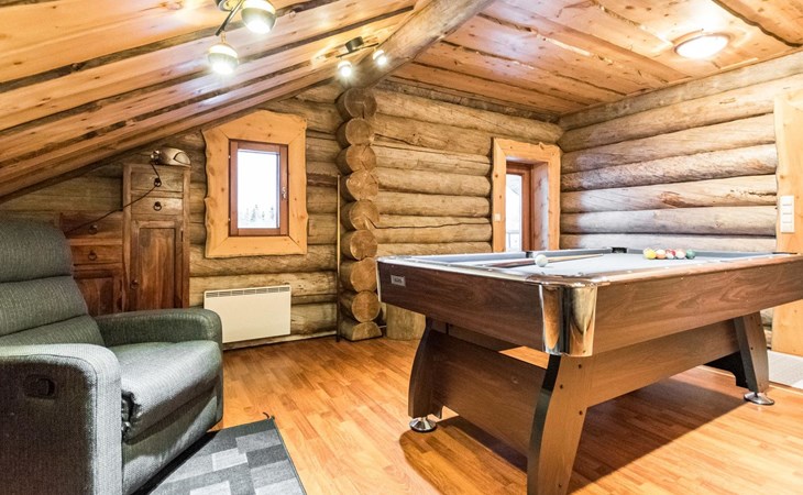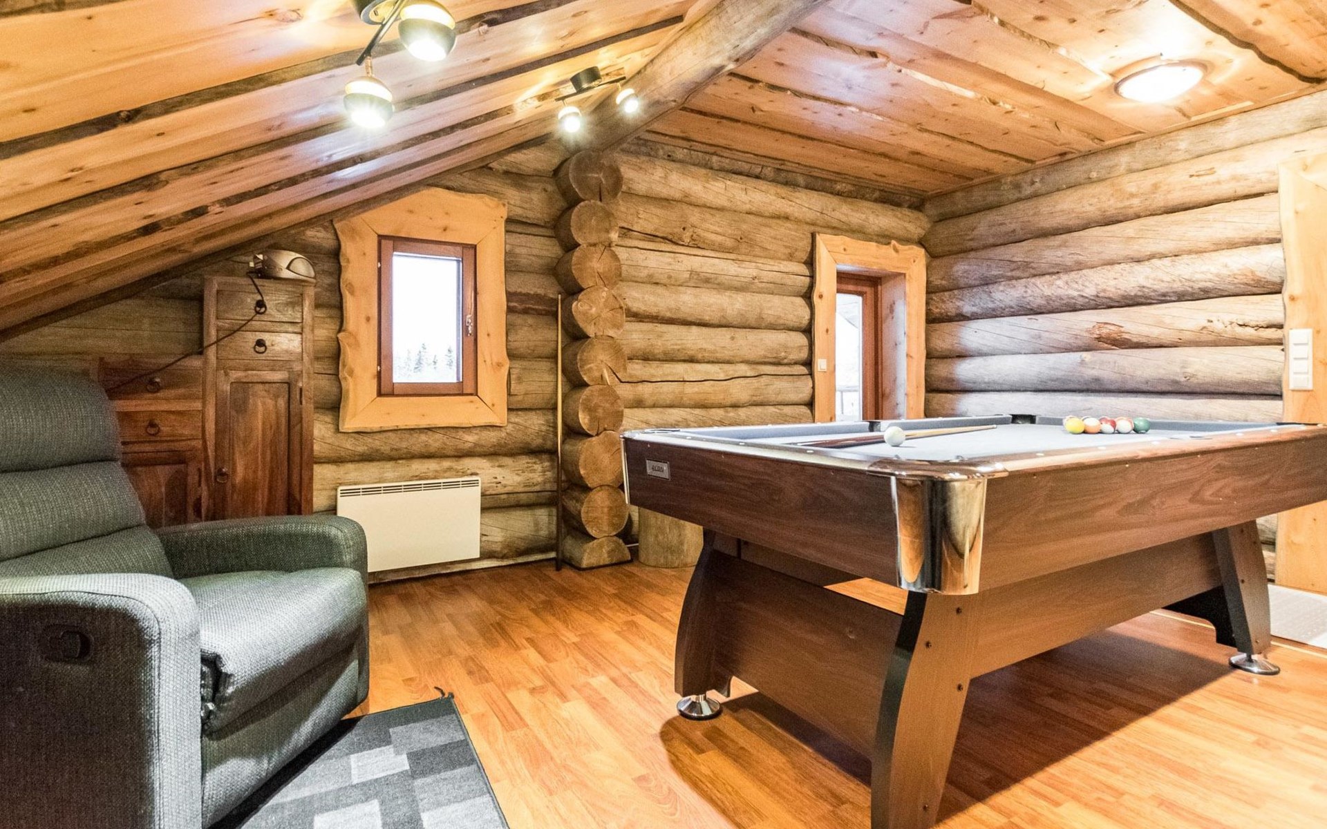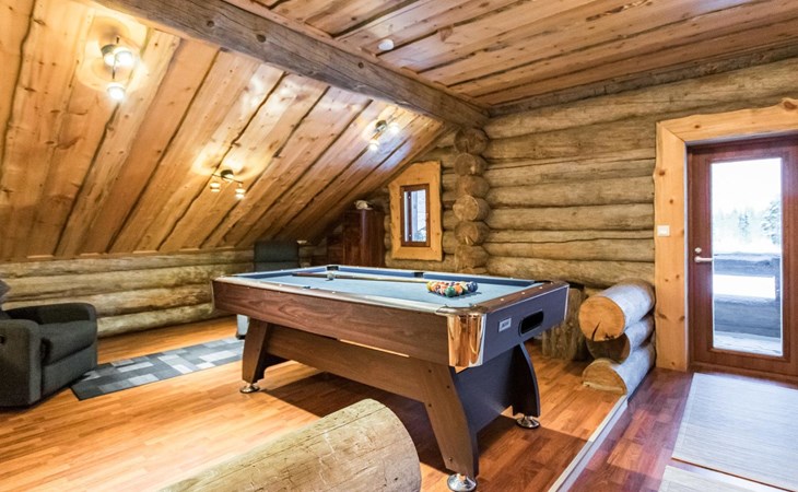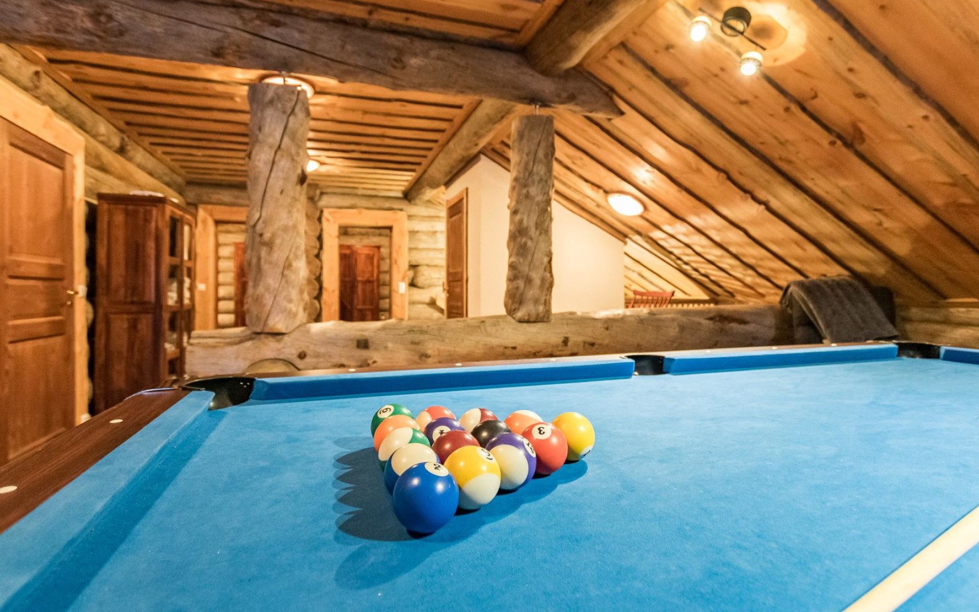 Upstairs in the lobby pool table, separate toilet, bedroom with double bed, bedroom 2 beds, bedroom 2 beds, a cot and a baby changing table, sleeping area with sofa bed for 2, balcony.