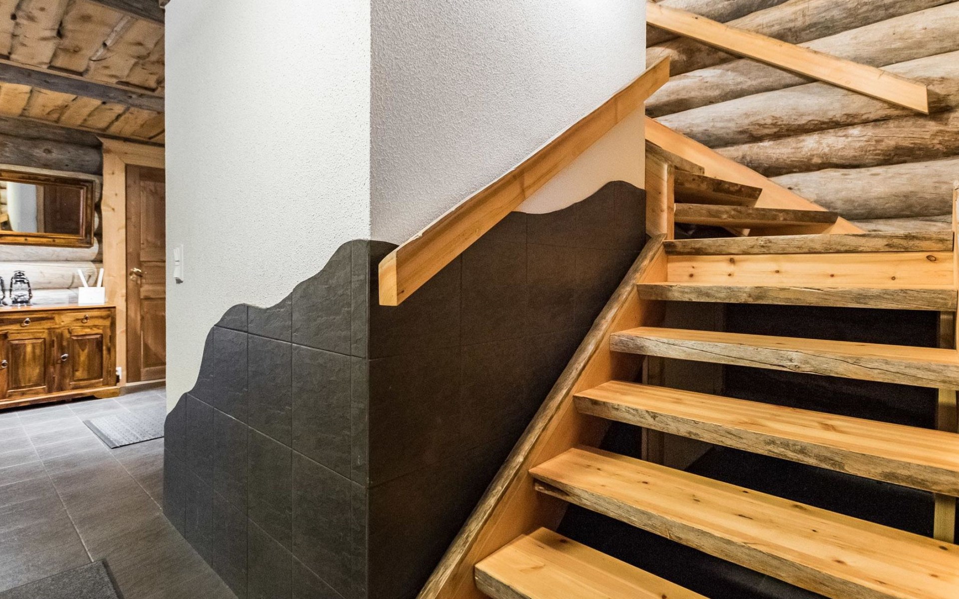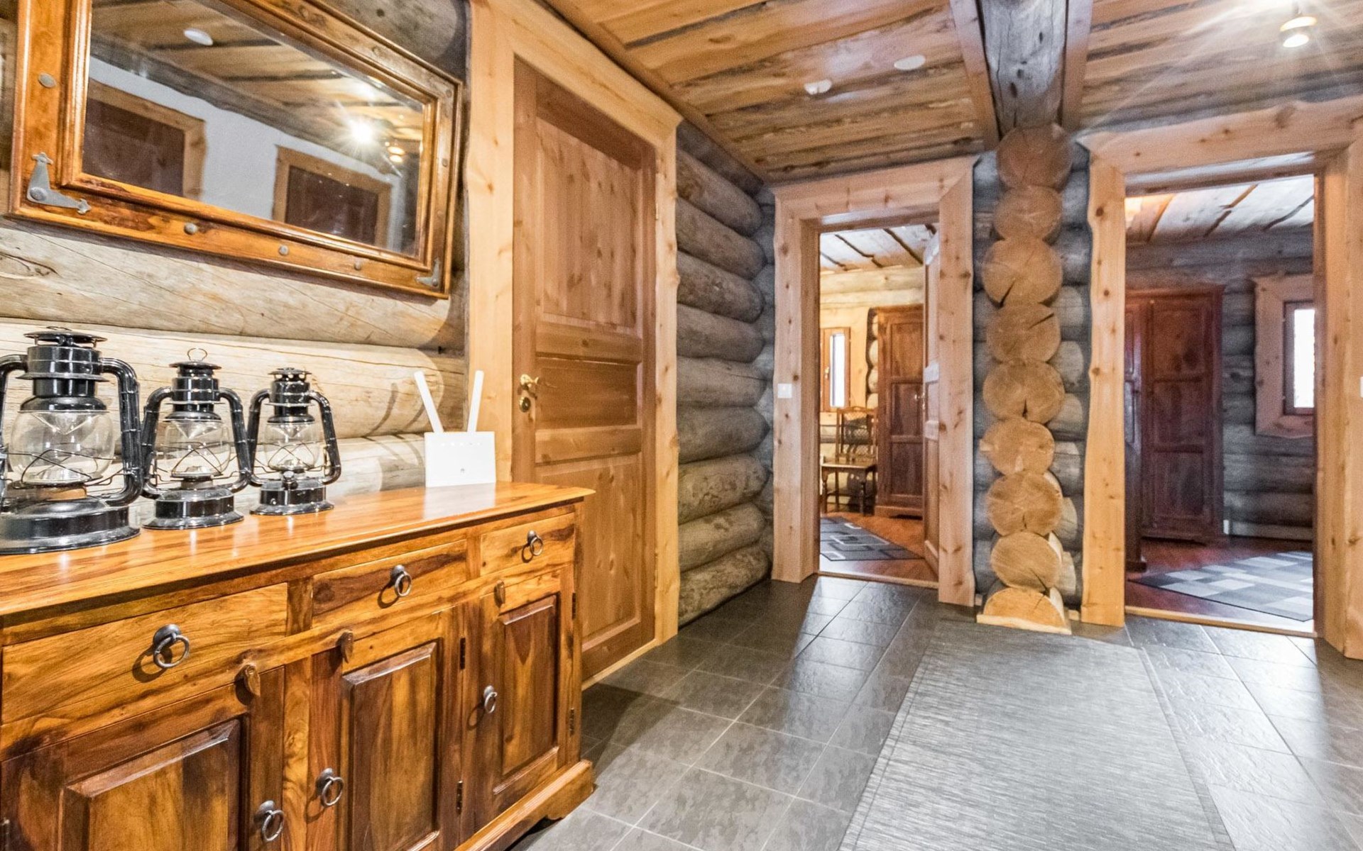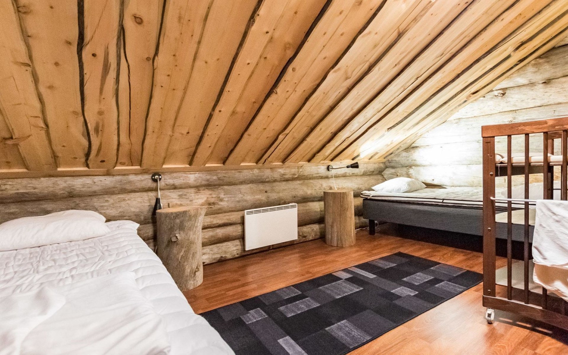 Upstairs in the lobby pool table, separate toilet, bedroom with double bed, bedroom 2 beds, bedroom 2 beds, a cot and a baby changing table, sleeping area with sofa bed for 2, balcony.