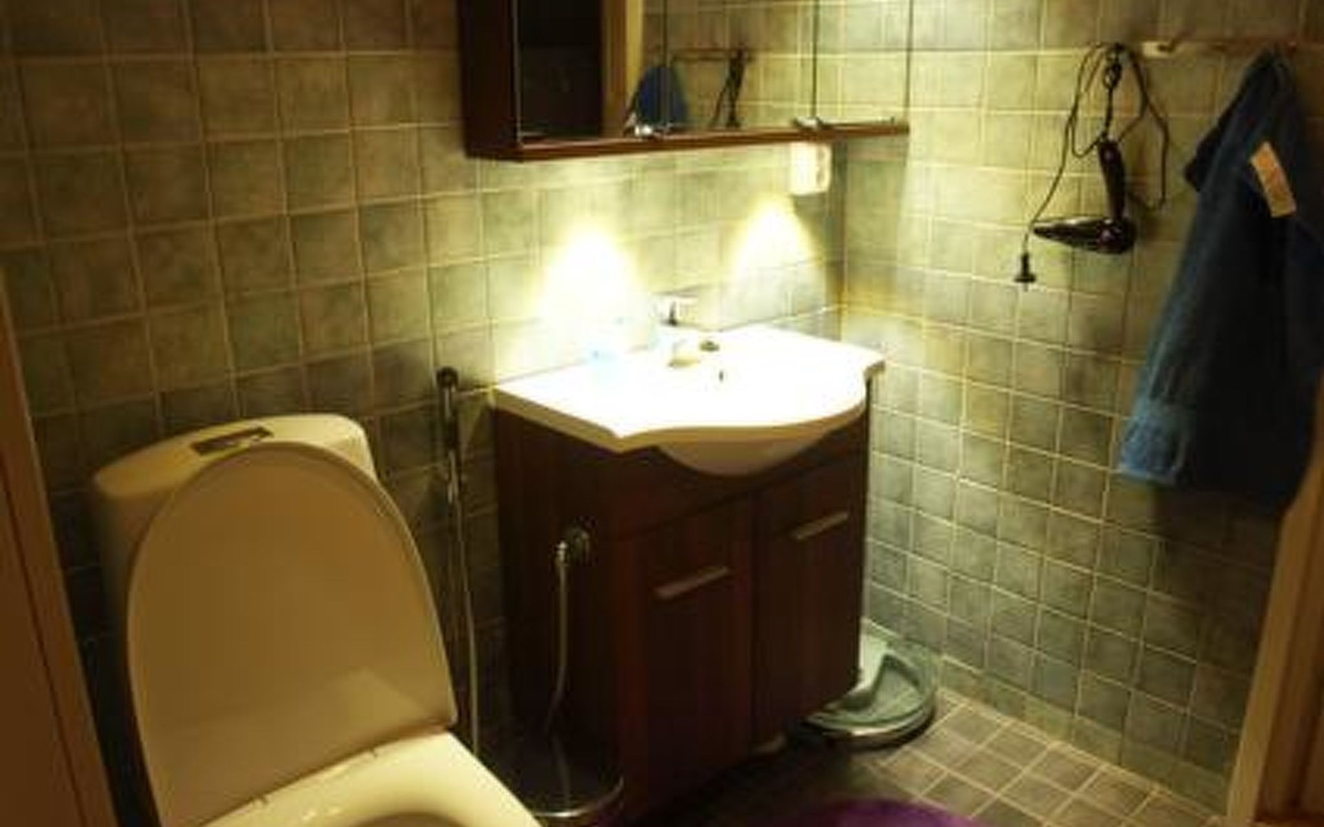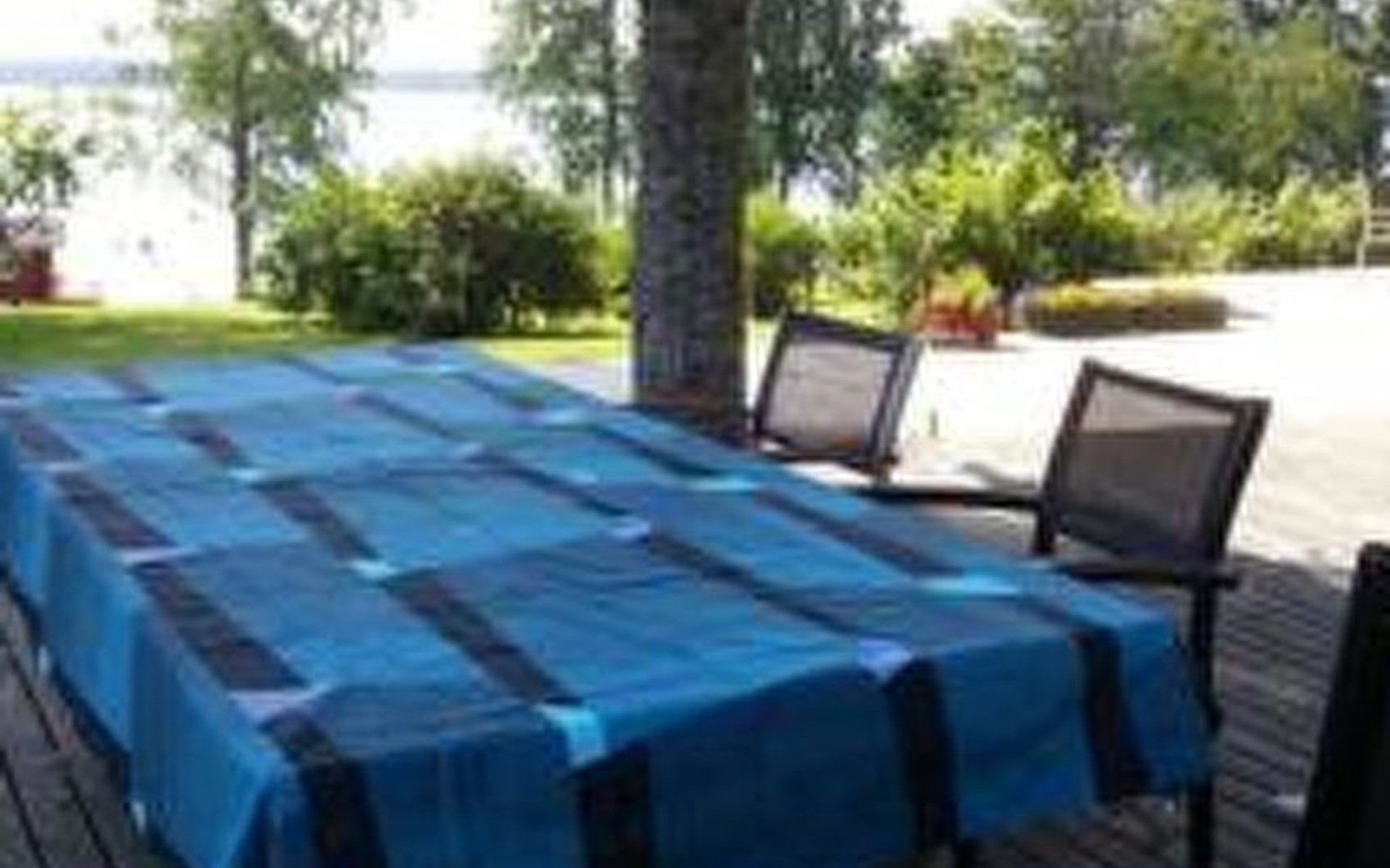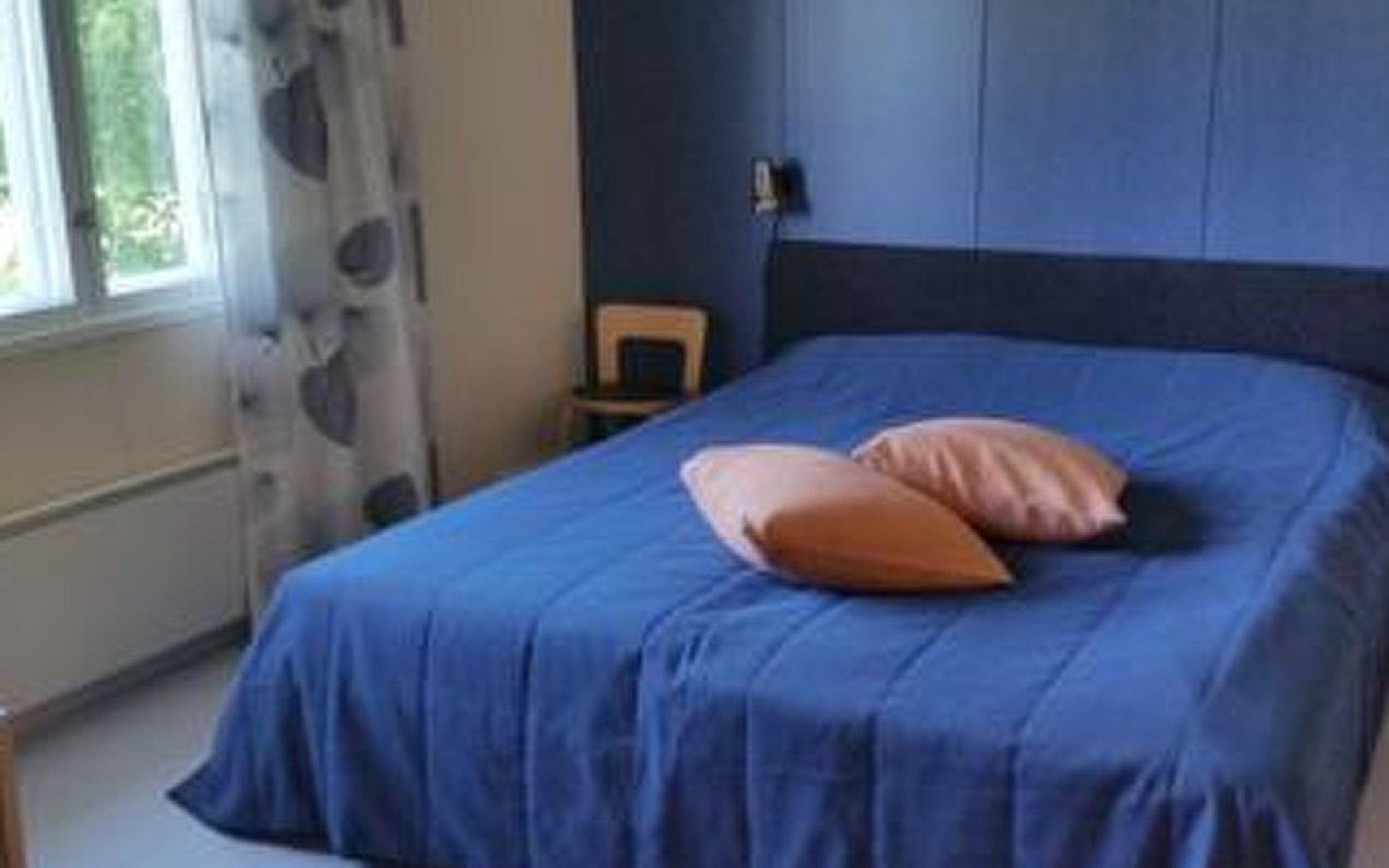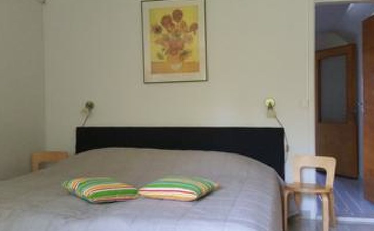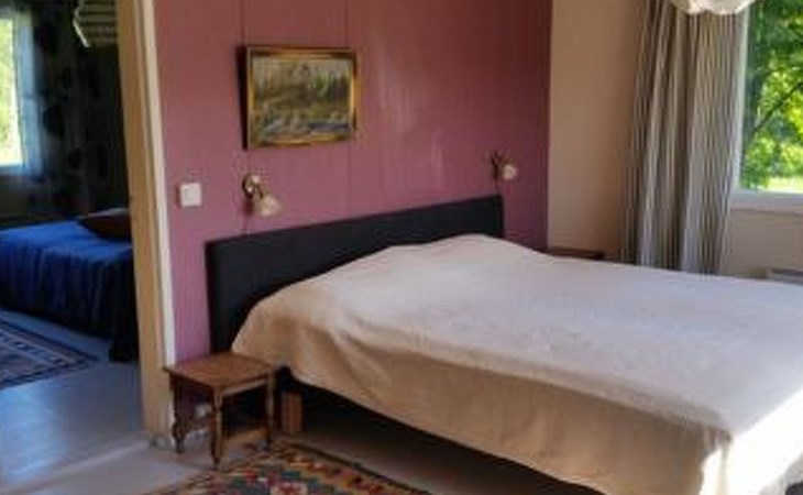 Upstairs, there are two bedrooms with a total of four beds and a toilet. Each room has a TV, and one of them also has a large screen that can be used as a TV. The sunny lake-facing upstairs room is equipped with an air source heat pump.