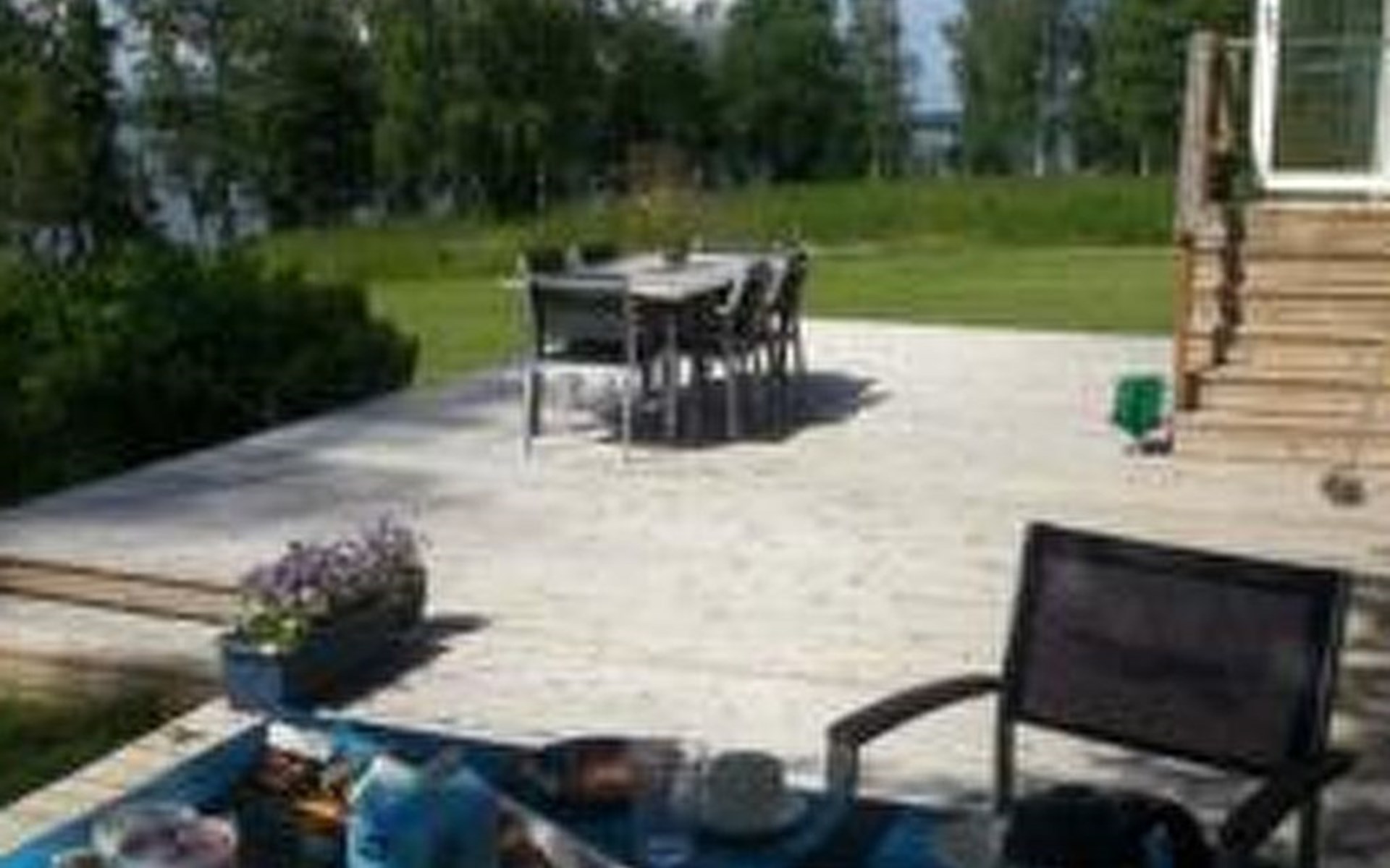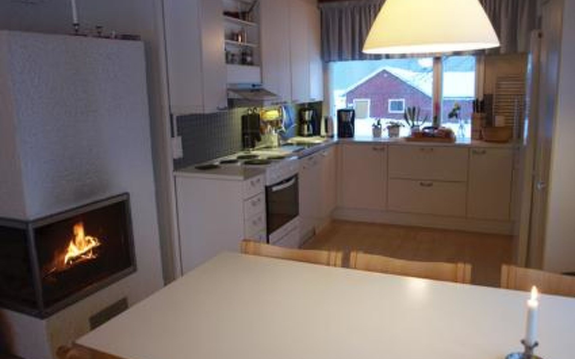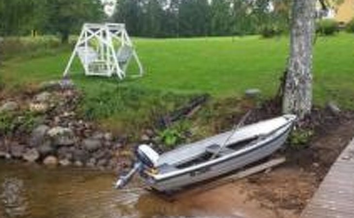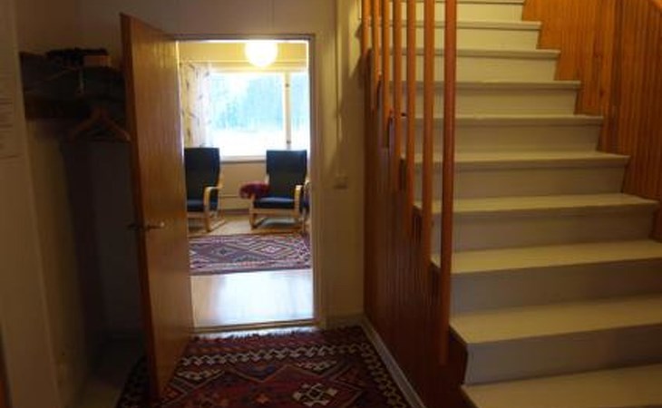 You enter the middle floor through the outdoor door into a bright glass veranda. The spacious entrance hall includes a toilet. The main room features a practical kitchen and a large dining table where you can enjoy views of the lush garden and the ever-changing lake surface.