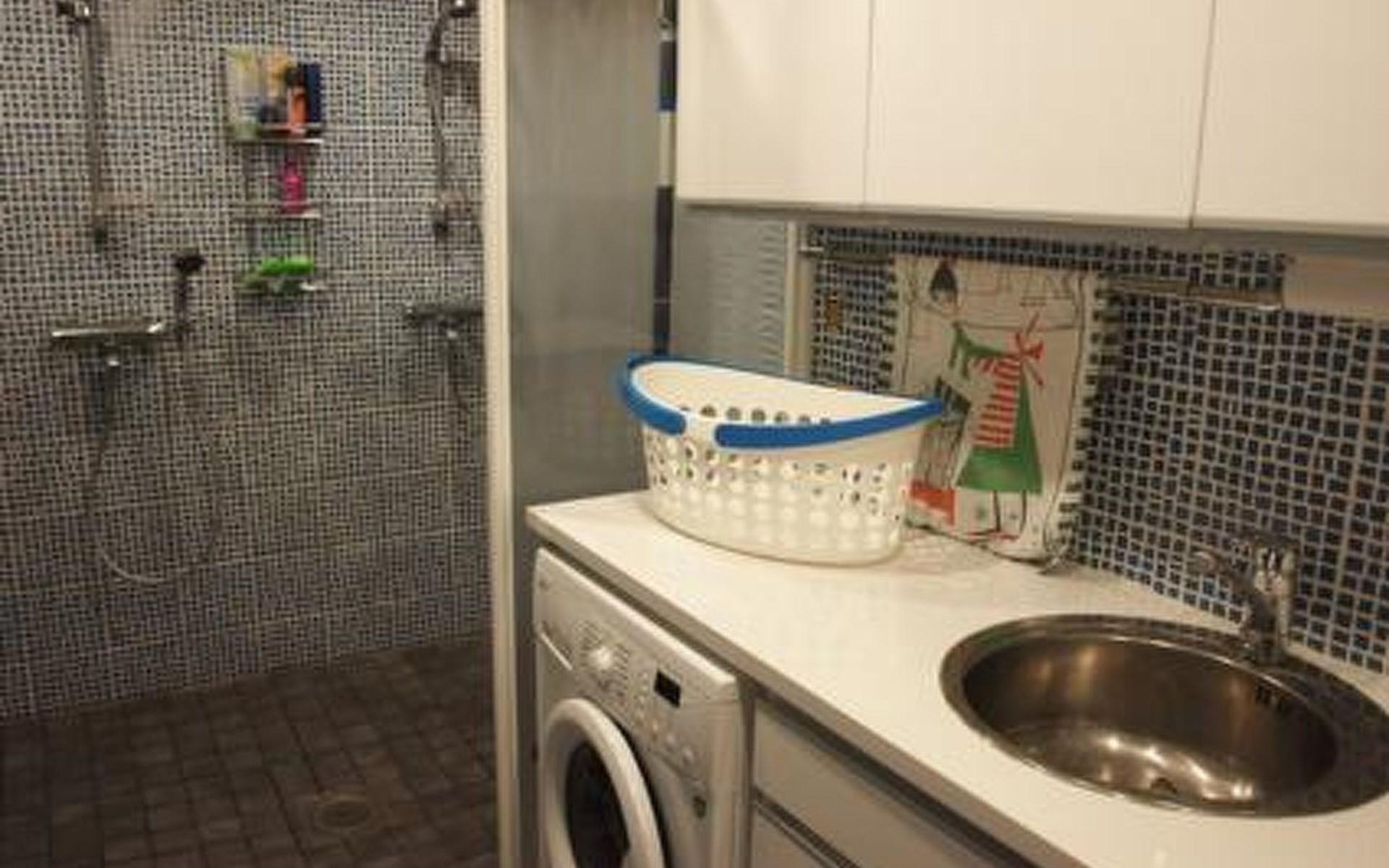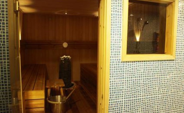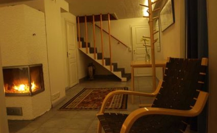 In the basement level, there is a cozy furnished dressing room/lounge with a fireplace. The electric sauna heats up quickly, and the bathroom has two showers. Around the corner, you'll find a utility room with a washing machine. This floor also has a third toilet, a freezer, and an additional fridge.