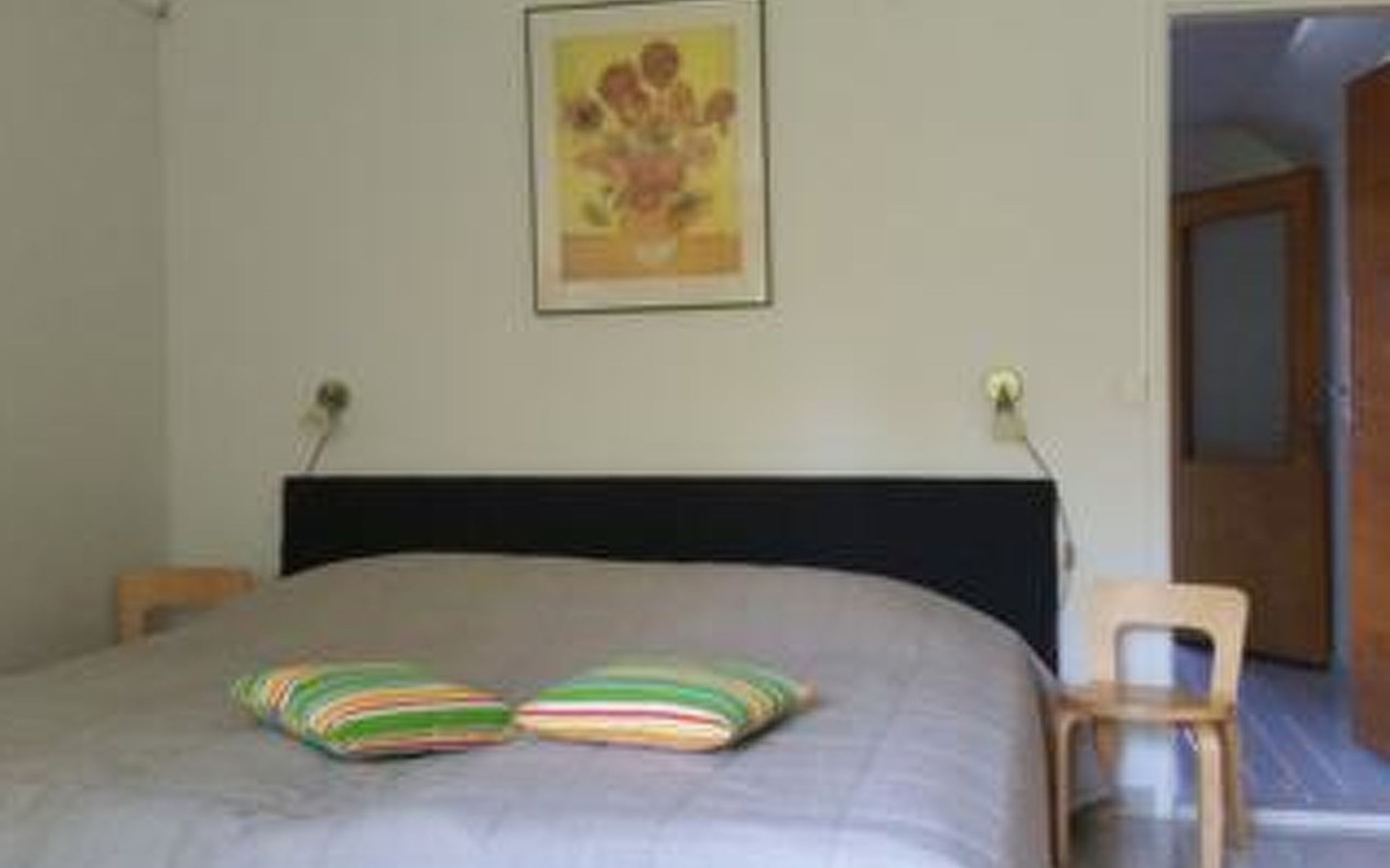 There are two bedrooms on this floor: one blue room with a double bed and one red room with two single beds.