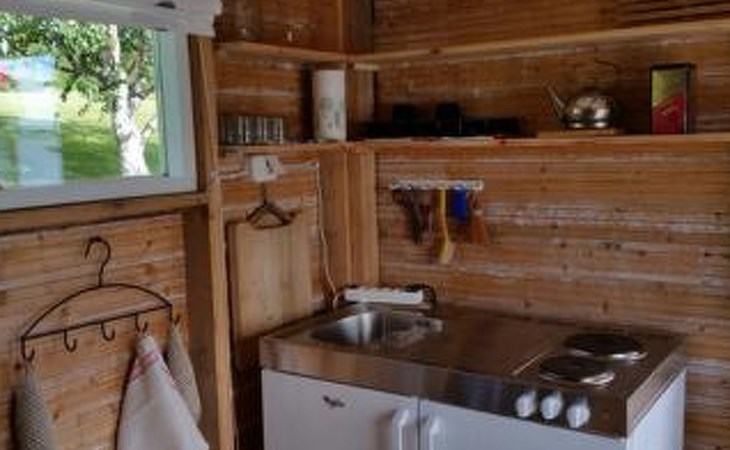 The small lakeside hut includes a mini kitchen and a bed. It’s perfect for a daytime nap or even overnight stays.