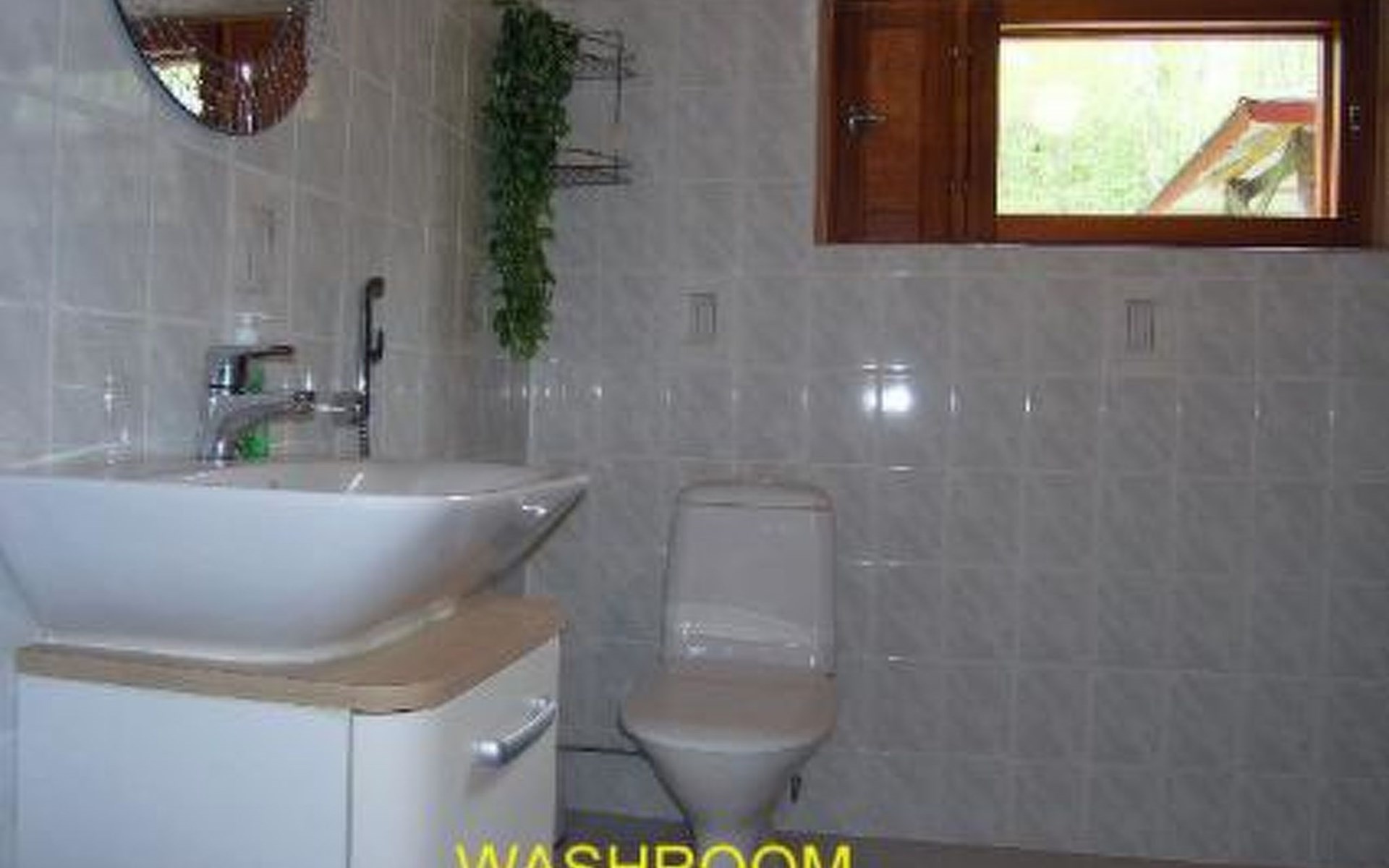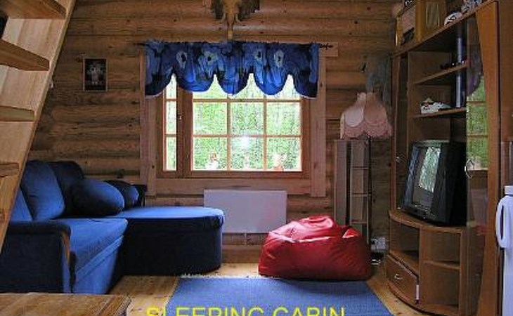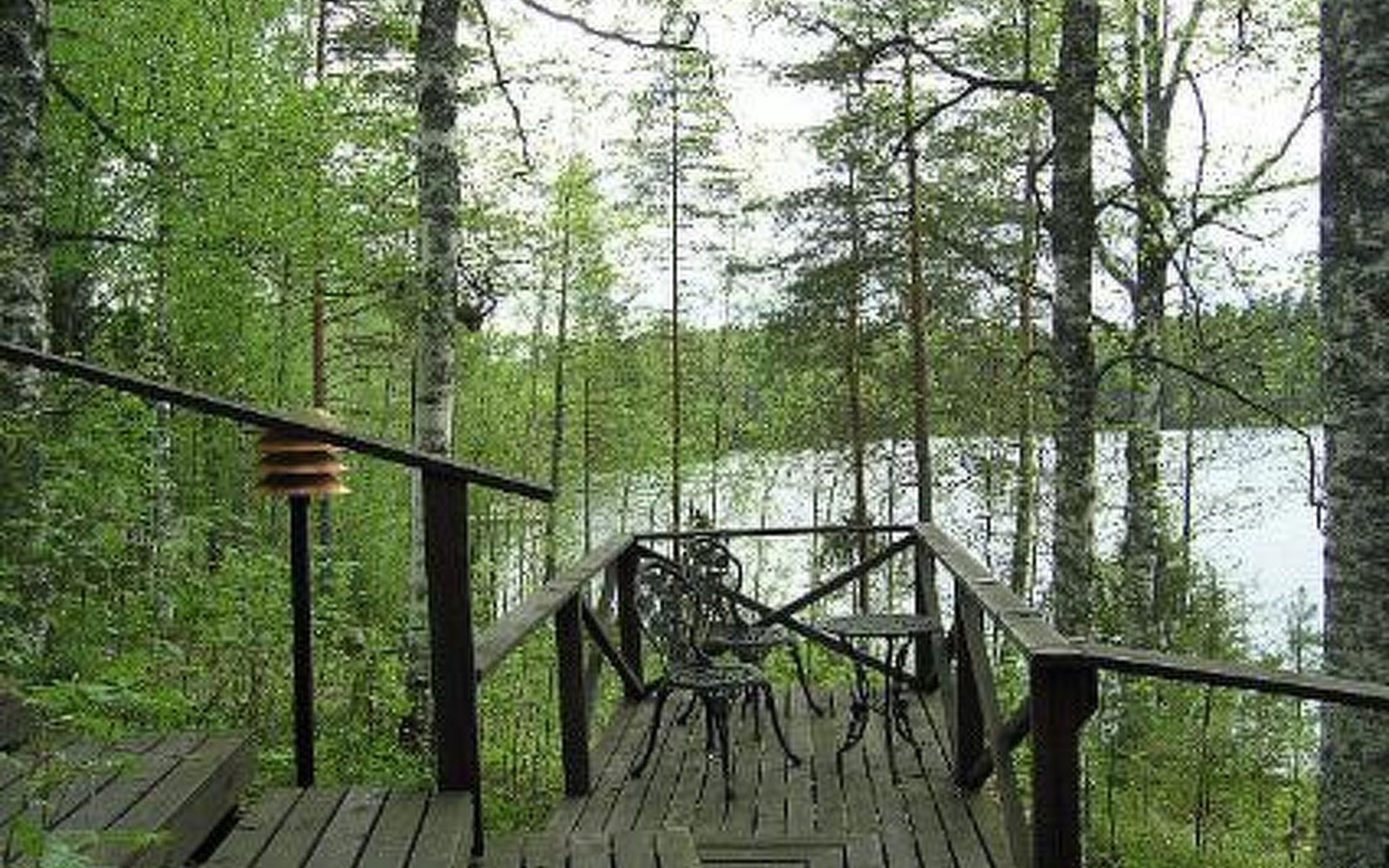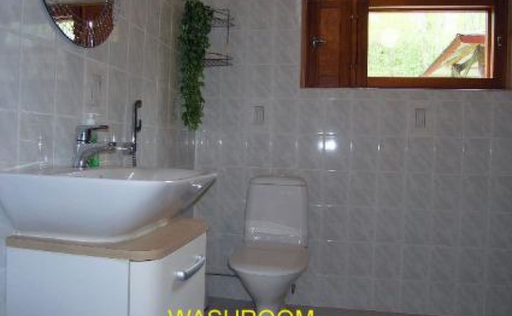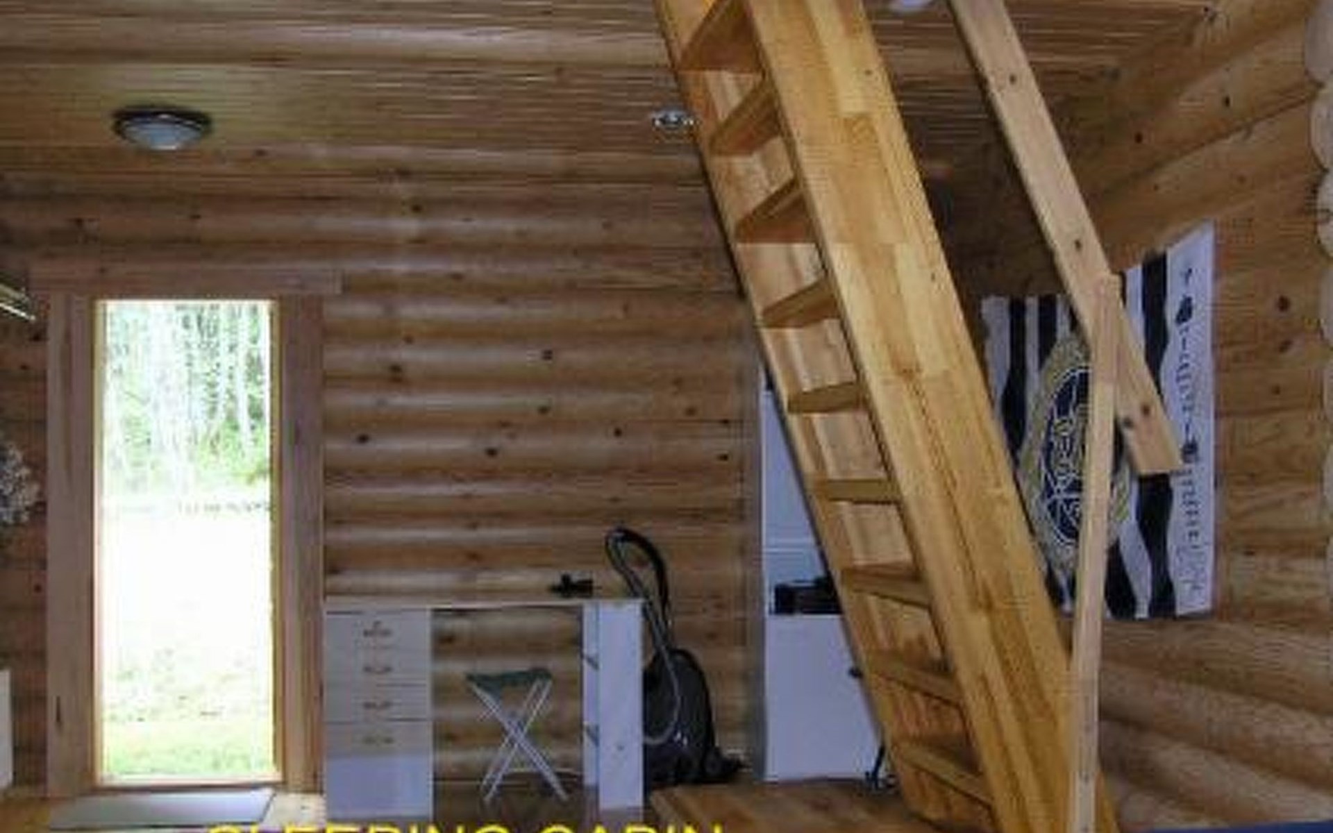 Lakeside sauna. Water to the sauna comes via pipe from lake, wood-burning stove, washroom with shower (lake water), living room area with sofa bed, stove, refrigerator and porch. In winter shower is not in use, the water is heated in the heater tank.