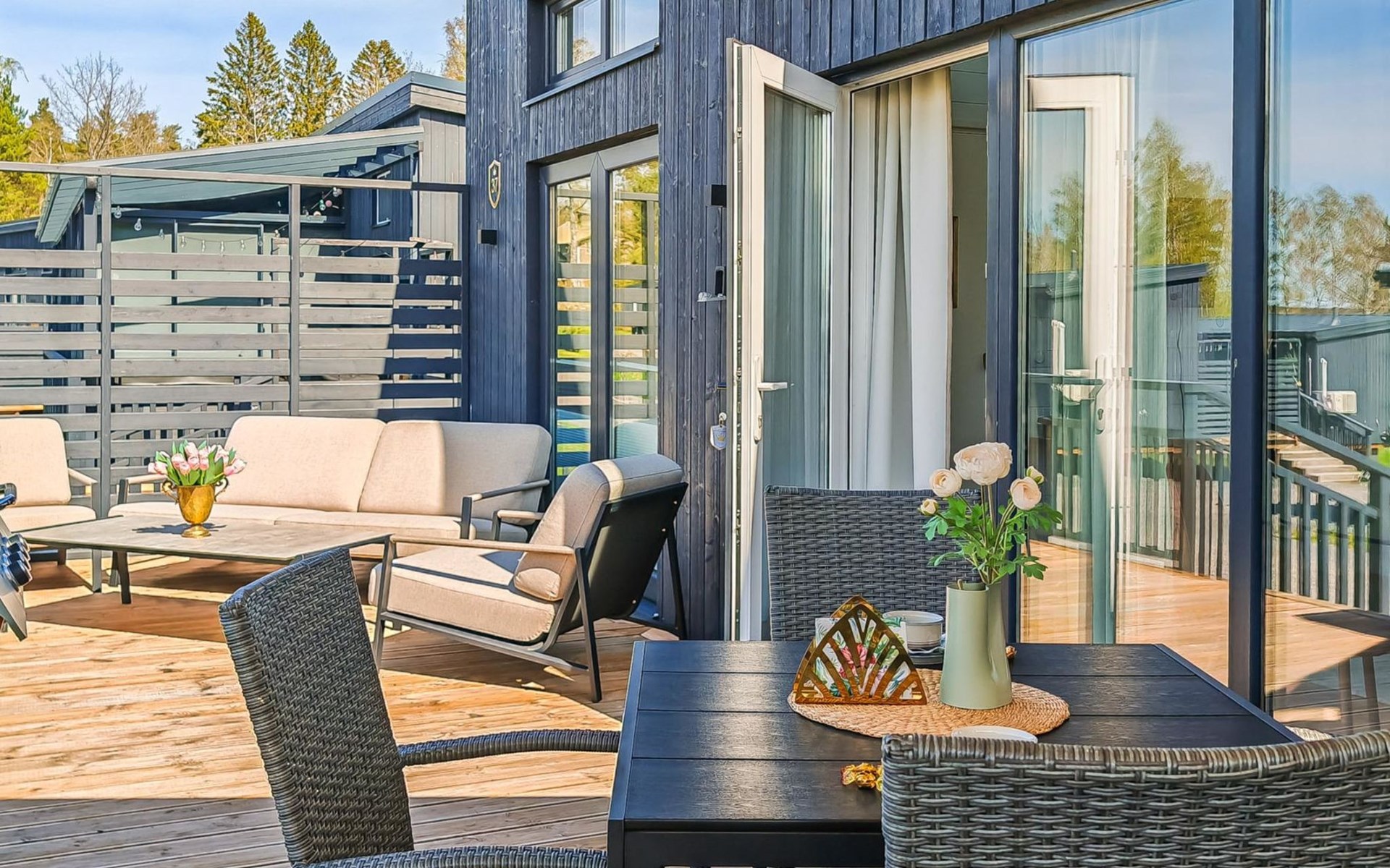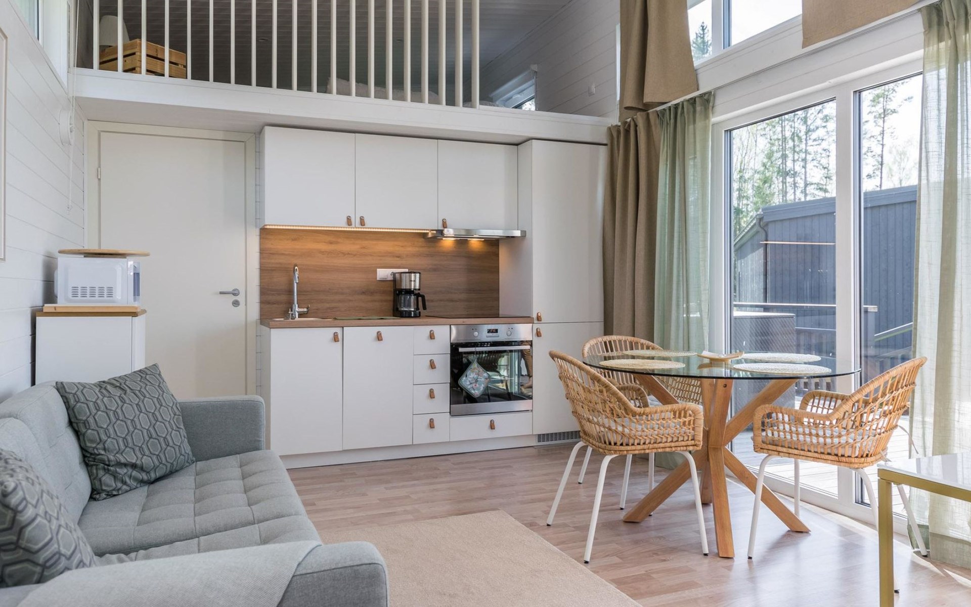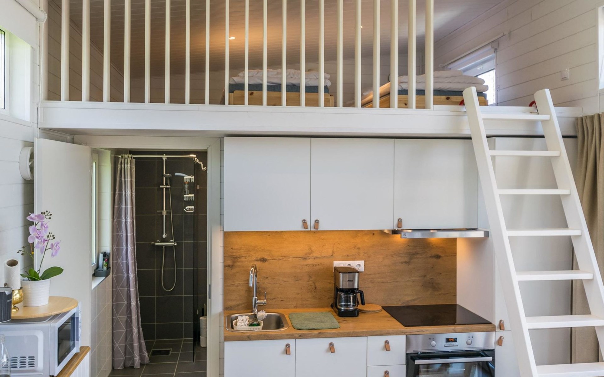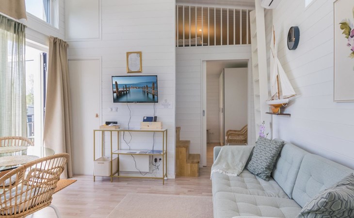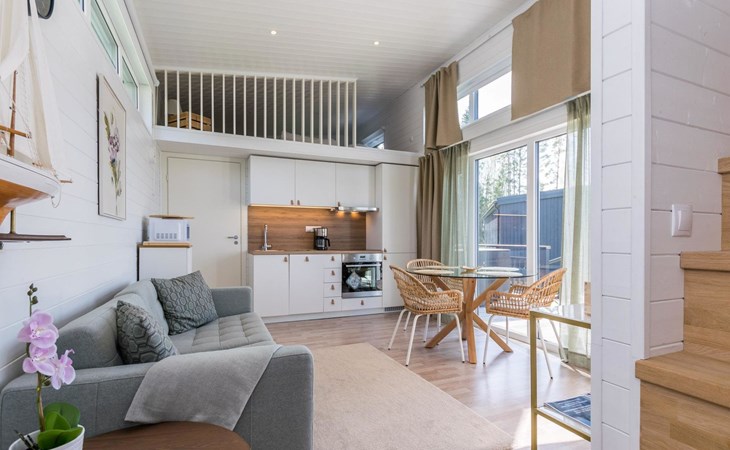 The villa has a unified living room and open-plan kitchen with access to a spacious terrace. It features an air source heat pump, a bedroom with two beds, and two separate low lofts, one 10 m² and the other 12 m², each with 2 beds. The other loft can be accessed via a movable ladder. There is a bathroom with a shower, WC, and washing machine (inverter washer-dryer). The sauna has an electric sauna stove, and the spacious terrace is furnished with high-quality garden furniture, a gas grill, and a sunshade.