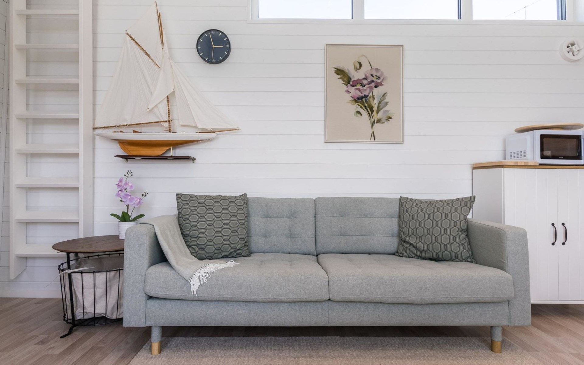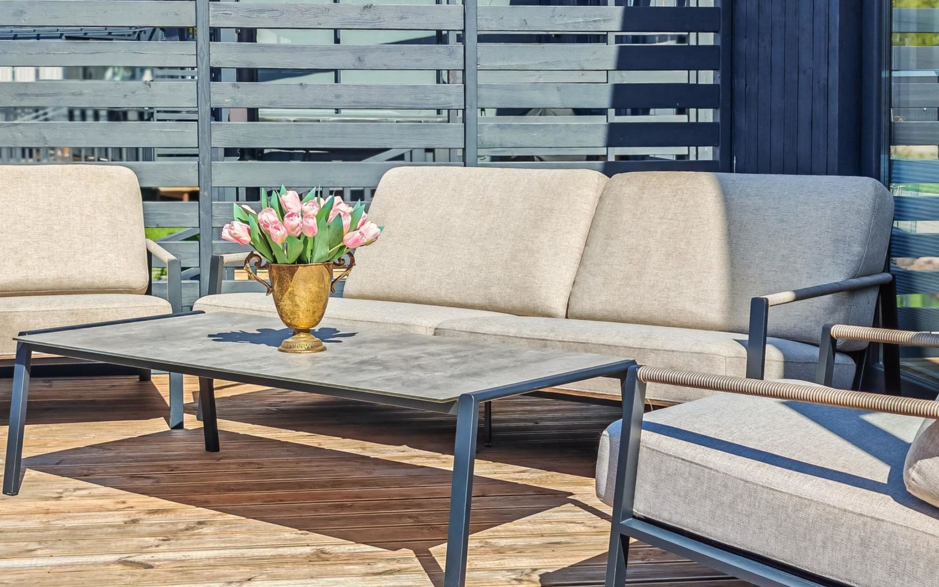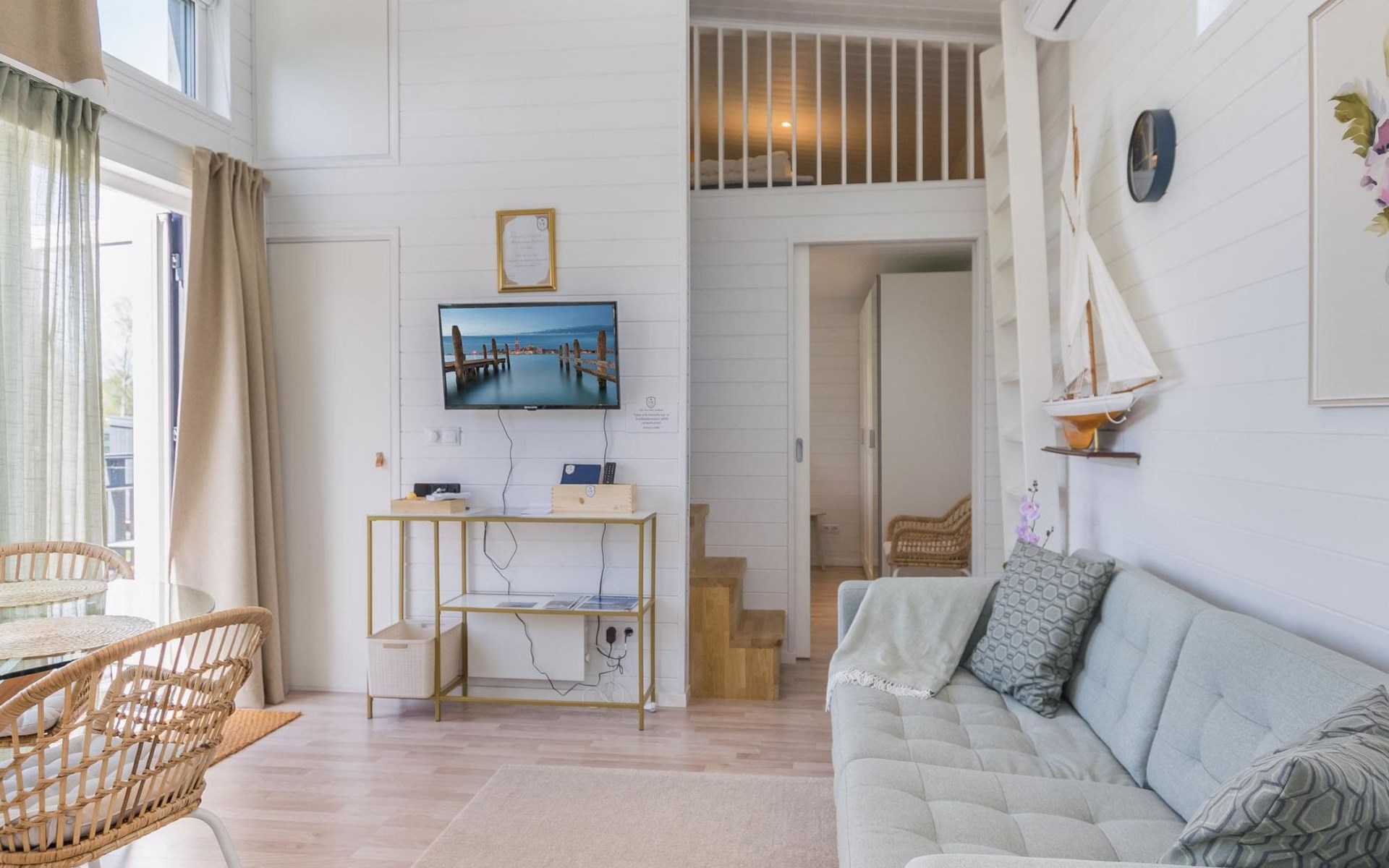 The villa has a unified living room and open-plan kitchen with access to a spacious terrace. It features an air source heat pump, a bedroom with two beds, and two separate low lofts, one 10 m² and the other 12 m², each with 2 beds. The other loft can be accessed via a movable ladder. There is a bathroom with a shower, WC, and washing machine (inverter washer-dryer). The sauna has an electric sauna stove, and the spacious terrace is furnished with high-quality garden furniture, a gas grill, and a sunshade.