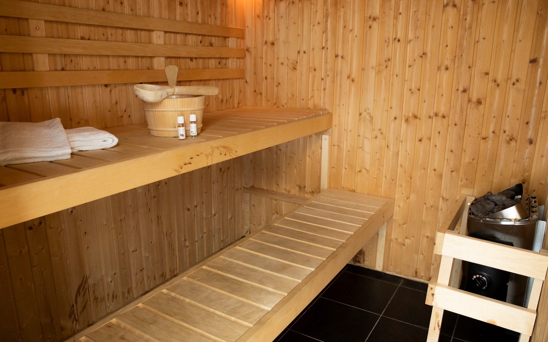 Op de onderste woonlaag vind je de royale woonkamer met een eethoek en een zithoek voorzien van een televisie. De compleet ingerichte open keuken beschikt over luxe apparatuur zoals een gaskookplaat, combimagnetron en vaatwasser. Vanuit de woonkamer heb je toegang tot het balkon met terrasmeubilair. Geniet van het prachtige uitzicht vanaf dit royale balkon of ontspan heerlijk in je privé wellnessruimte! Deze wellnessruimte heeft een sauna en een bubbelbad. Je vindt hier eveneens fitnessapparatuur, een douche en een wastafel.