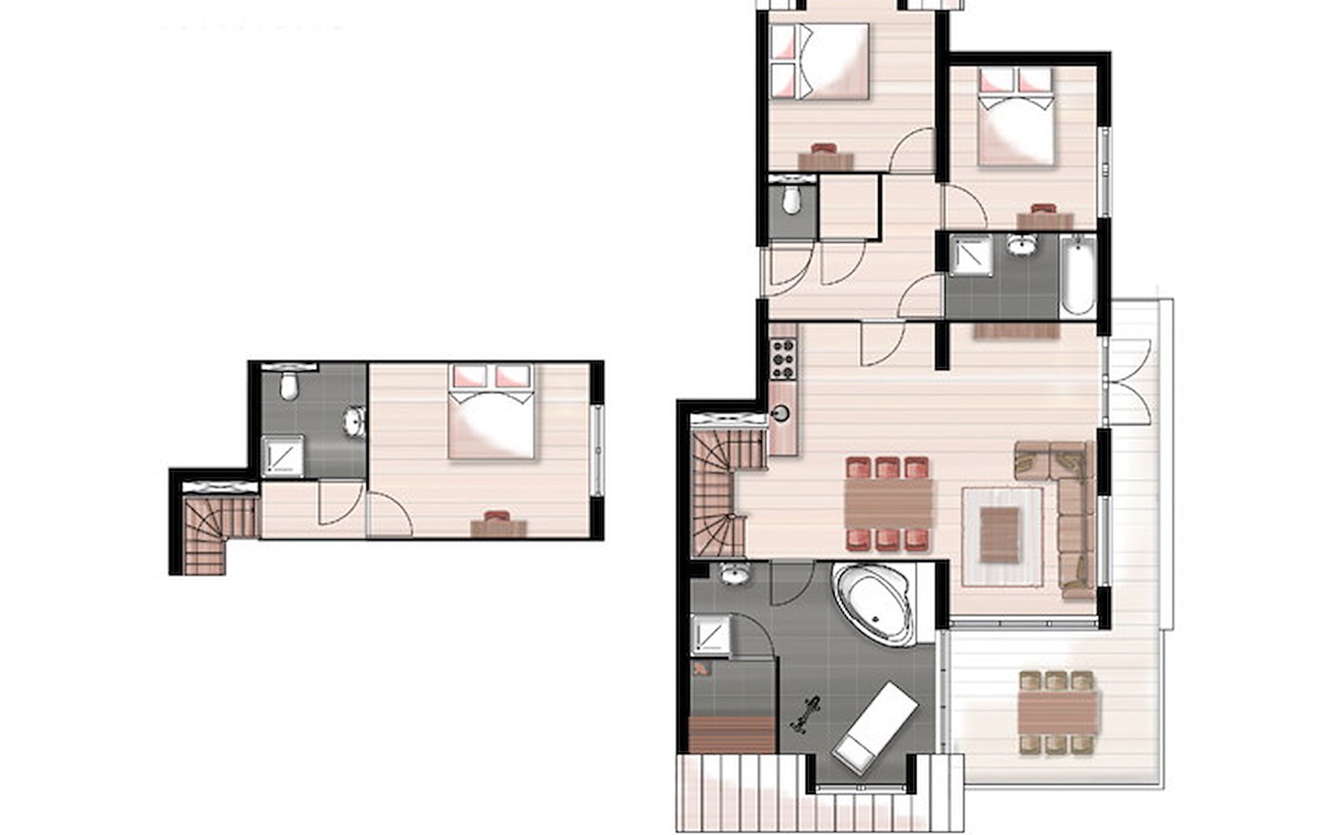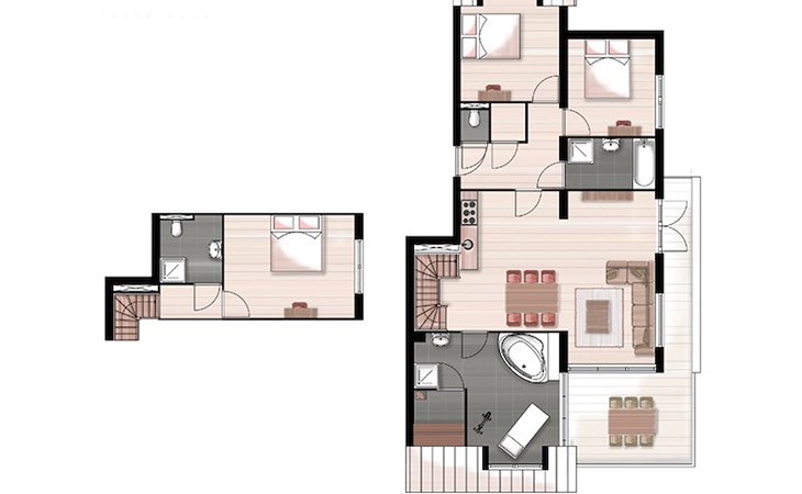 De indeling van het appartement of de vakantiewoning kan afwijken. De plattegronden en beelden geven een goede impressie, maar zijn slechts ter illustratie.