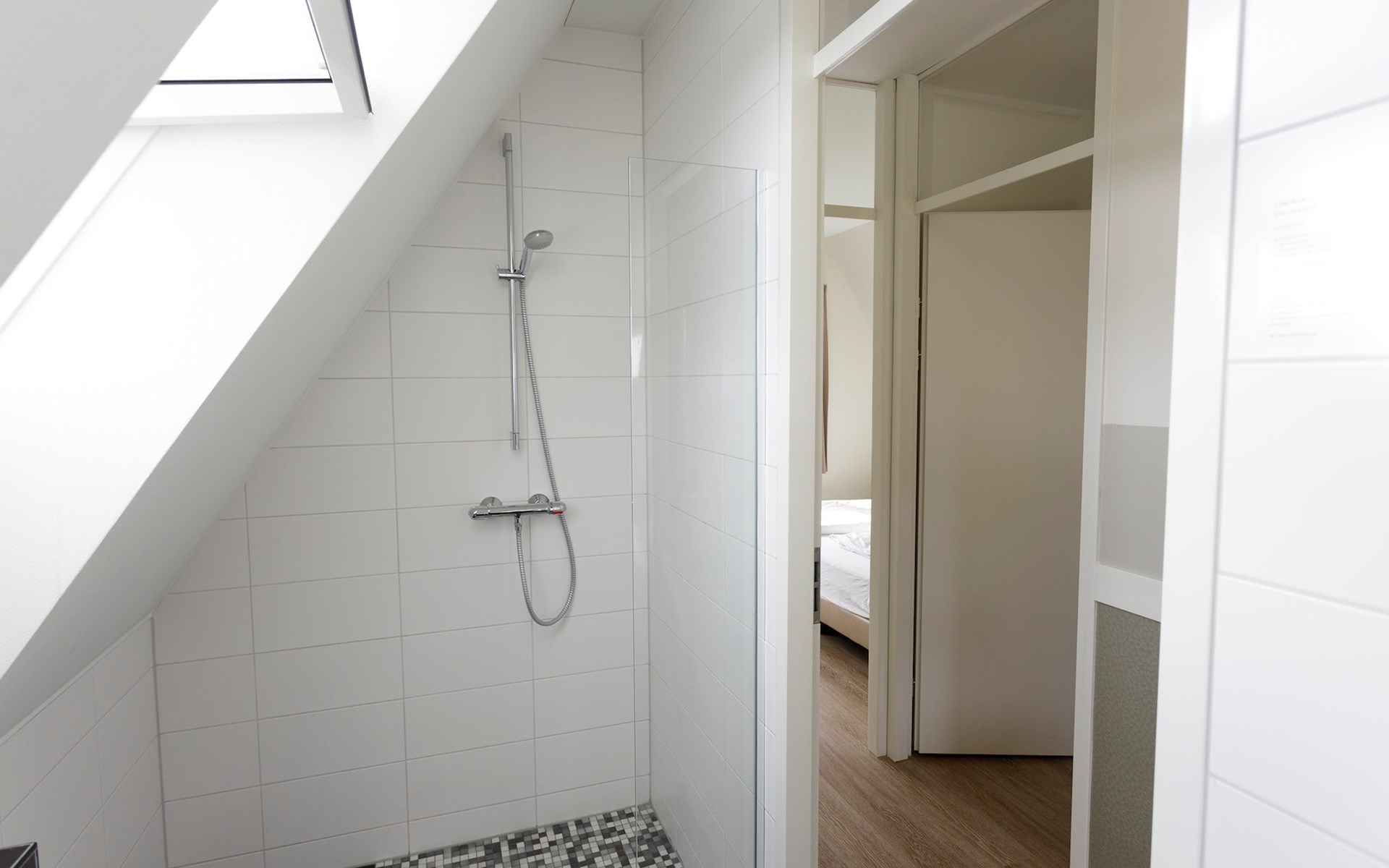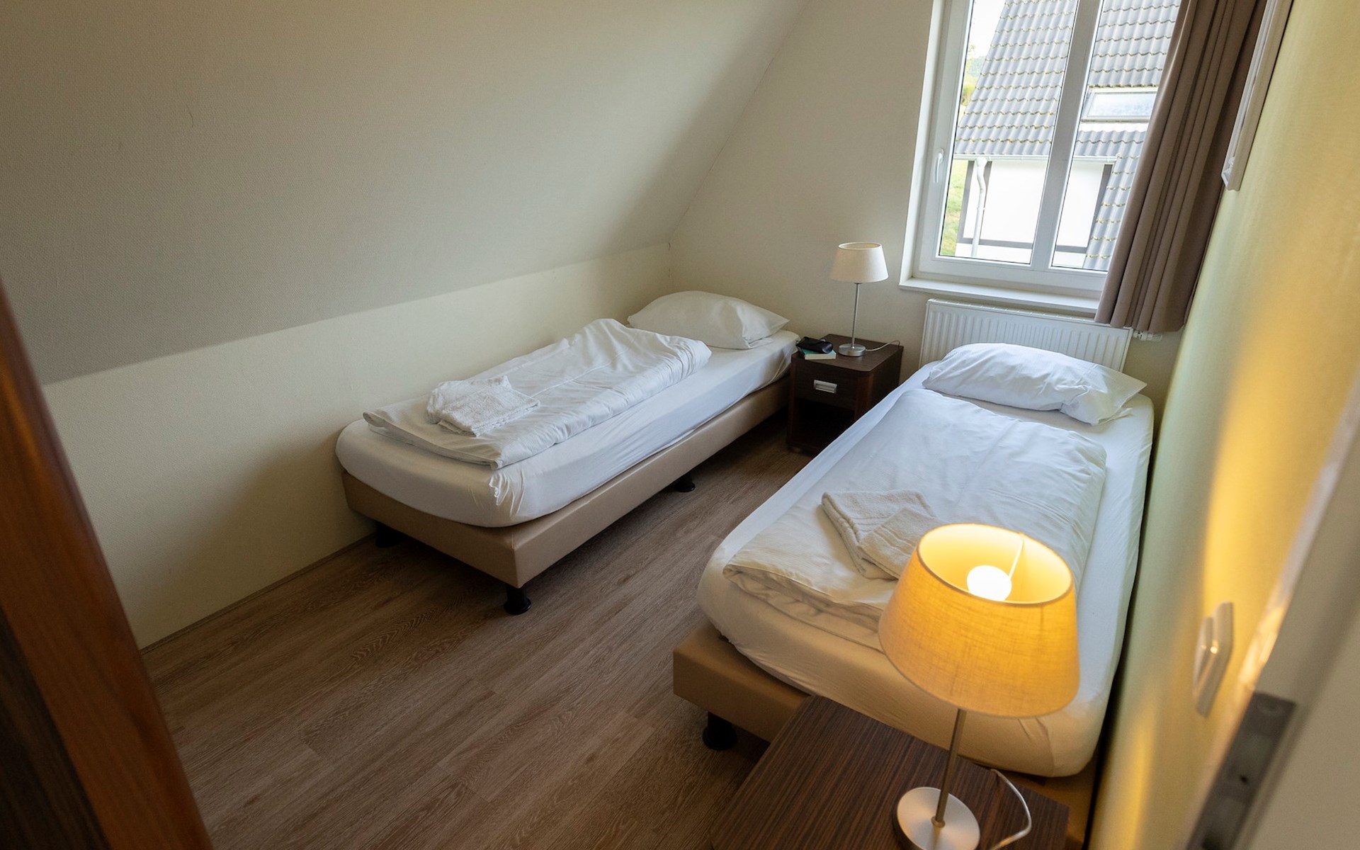 De eerste verdieping beschikt over nog 2 slaapkamers met 2 éénpersoonsbedden en een badkamer voorzien van een douche, wastafel en toilet.