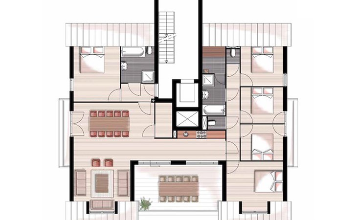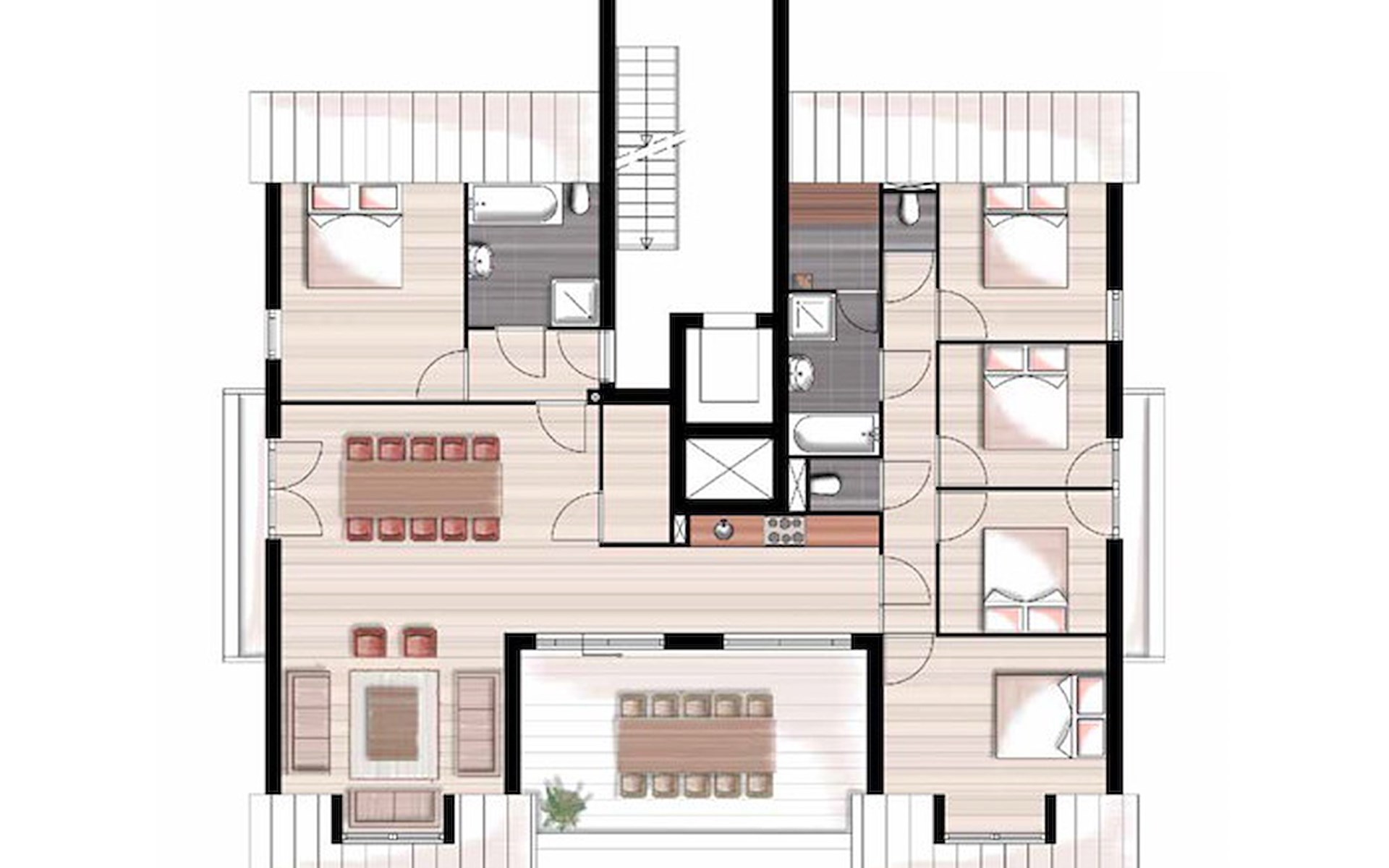 Het appartement beschikt over 5 slaapkamers, 2 badkamers, 2 separate toiletten en een berging. Vier van de slaapkamers beschikken over 2 éénpersoonsbedden. De andere slaapkamer is uitgerust met een tweepersoonsbed. In twee slaapkamers is er een televisie aanwezig. De twee badkamers zijn voorzien van een ligbad, aparte douche, wastafel en toilet. Daarnaast geeft één van de badkamers toegang tot een sauna, waar je heerlijk kunt relaxen tijdens je verblijf.