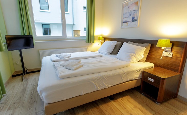 Het appartement is voorzien van 2 slaapkamers. Beide tweepersoonsslaapkamers zijn voorzien van 2 éénpersoonsbedden, één van de slaapkamers heeft een televisie. De badkamer heeft een ligbad, douche, wastafel en toilet. Daarnaast is er een separaat toilet aanwezig.