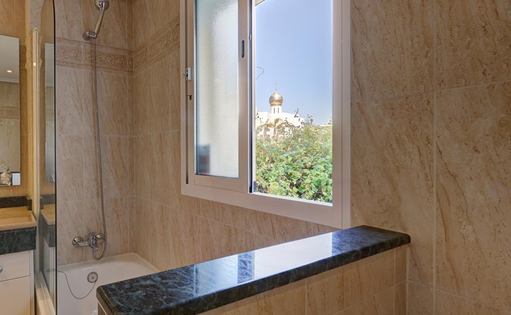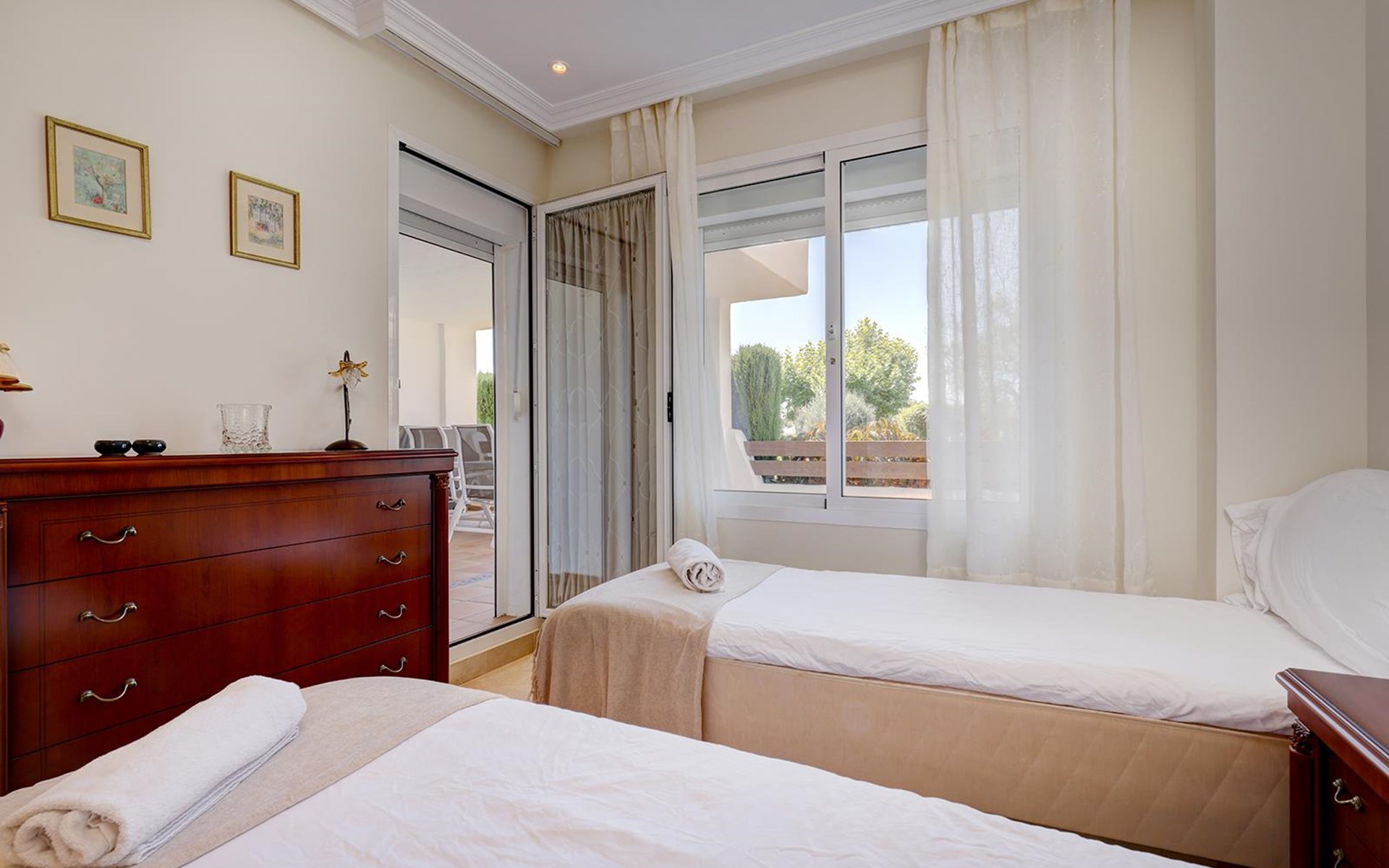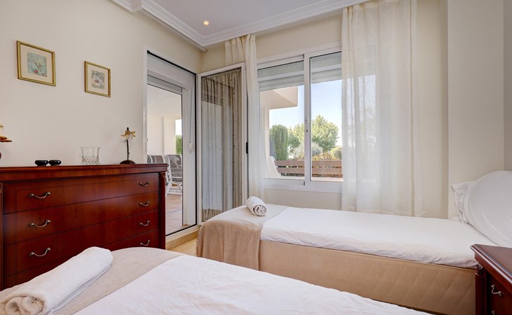 - Tweede slaapkamer met airconditioning, twee comfortabele eenpersoonsbedden (80 x 200 cm) en een en-suite badkamer