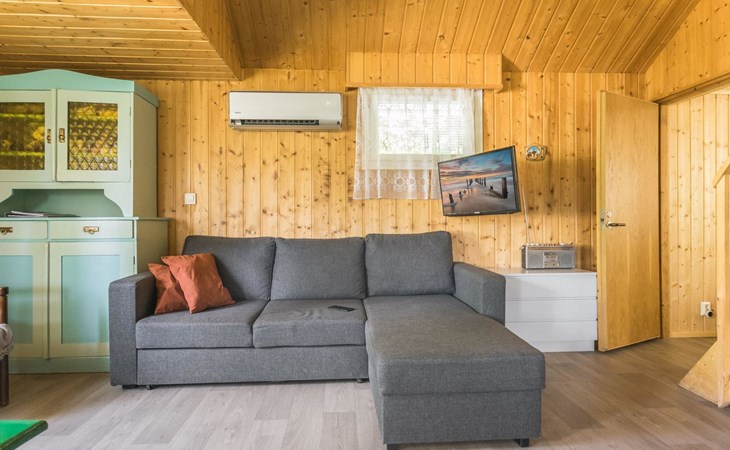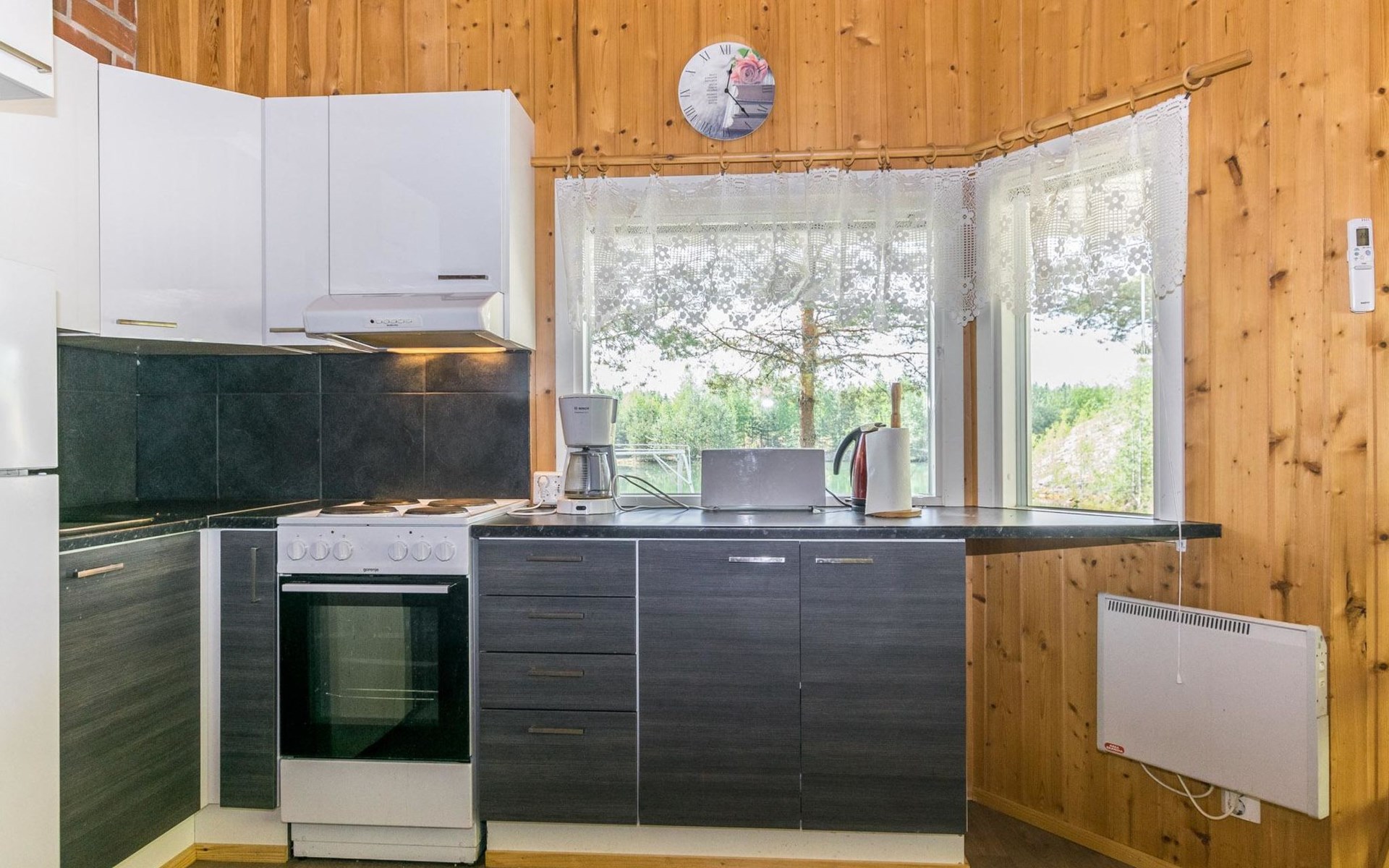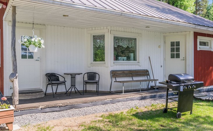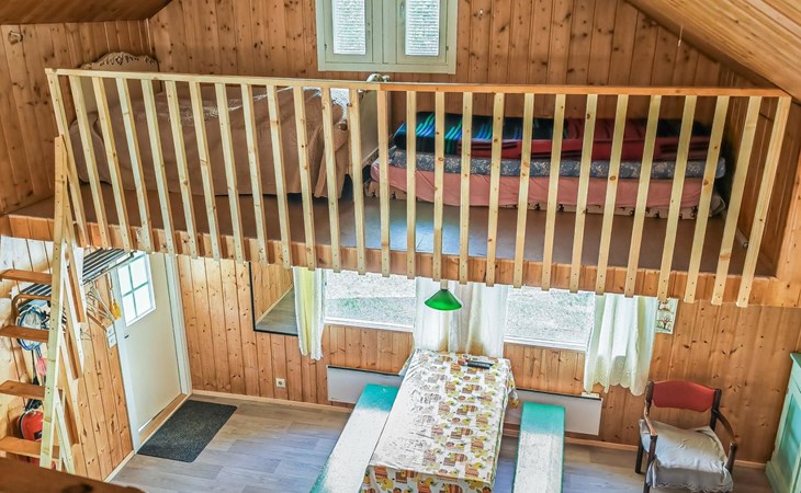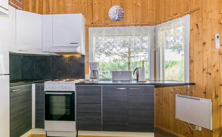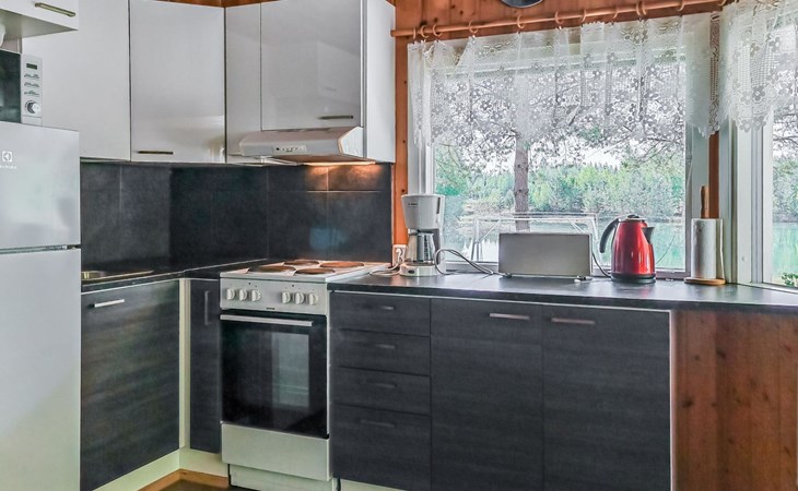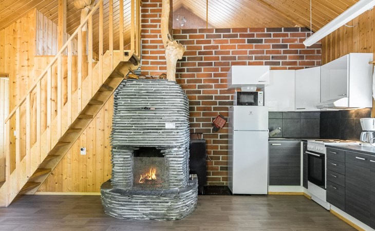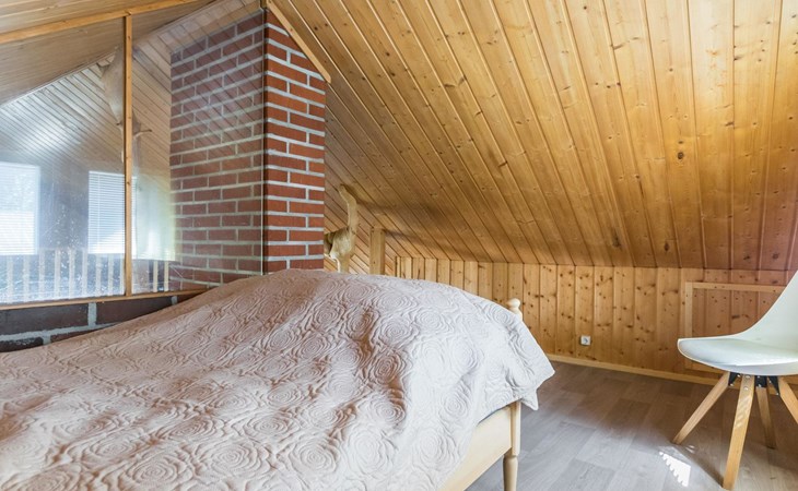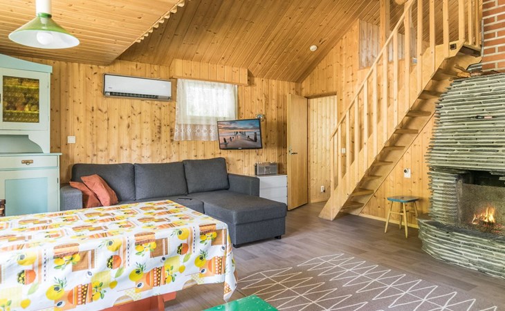 Wooden cottage (1989), living room with sofa bed (140x200 cm bed for two), soapstone fireplace, TV and kitchenette. The bedroom has a double bed, two lofts, one of which has one 120x200 cm bed, the other loft, which is accessed by steep stairs, has one 80x200 cm bed.