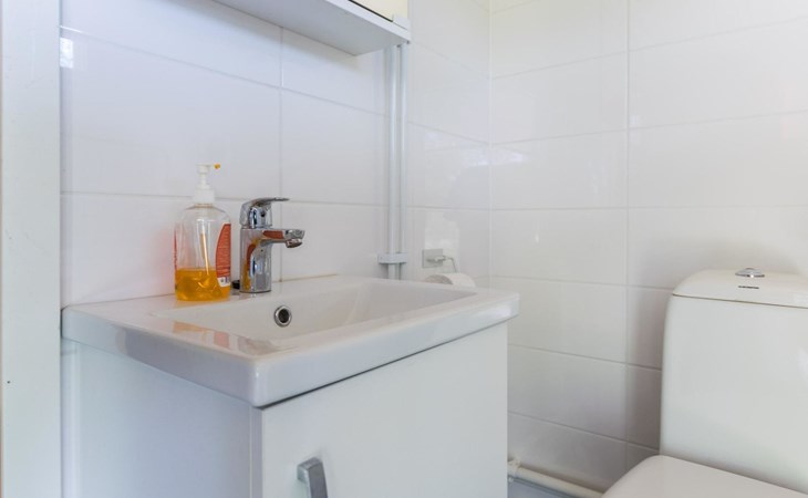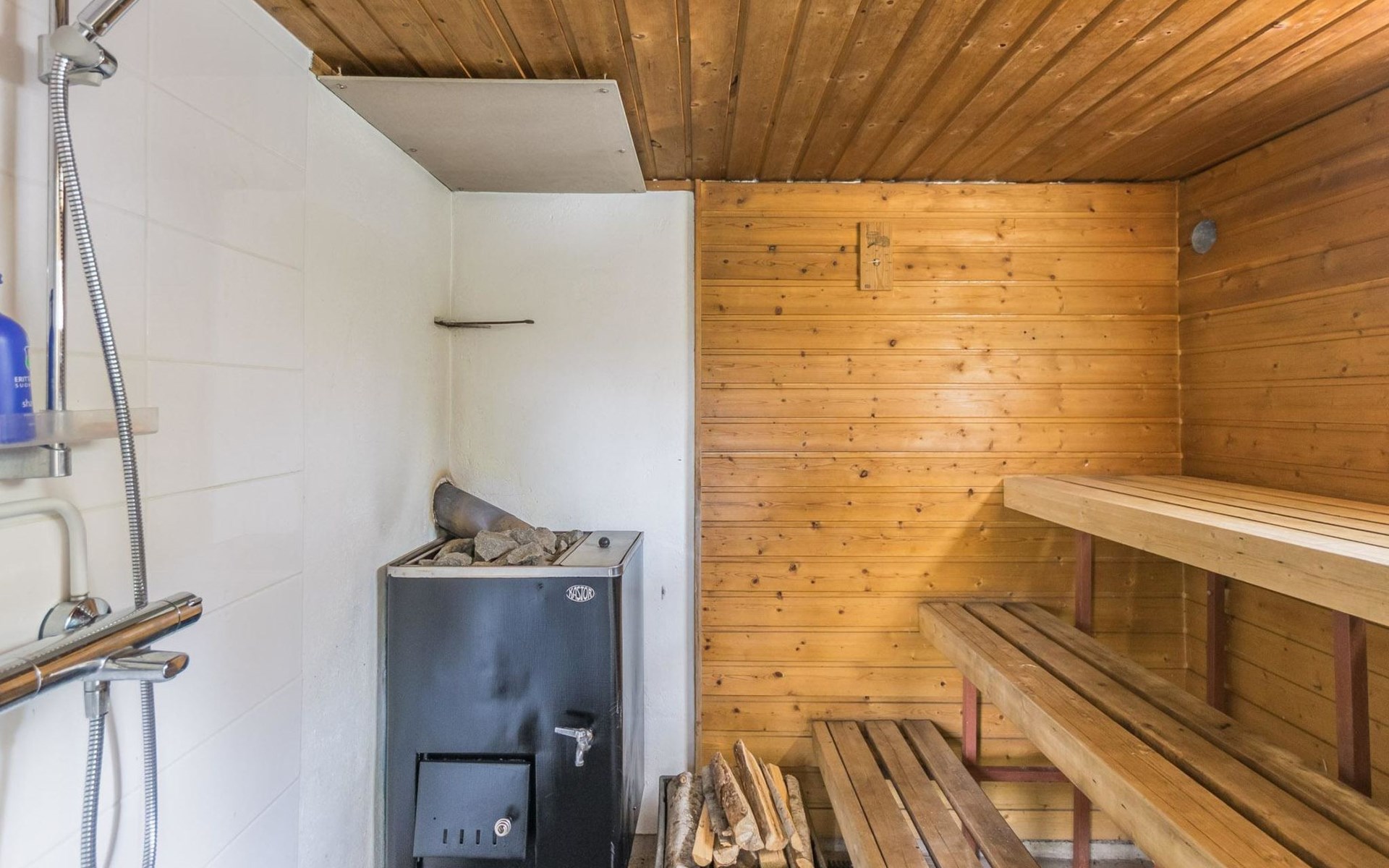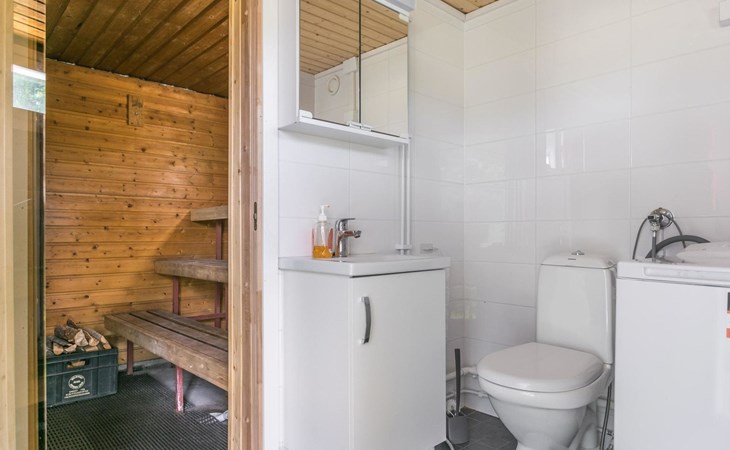 Wc and sauna, accessible via the terrace. A wood-burning stove in the sauna. There is also a washing machine in the toilet.