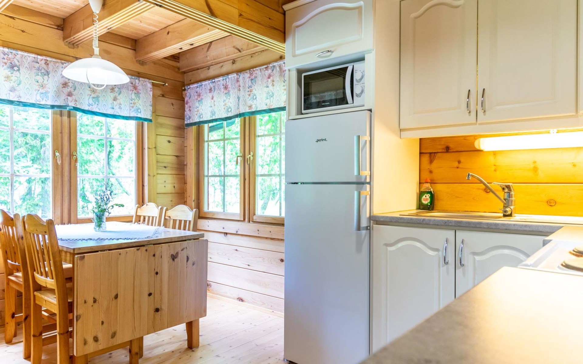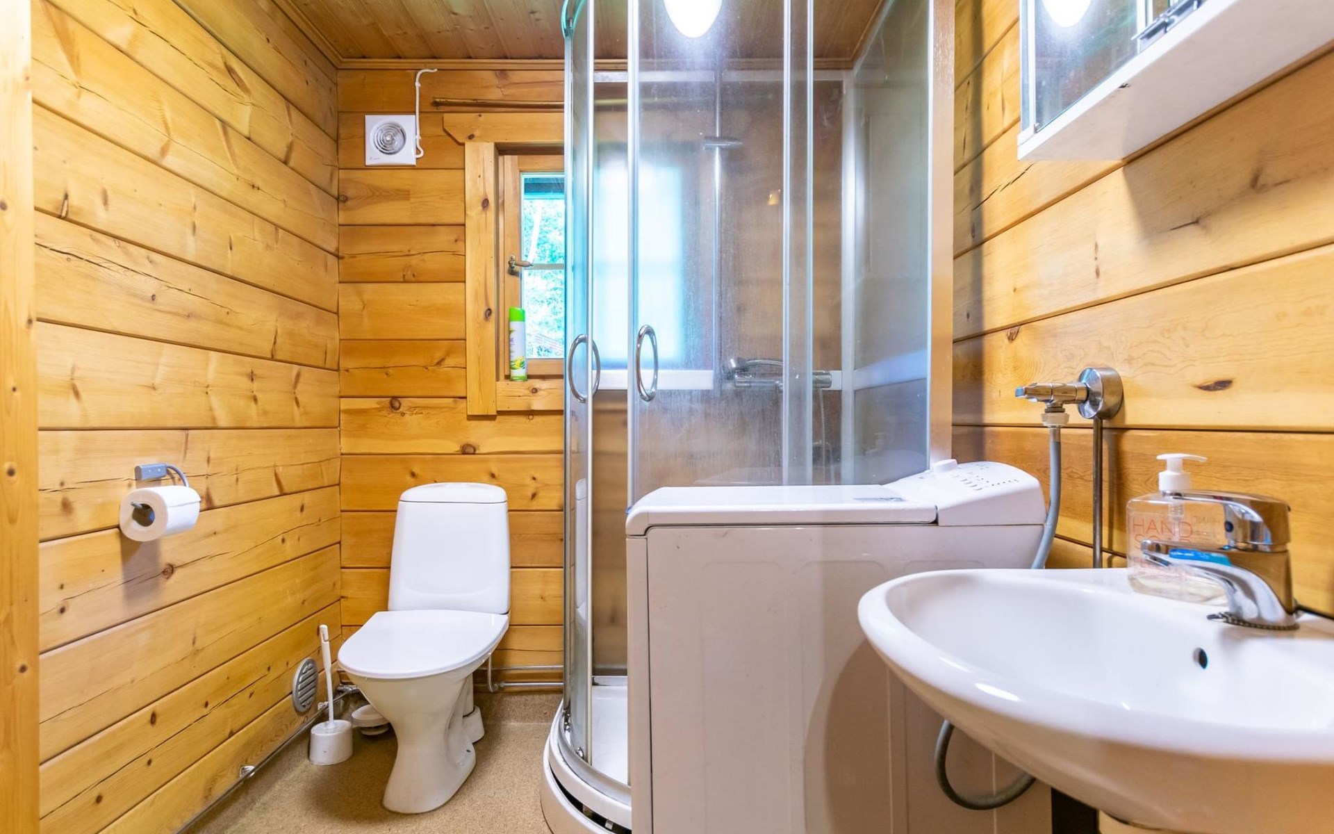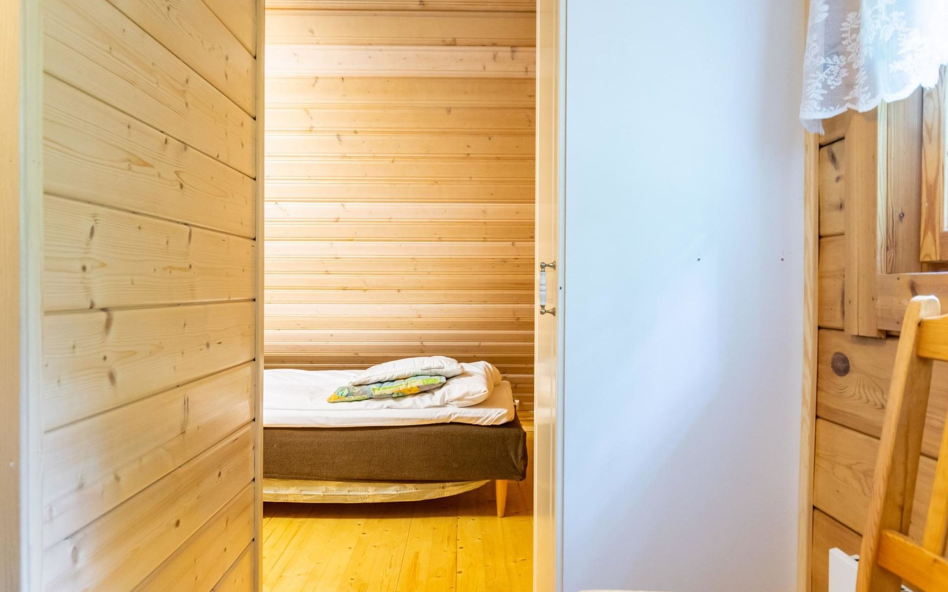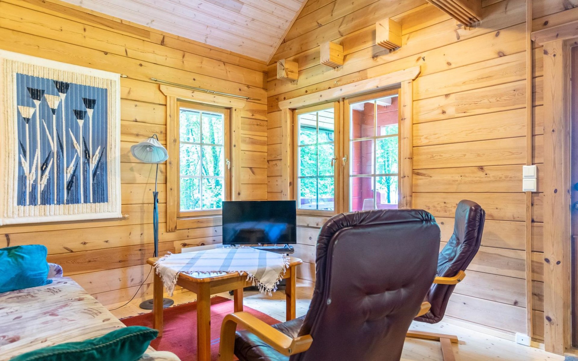 9 km north of Kristiinakaupunki, Selkämeri 50 m, gently deepening hard gravel bottom, own boat, no pier. Log cabin 2005, kitchen, light fireplace, living room with sofa and two chairs and TV, bedroom with two beds. Sleeping loft with four beds under a low pitched roof, washroom with shower and toilet, sauna (wood-burning stove), open porch.