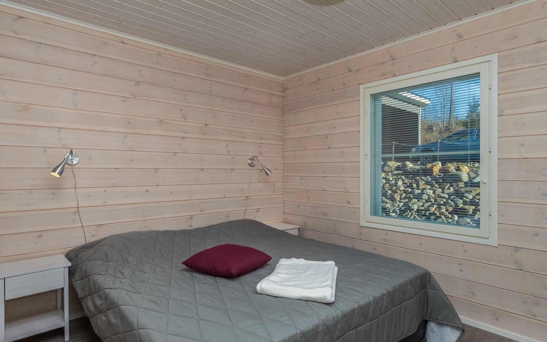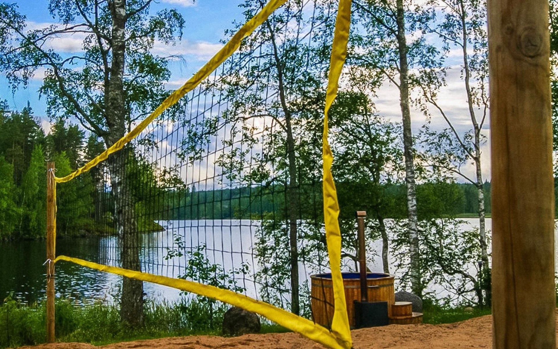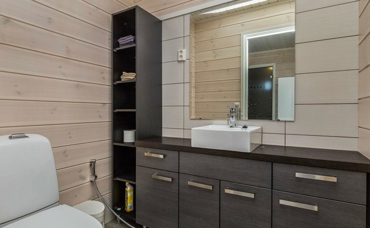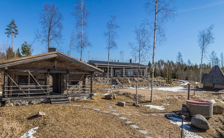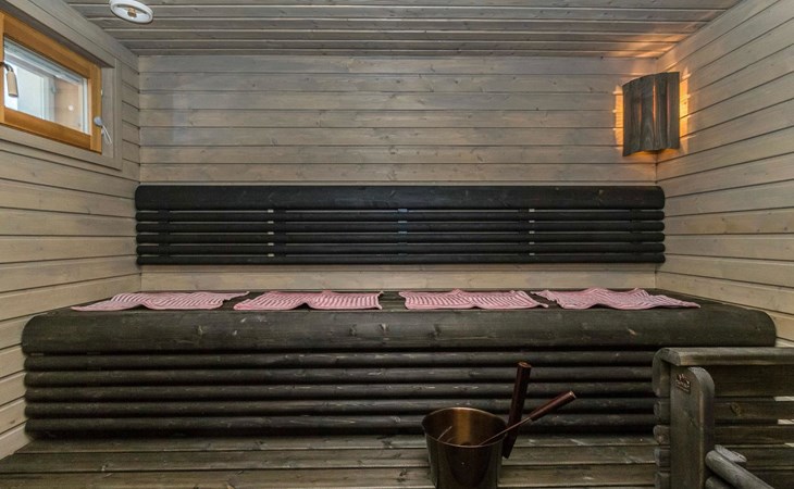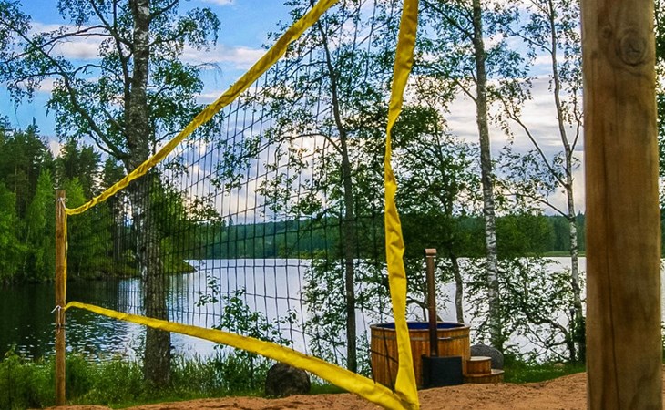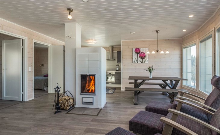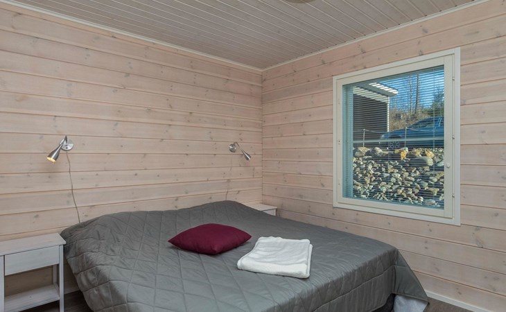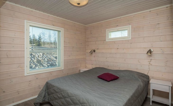 Wooden villa 2014, large livingroom/kitchen with two extra beds on the sofa bed, two bedrooms (10 m²), two beds in both, sofa bed for two in the sauna building, two separate WC’s, washroom and sauna (electric sauna stove), large covered terrace.