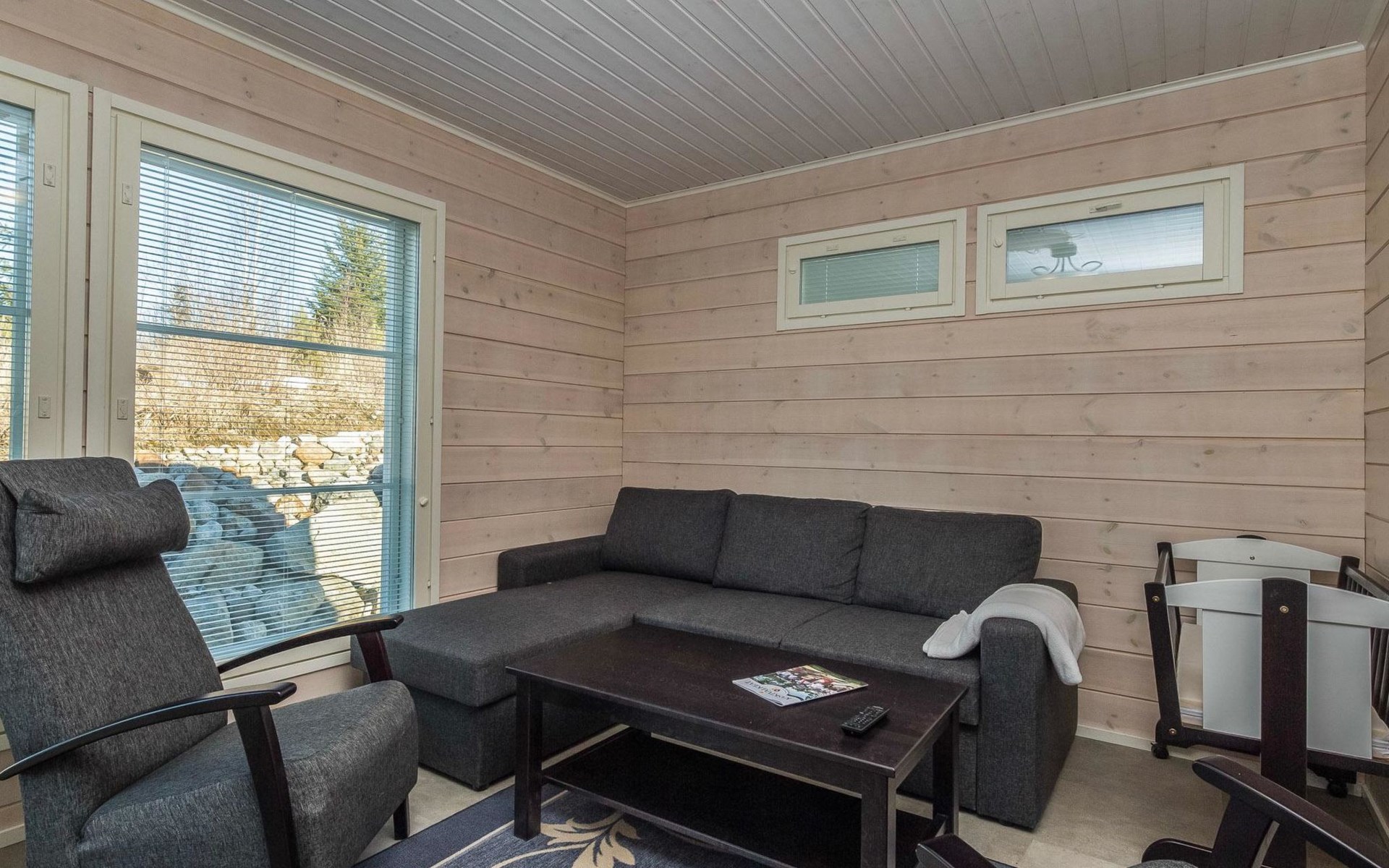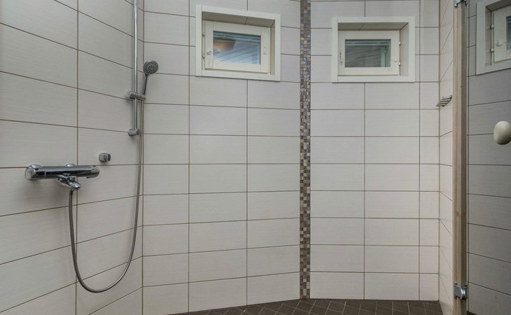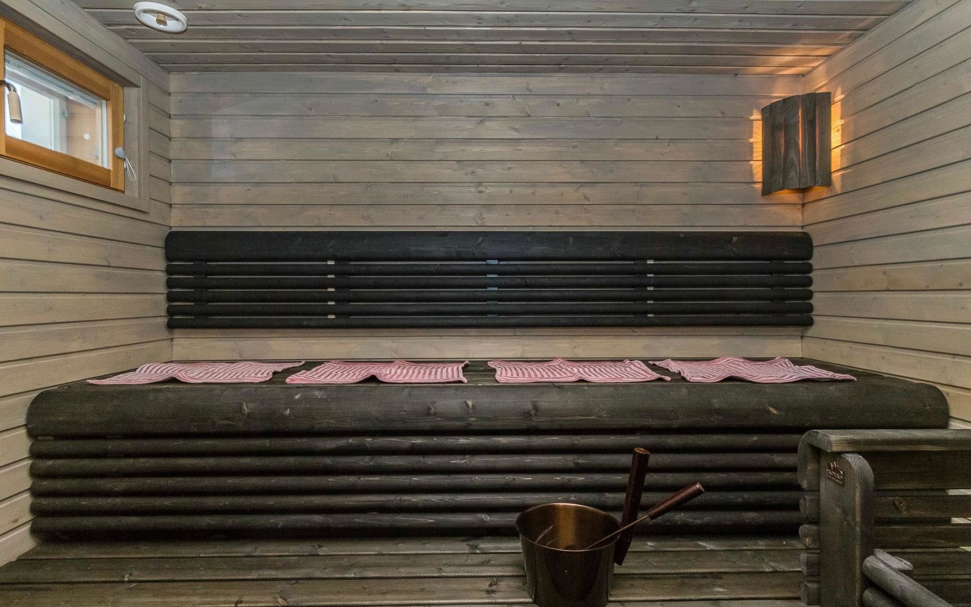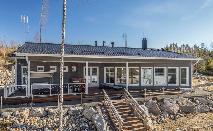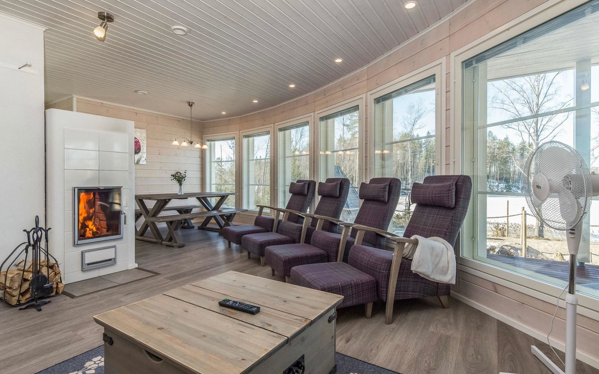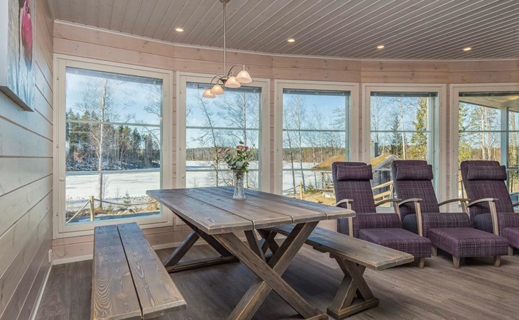Wooden villa 2014, large livingroom/kitchen with two extra beds on the sofa bed, two bedrooms (10 m²), two beds in both, sofa bed for two in the sauna building, two separate WC’s, washroom and sauna (electric sauna stove), large covered terrace.