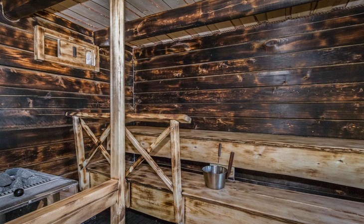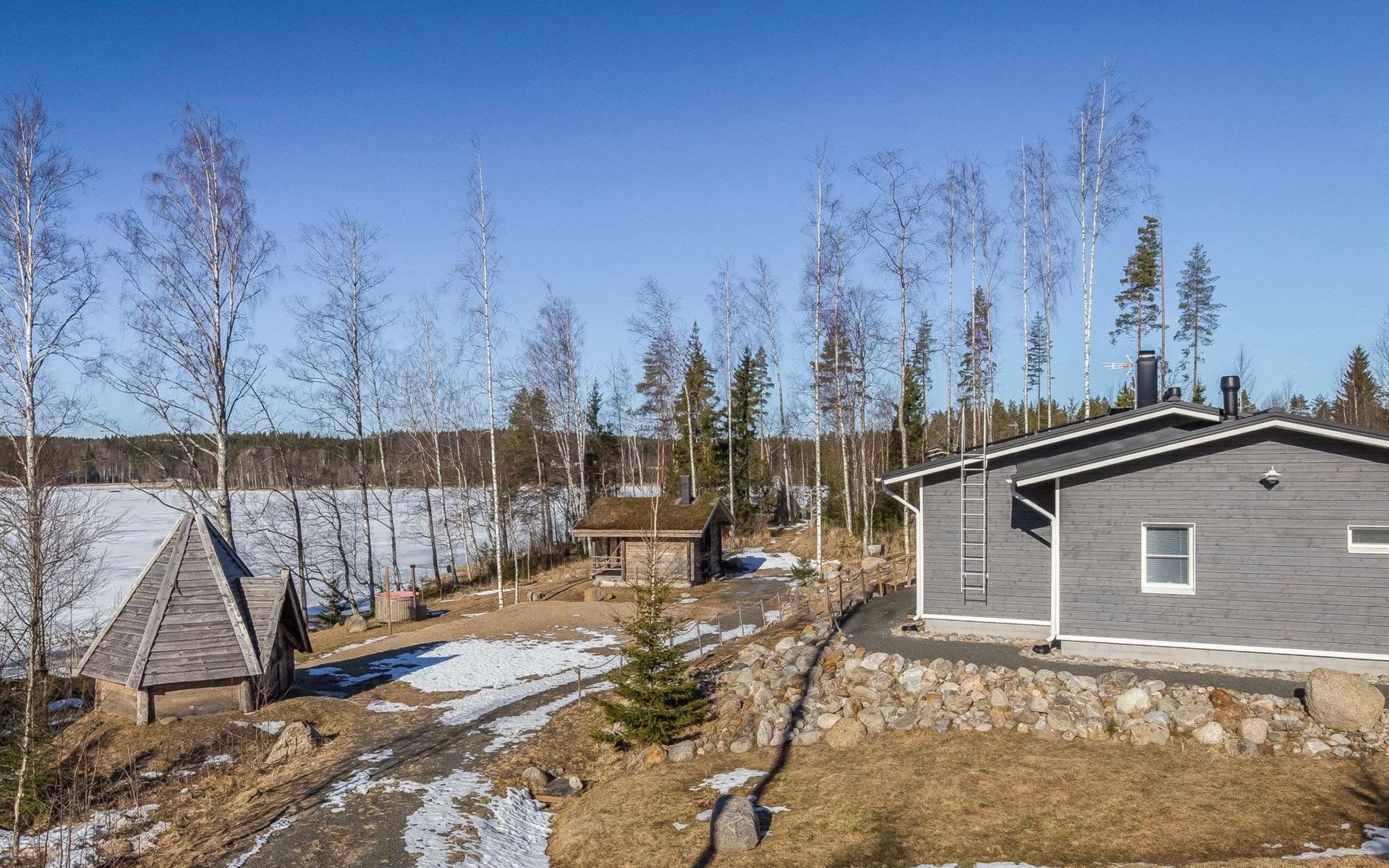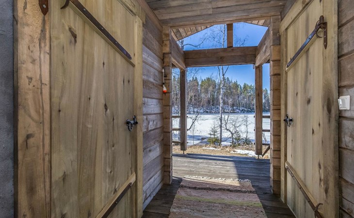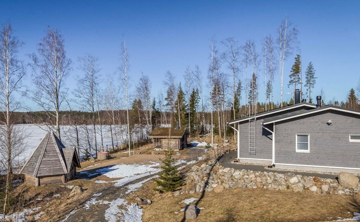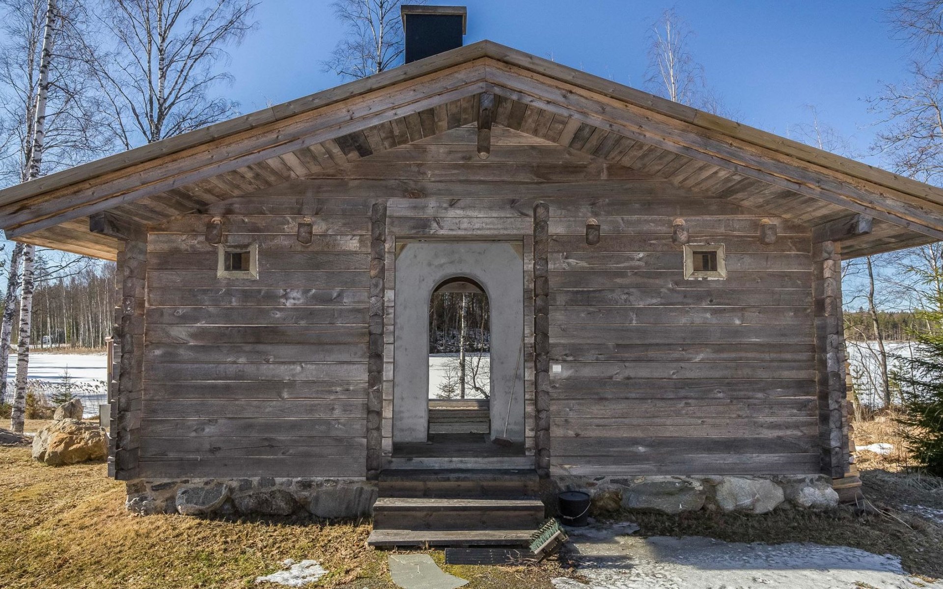 Lakeside sauna 2014, sauna lounge and sauna with wood burning sauna stove, turf roof. In the summer time, water comes to the sauna by pump. In the winter time water to sauna must be brought by using bucket.