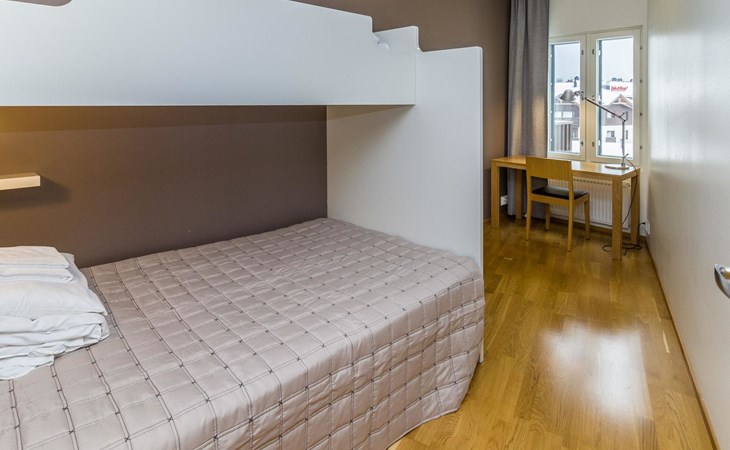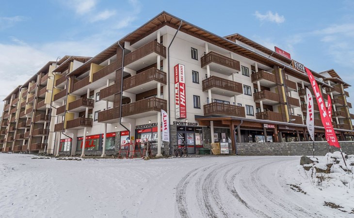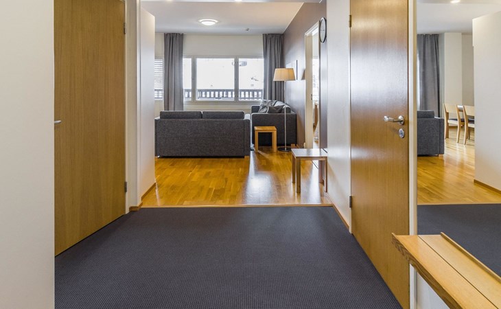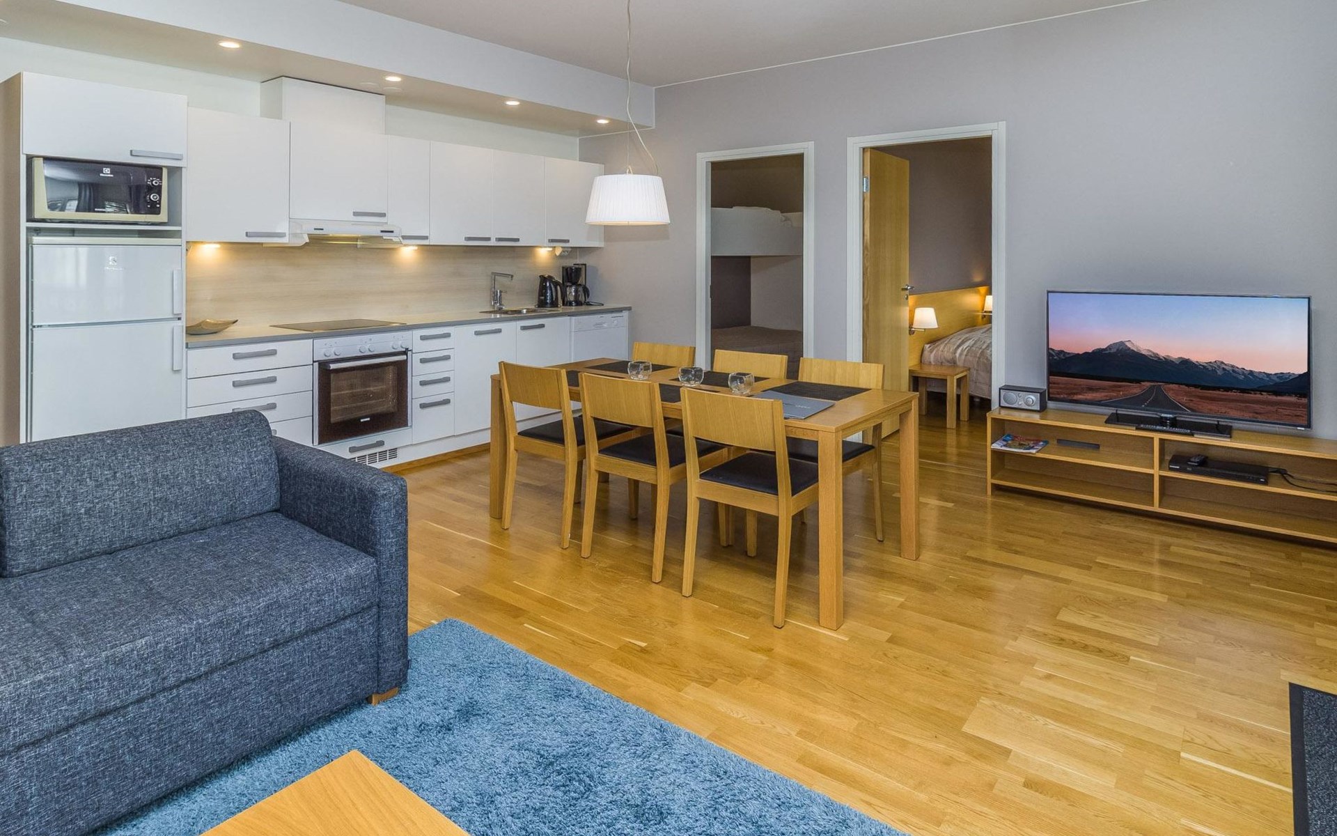 The apartment features three bedrooms, two with double beds and one with a bunk bed, where the lower bed is 120 cm wide. This makes the apartment a perfect choice for families or groups of friends. In addition, the apartment includes a cozy kitchen/living room, an electric sauna, and a spacious terrace where you can enjoy the stunning views throughout the year.