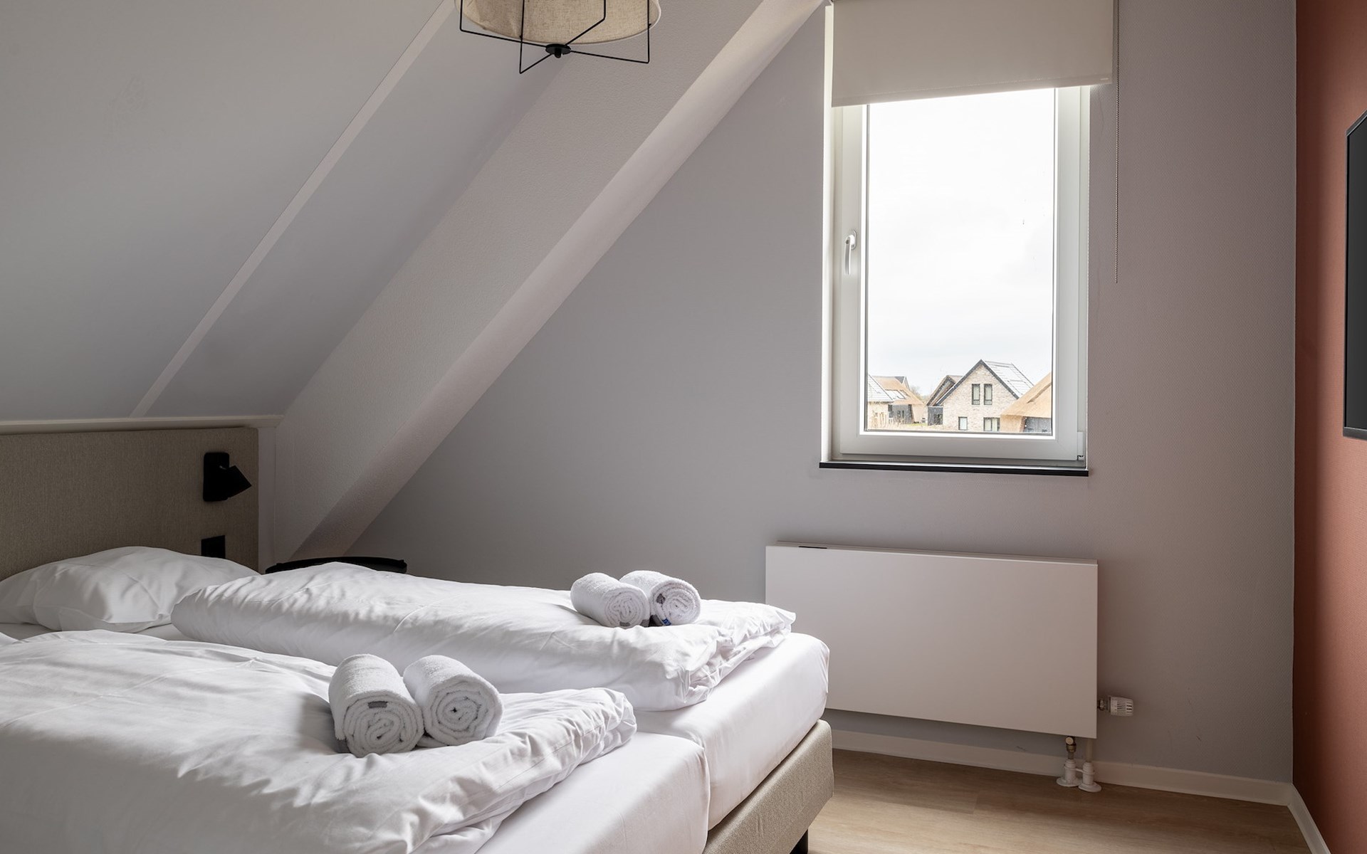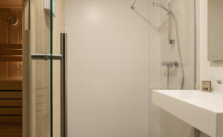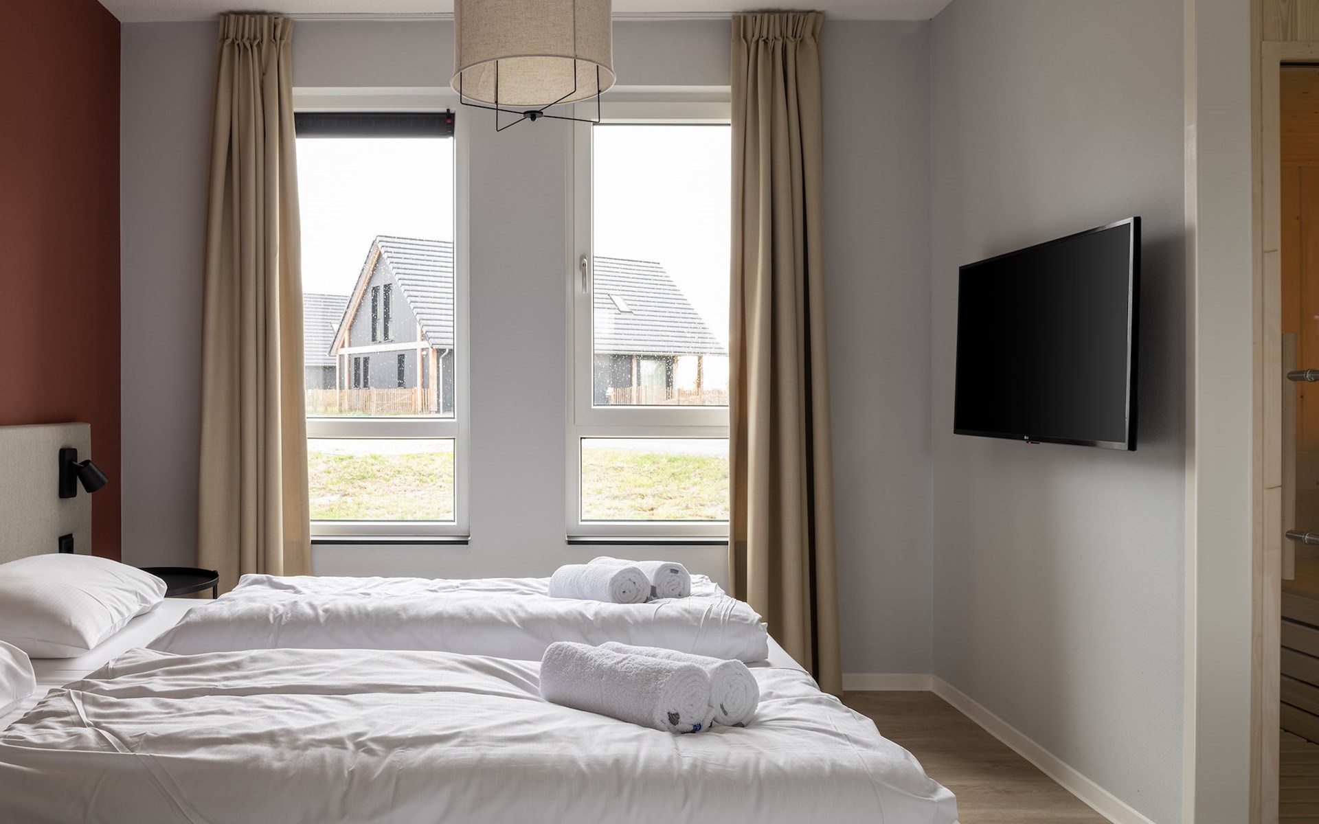 Op de begane grond bevinden zich 2 slaapkamers met elk 2 éénpersoonsbedden, waarvan 1 slaapkamer een smart-tv heeft met streaming mogelijkheid. Beide slaapkamers hebben een en-suite badkamer met douche en wastafel, waarvan één badkamer over een privé sauna beschikt en de andere badkamer over een ligbad. Daarnaast is er een separaat toilet aanwezig.