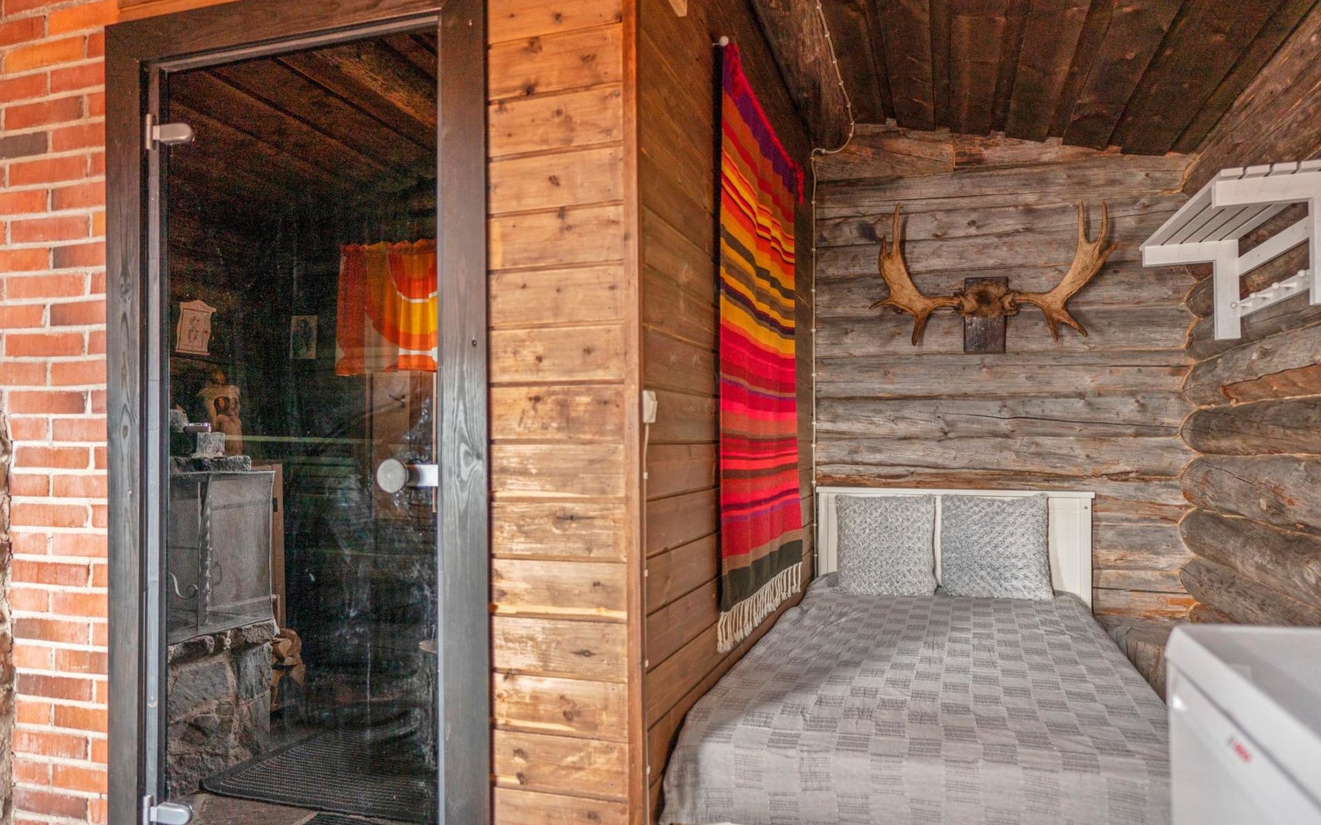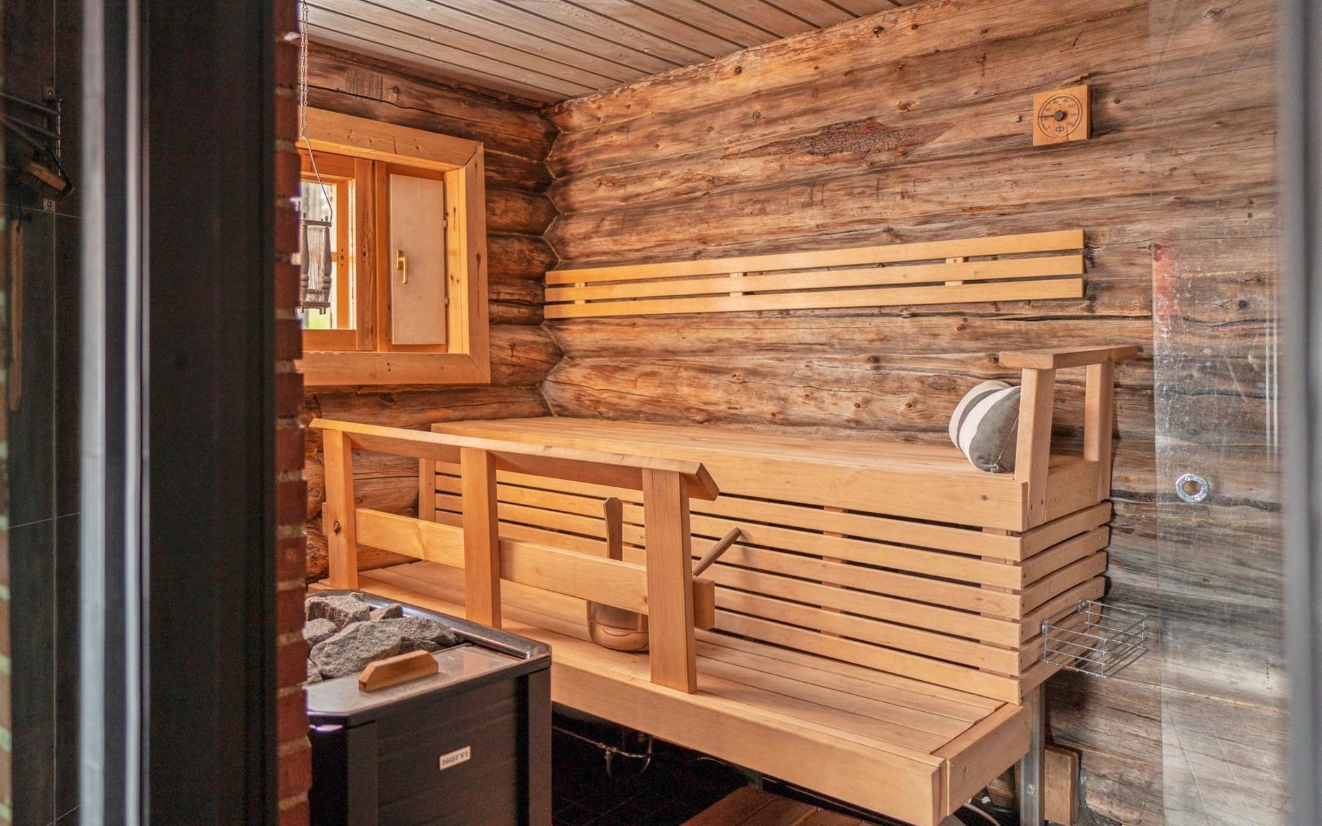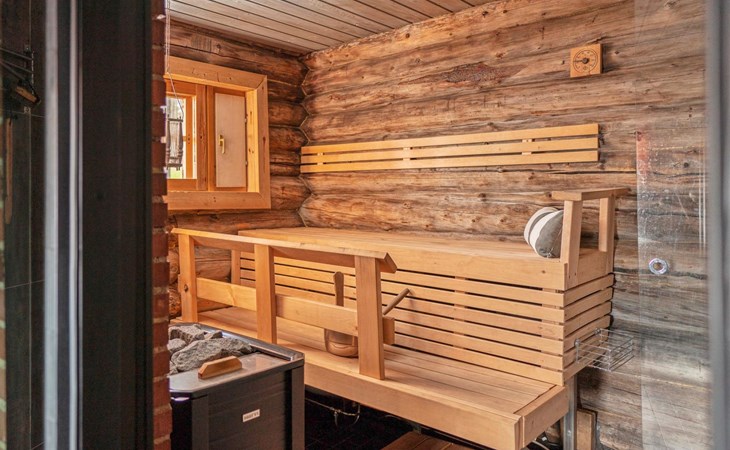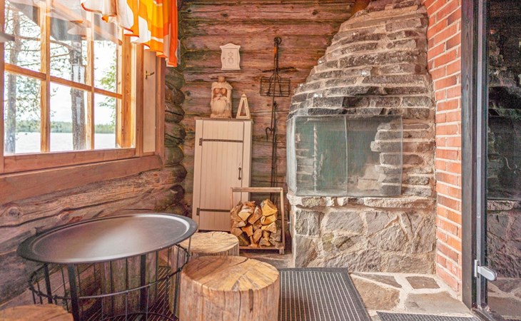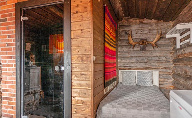 Lakeside sauna with steam room and fireplace room. 1 bed in the fireplace room. Lakeside sauna is renovated in 2020. The sauna has a shower in the steam room, electric light and electric heating. In the fireplace room, there are electric hot plates and a refrigerator.