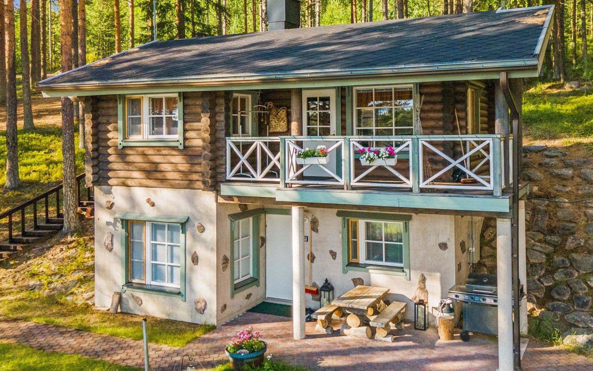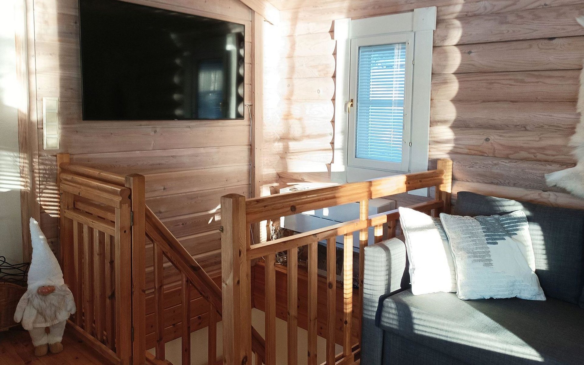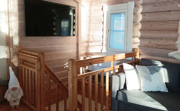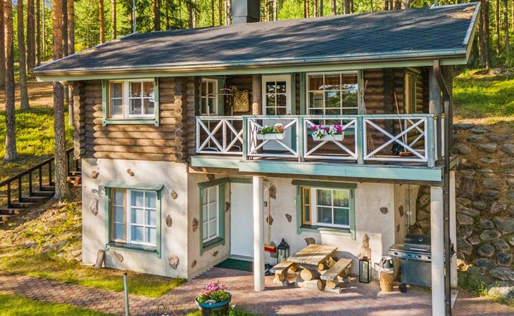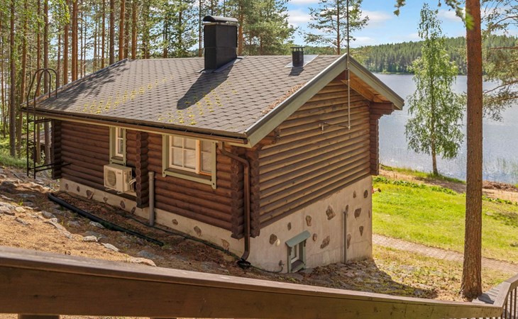 Log cabin (stone-built ground floor) on two floors, built in 2005. On the upper floor, living room with sofa bed, kitchen, bedroom (folding door) with 1 bed (width 140 cm), covered porch. On the ground floor, sauna (electric sauna stove), washroom/WC, living room with fireplace, bedroom (folding door) with double bed (width 140 cm). 2 televisions. In addition, PlayStation 2 console with some games, gas grill, and mosquito trap (so-called mosquito magnet). Water to the cabin comes from the spring.