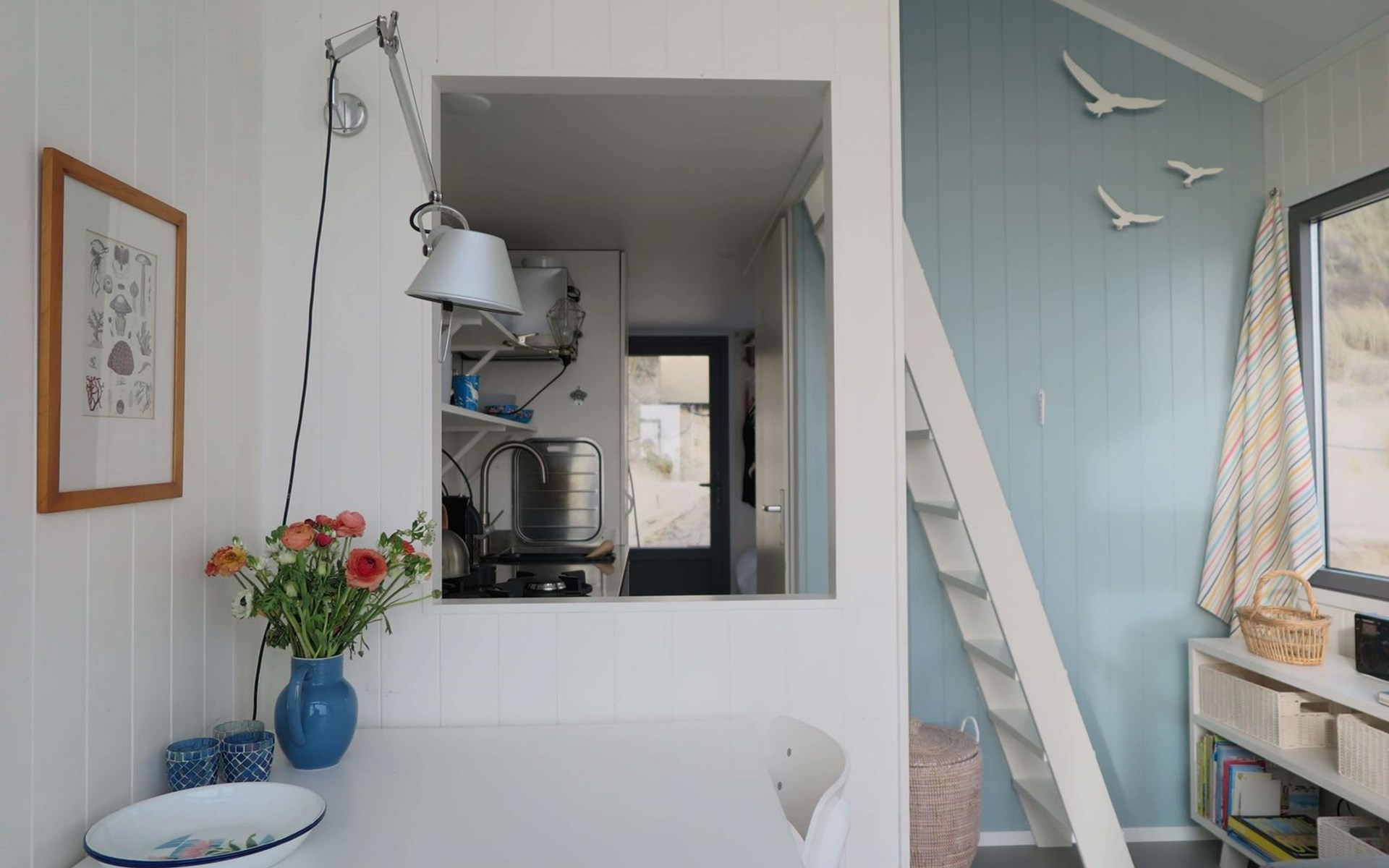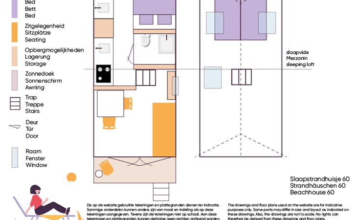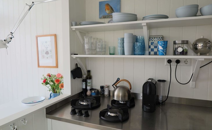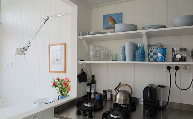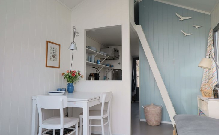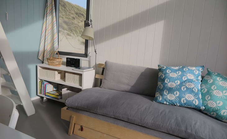De woonkamer met openslaande deuren biedt toegang tot het omheinde en afgesloten terras. Opstaan en naar bed met het zoute zilte zand tussen je tenen, de zon op je gezicht en de zee binnen handbereik. Achterin is een knus slaapvertrek met een tweepersoonsbed (140x200cm). Samen met een kledingkast, is er ook een wastafel. De keuken heeft drie gaspitten, een klein oventje en nespressomachine. De eveneens knusse slaapzolder (geen stahoogte) met een tweepersoonsbed (140x200cm) met eenpersoonsdekbedden, is geschikt voor kinderen. De eenvoudige badkamer is voorzien van een douche en basic toilet, er is geen riolering op het strand waardoor de sanitaire voorzieningen langzamer en anders werken dan gebruikelijk. Alle aanvullende informatie hierover is beschikbaar in de accommodatie of via . Je tuin is het strand en meer genieten van vrijheid, rust en ruimte vind je nergens. Geniet van de zonsopkomst en sluit af met een prachtige zonsondergang, dé ultieme strandbeleving. Het is vanaf de parkeerplaats (betaald parkeren) zo'n 10 minuten te voet om de accommodatie te bereiken.