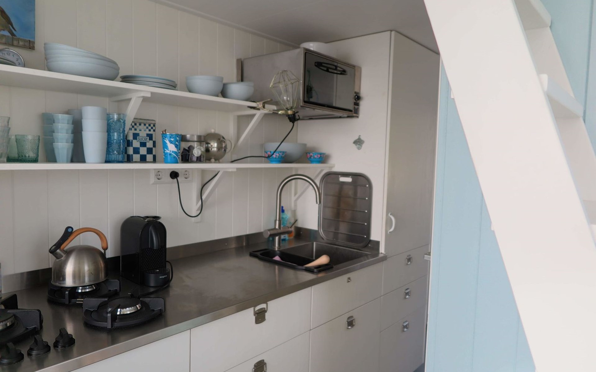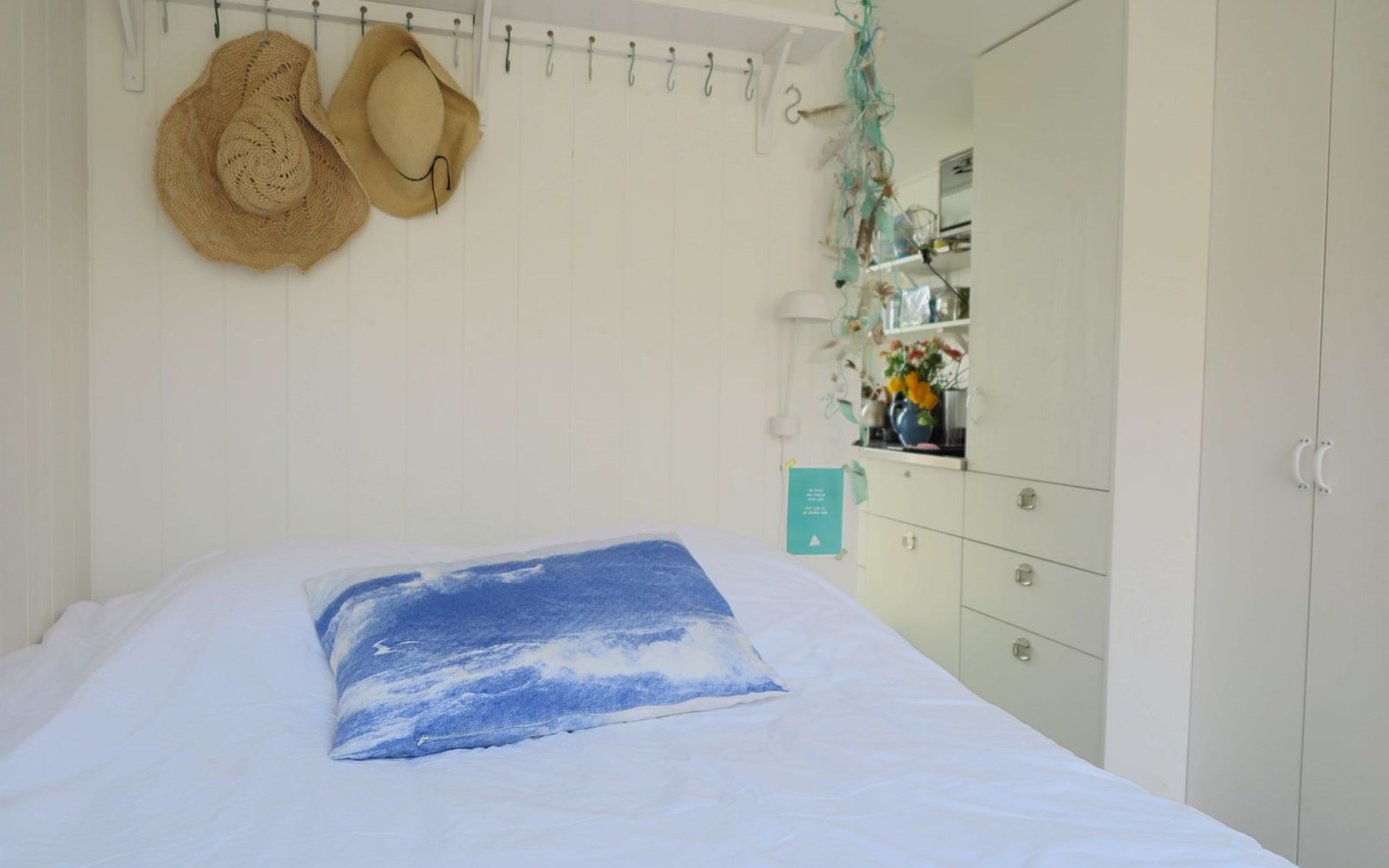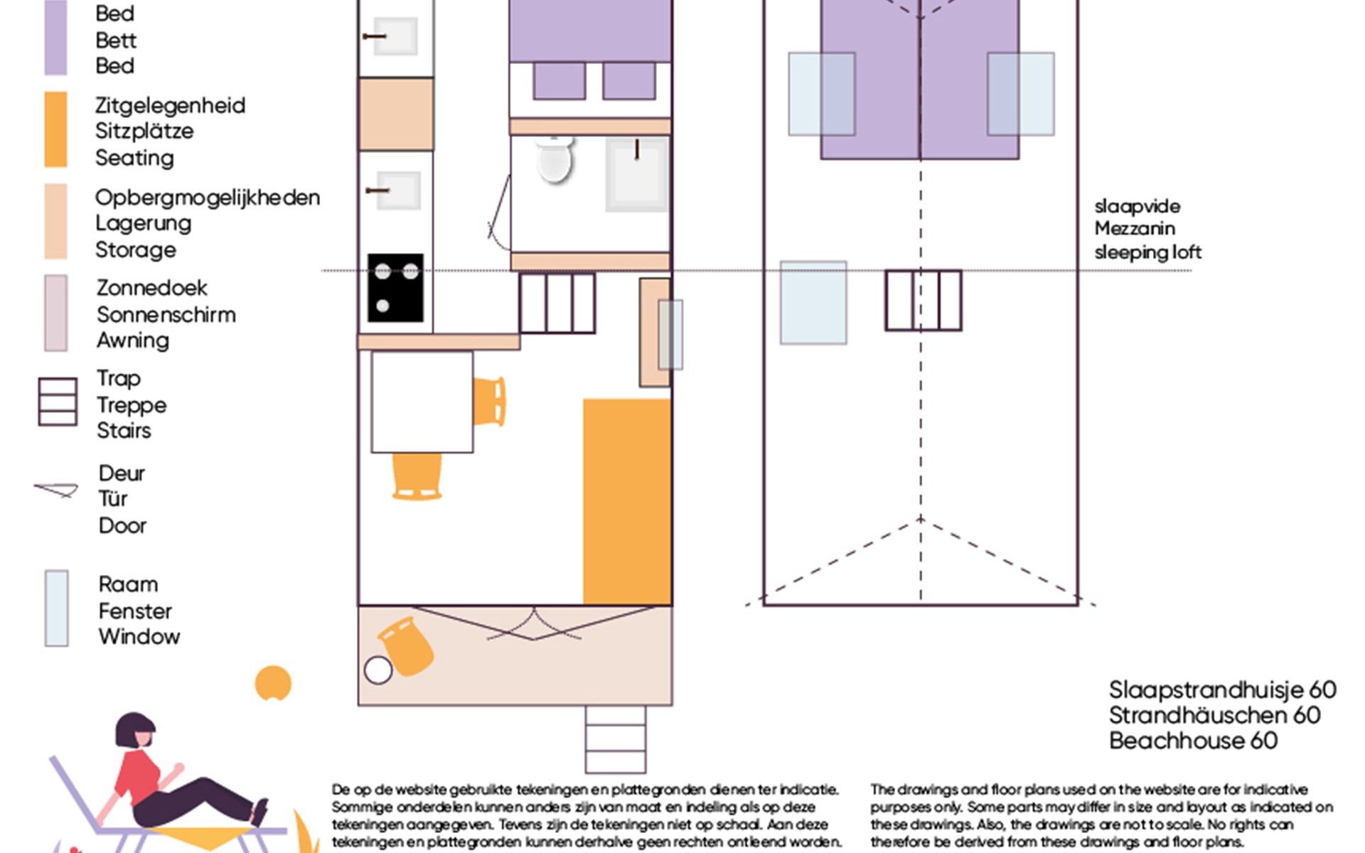 De woonkamer met openslaande deuren biedt toegang tot het omheinde en afgesloten terras. Opstaan en naar bed met het zoute zilte zand tussen je tenen, de zon op je gezicht en de zee binnen handbereik. Achterin is een knus slaapvertrek met een tweepersoonsbed (140x200cm). Samen met een kledingkast, is er ook een wastafel. De keuken heeft drie gaspitten, een klein oventje en nespressomachine. De eveneens knusse slaapzolder (geen stahoogte) met een tweepersoonsbed (140x200cm) met eenpersoonsdekbedden, is geschikt voor kinderen. De eenvoudige badkamer is voorzien van een douche en basic toilet, er is geen riolering op het strand waardoor de sanitaire voorzieningen langzamer en anders werken dan gebruikelijk. Alle aanvullende informatie hierover is beschikbaar in de accommodatie of via . Je tuin is het strand en meer genieten van vrijheid, rust en ruimte vind je nergens. Geniet van de zonsopkomst en sluit af met een prachtige zonsondergang, dé ultieme strandbeleving. Het is vanaf de parkeerplaats (betaald parkeren) zo'n 10 minuten te voet om de accommodatie te bereiken.