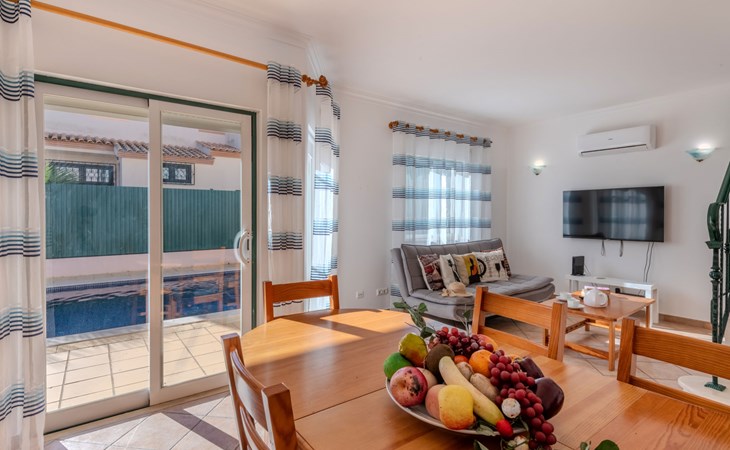 Zeer gezellig rijtjeshuis "V3 Aguia M - VIP Properties". Villa wijk, 2.7 km van zee. Voor alleengebruik: binnenplaats, openluchtzwembad hoekig (3 x 8 m, 90 - 180 cm diepte, seizoensgebonden beschikbaarheid: 01.Jan. - 31.Dec.). Barbecue. In het huis: Internet (WiFi), air-conditioning. Levensmiddelenwinkel 3 km, supermarkt 3.1 km, winkelcentrum 3.2 km, restaurant 4.2 km, bar 3 km, bakkerij 3.1 km, café 4.2 km, fietsverhuur 3 km, bushalte 3.2 km, zandstrand "Praia do peneco" 2.7 km. Jachthaven 4.2 km, golfterrein (18 holes) 5.5 km, surfschool 4.8 km, tennis 11.9 km, manege 6 km, kinderspeelplaats 10.5 km. Attracties in de buurt: Zoomarine 7.4 km, Aqualand 11.5 km, Krazy World 14.1 km, Museu Municipal de Arqueologia 3.1 km, Algarve Shopping 6.2 km, Hot Shot Bowling 4 km. Auto noodzakelijk. Geschikt voor families.