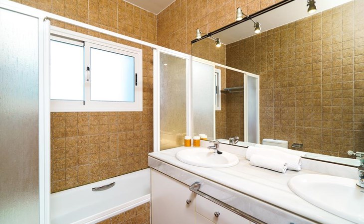 - badkamer met dubbele wastafel, douche/badcombinatie, bidet en toilet