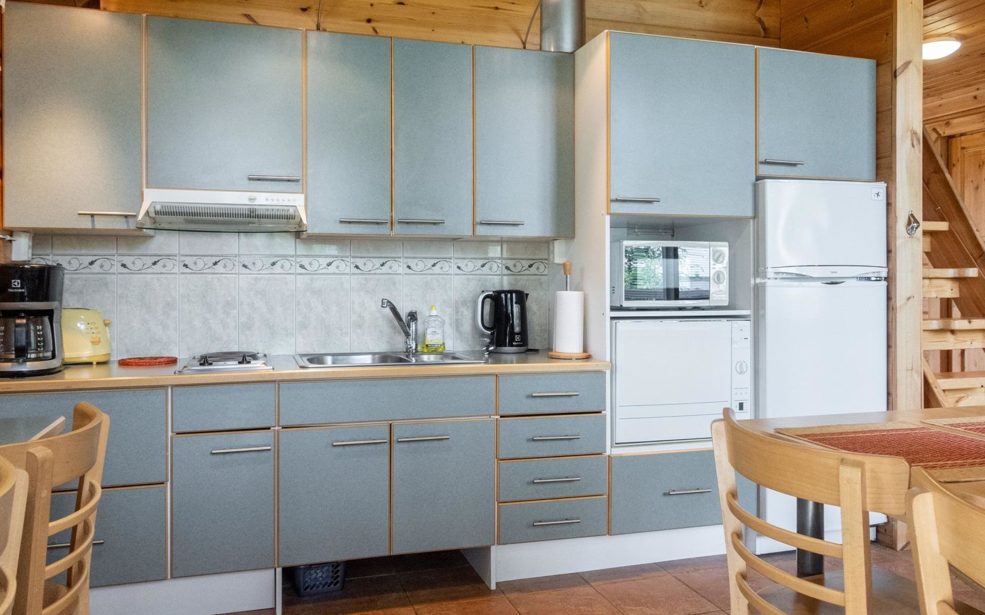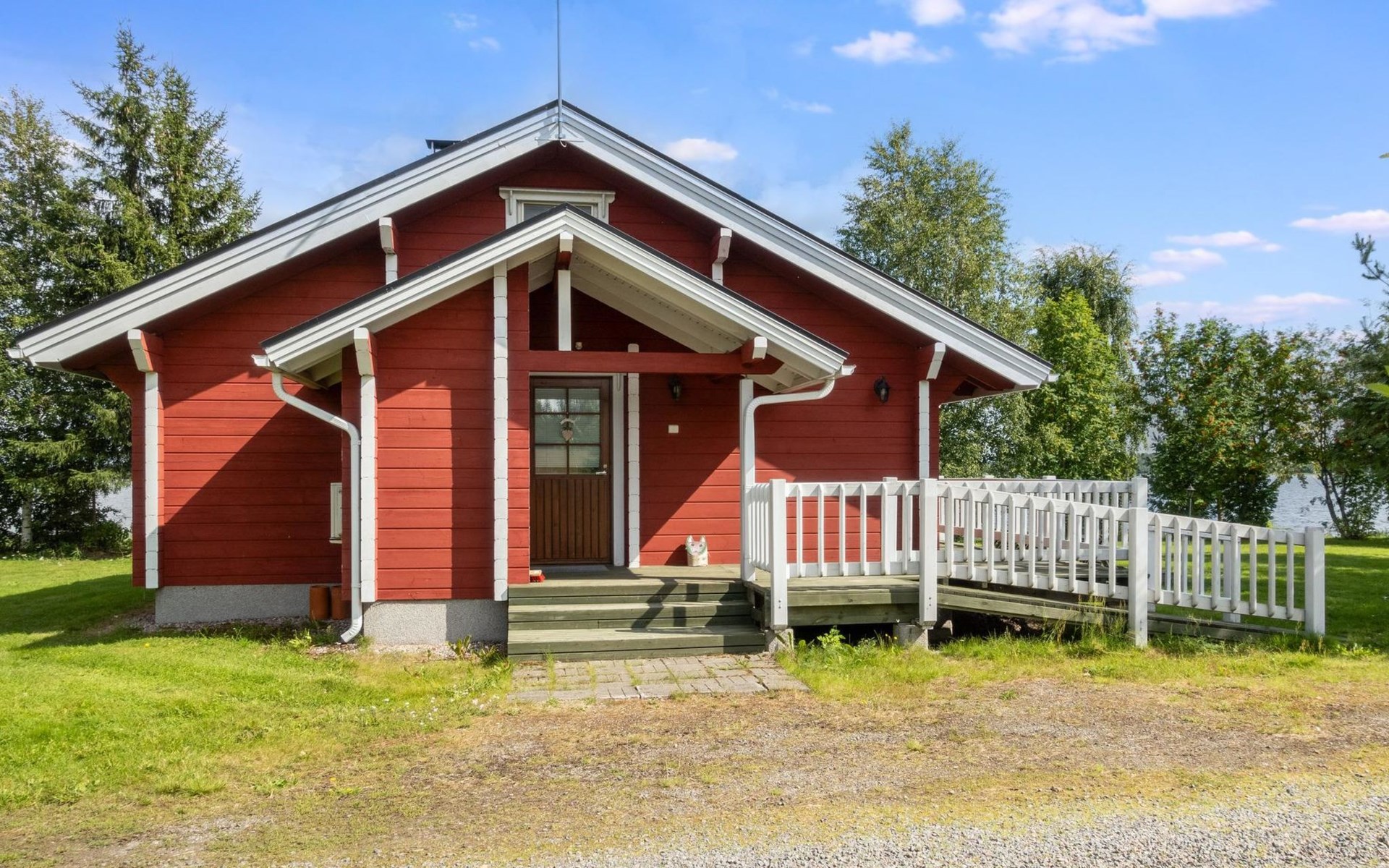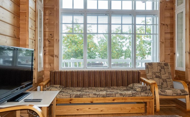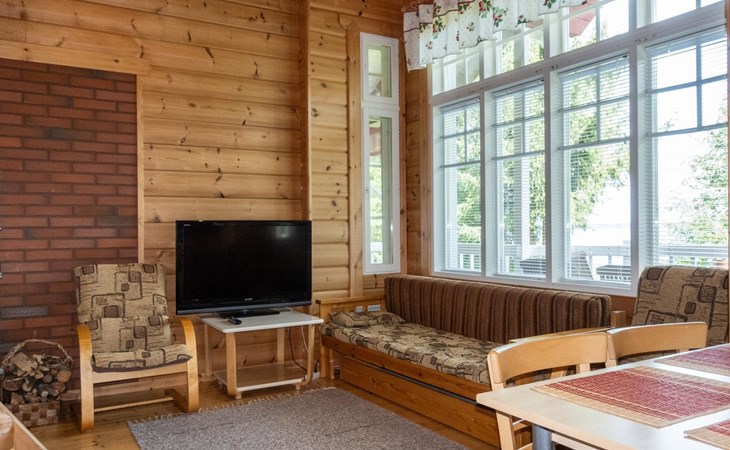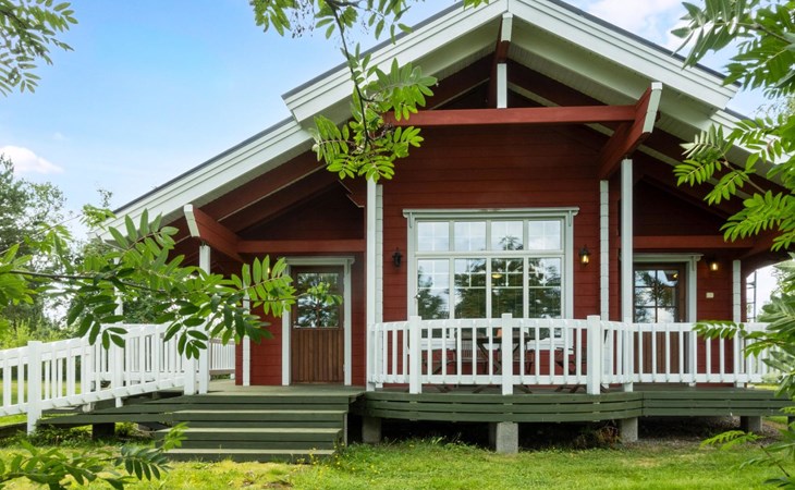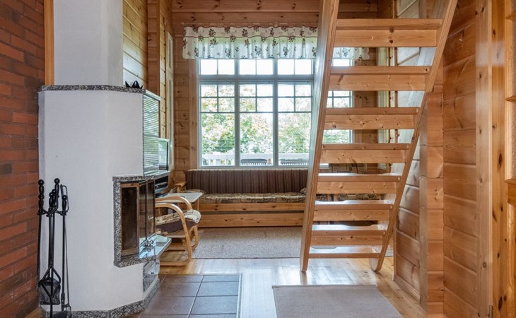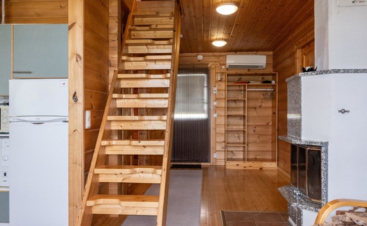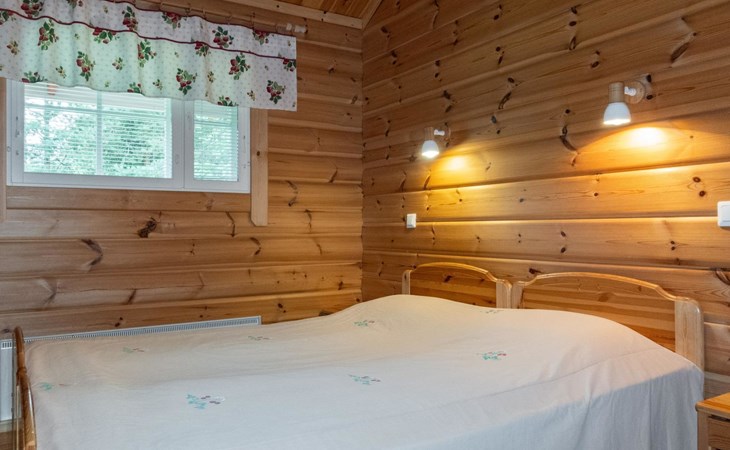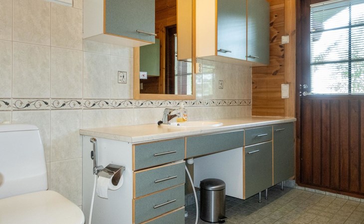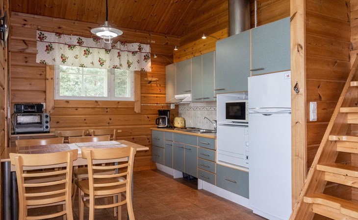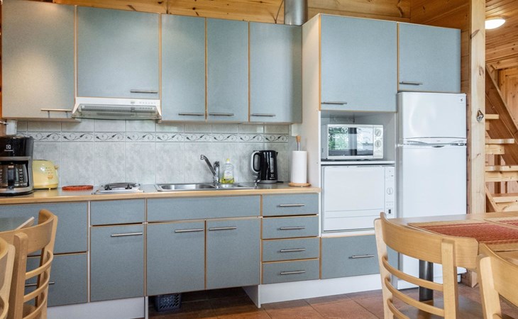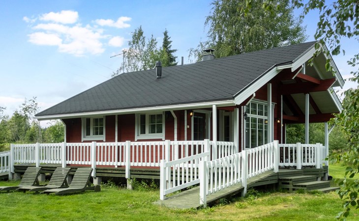 The cabin has wheelchair ramps to the entrance and terrace. The widths of the exterior and interior doors are sufficient for a wheelchair. However, there are low thresholds at the entrances and in the doorways of the sauna area. The kitchen counter and dining table in the cabin are lower than usual.
