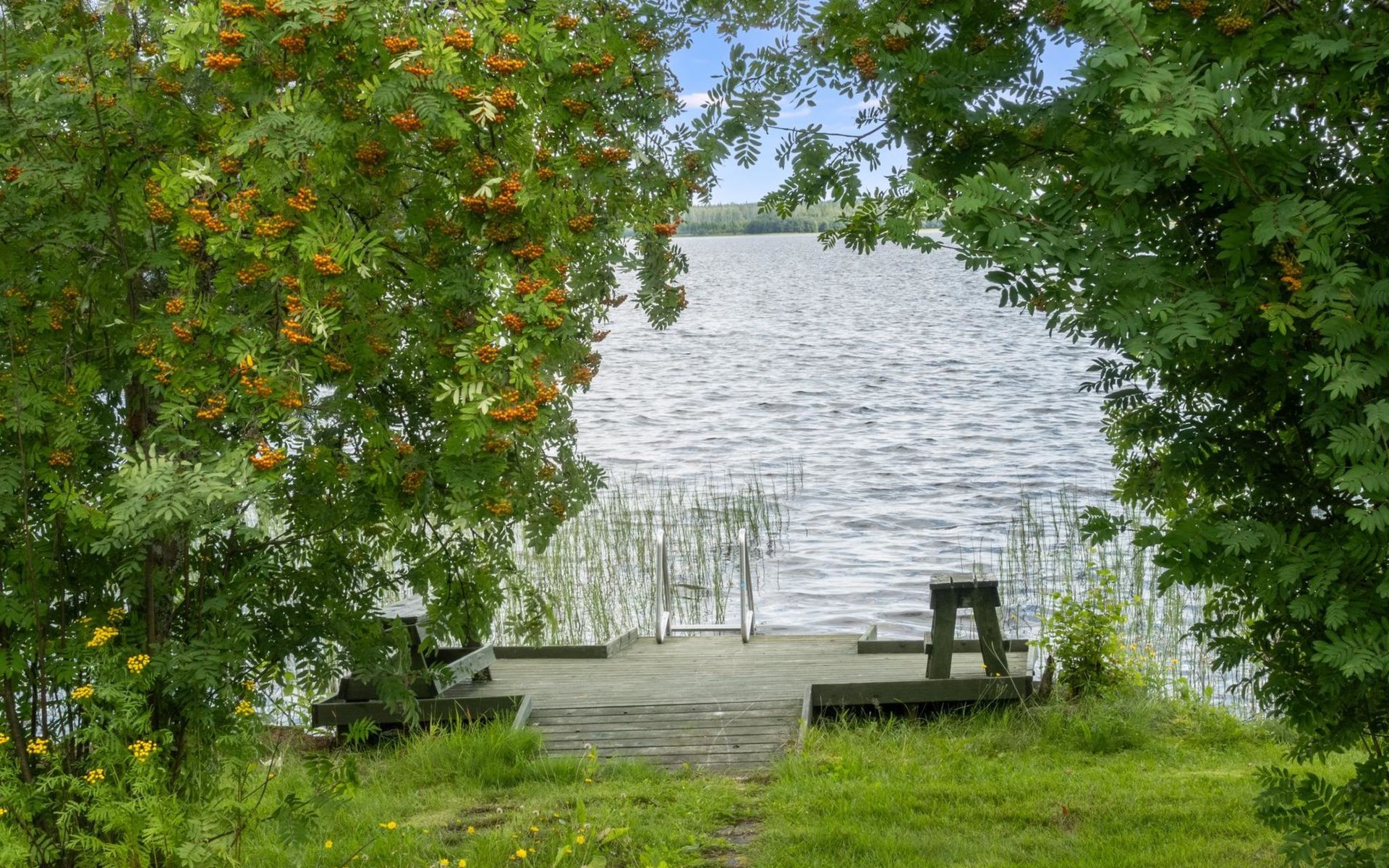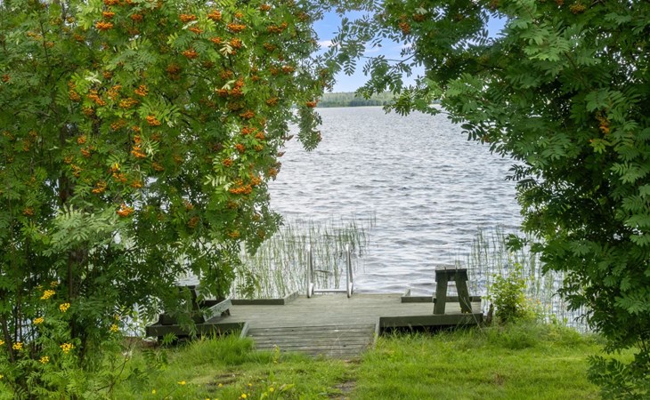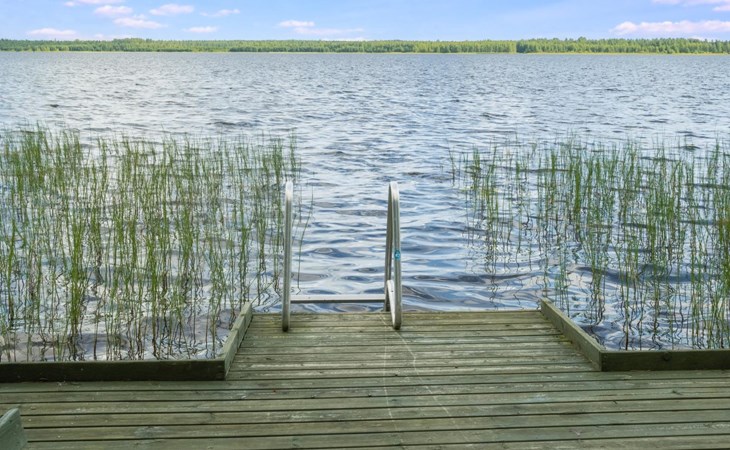 The cabin is located on a flat grassy plot close to the shore. It is only 10 meters from the cabin to the shores of Lake Pyhäjärvi, where a shallow, sandy-bottomed beach occasionally has some grass growth. There is a pier at the beach with metal steps leading into the water. A rowing boat is also available for your use.