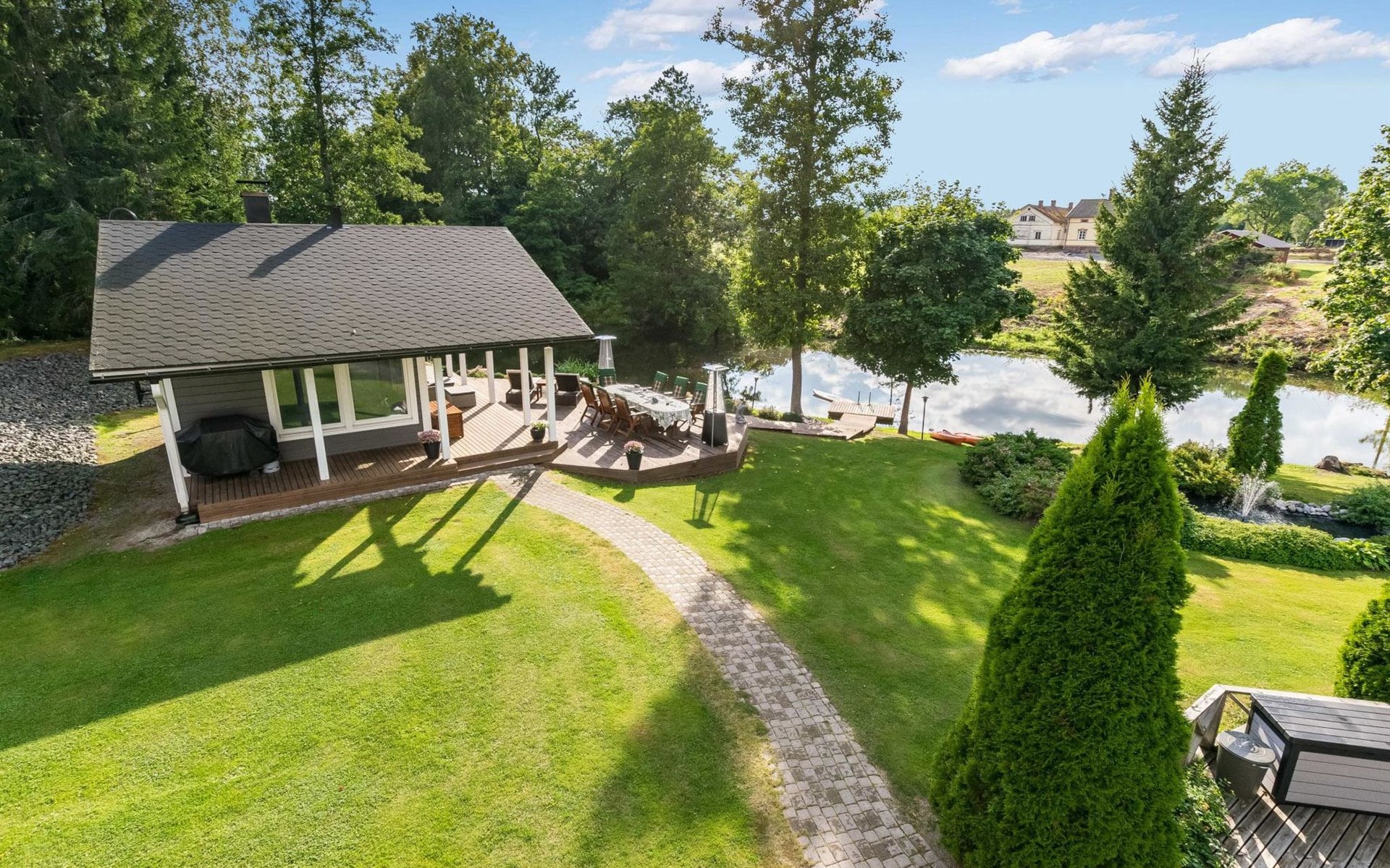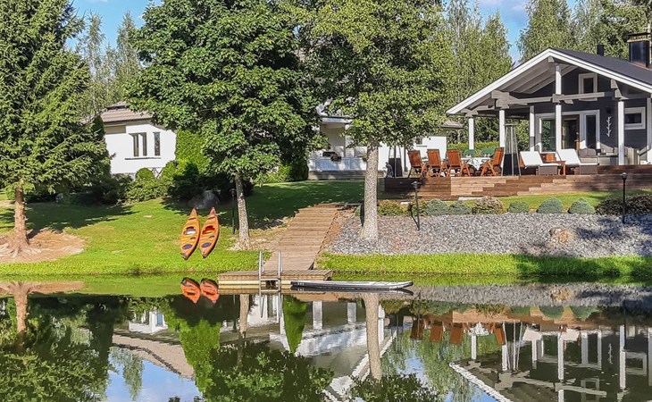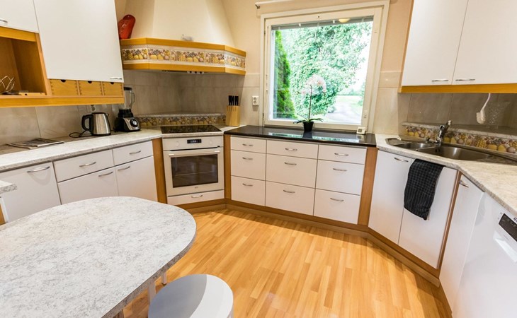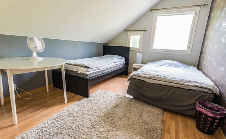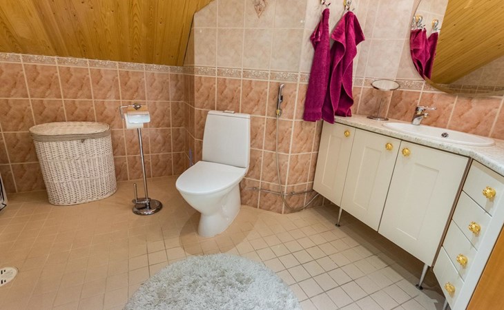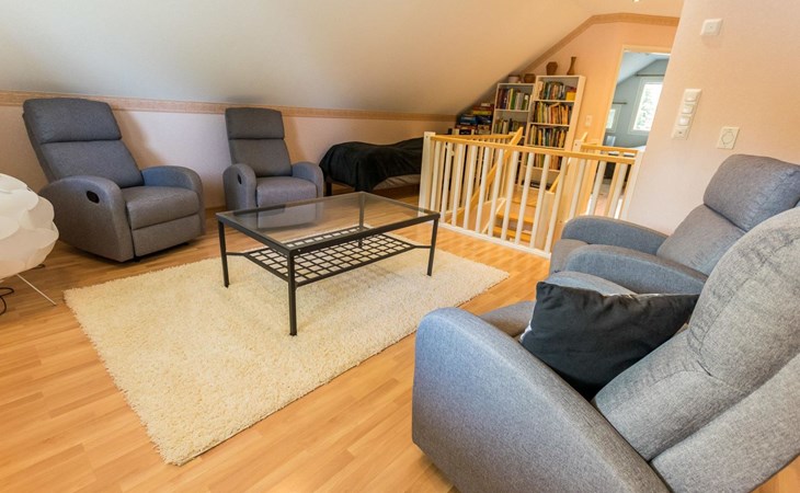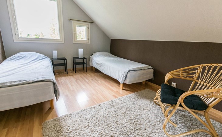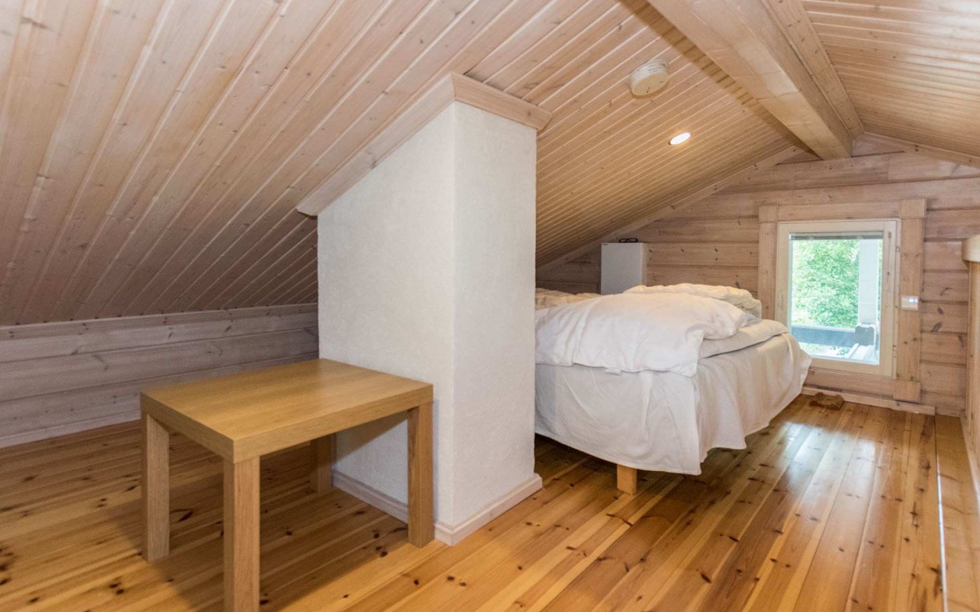 Main building 190 m²: On the ground floor, 3 bedrooms: 180 cm wide motor bed in the master bedroom (beds can be separated if necessary), in the second bedroom a 160 cm wide double bed and in the third two single beds. Kitchen, separate WC, instant ready electric sauna stove, hydro massage bath. On the upper floor, 2 bedrooms with two separate beds each, separate WC, living area. In alcove 2 beds, laver to be spread and mattress.