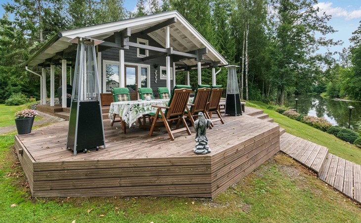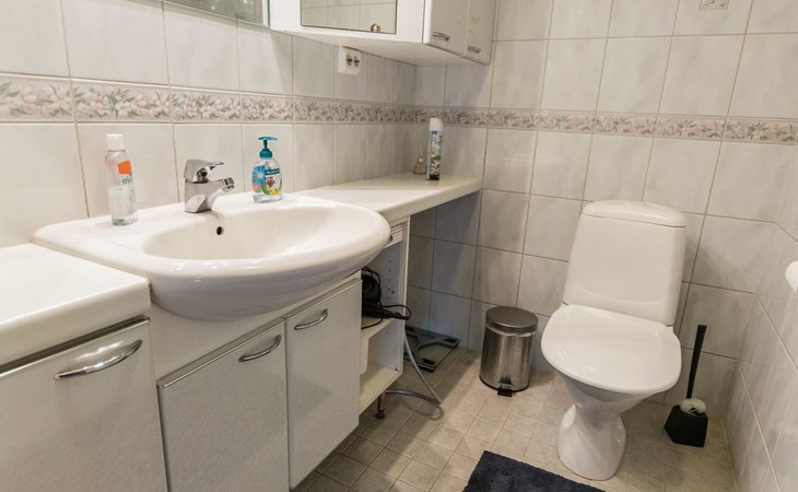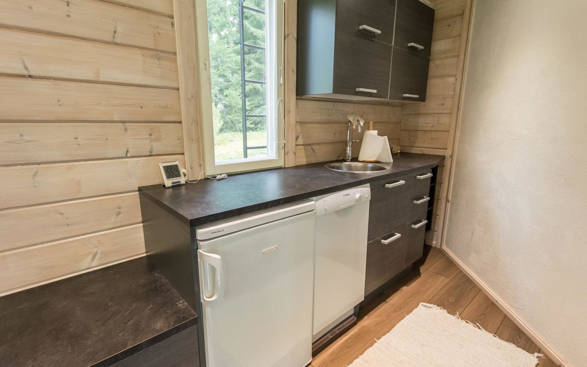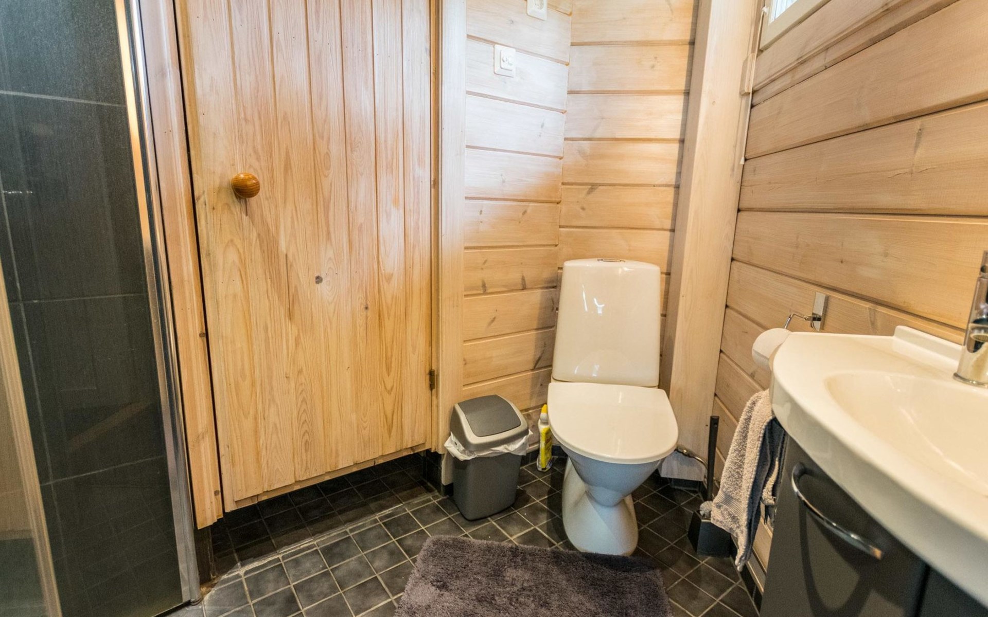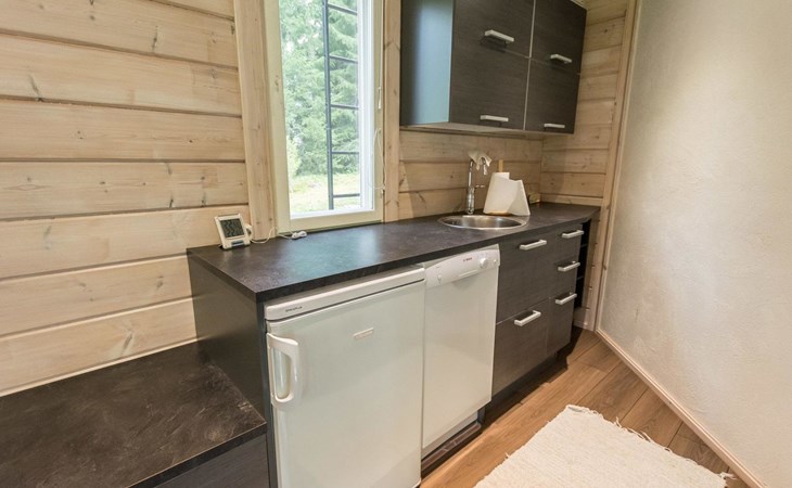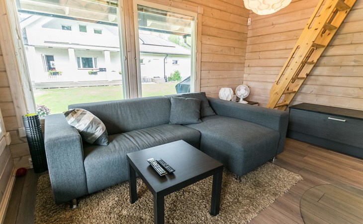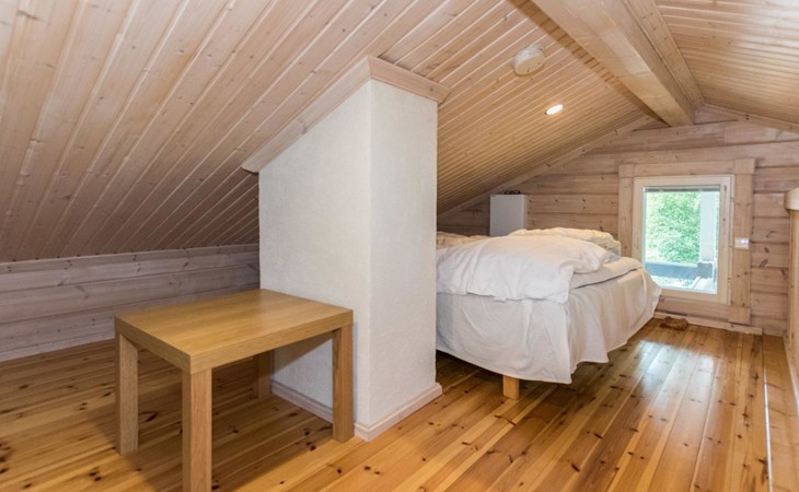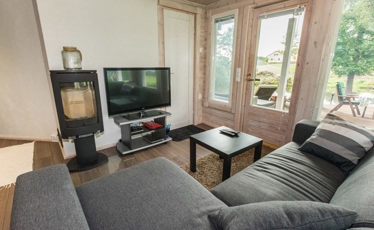 There are spacious living areas in a log cabin; living room/kitchen, bedroom with 200 cm wide double bed, another bedroom with 200 cm wide double bed (Tempur), separate WC with shower cubicle, fireplace, air source heat pump.