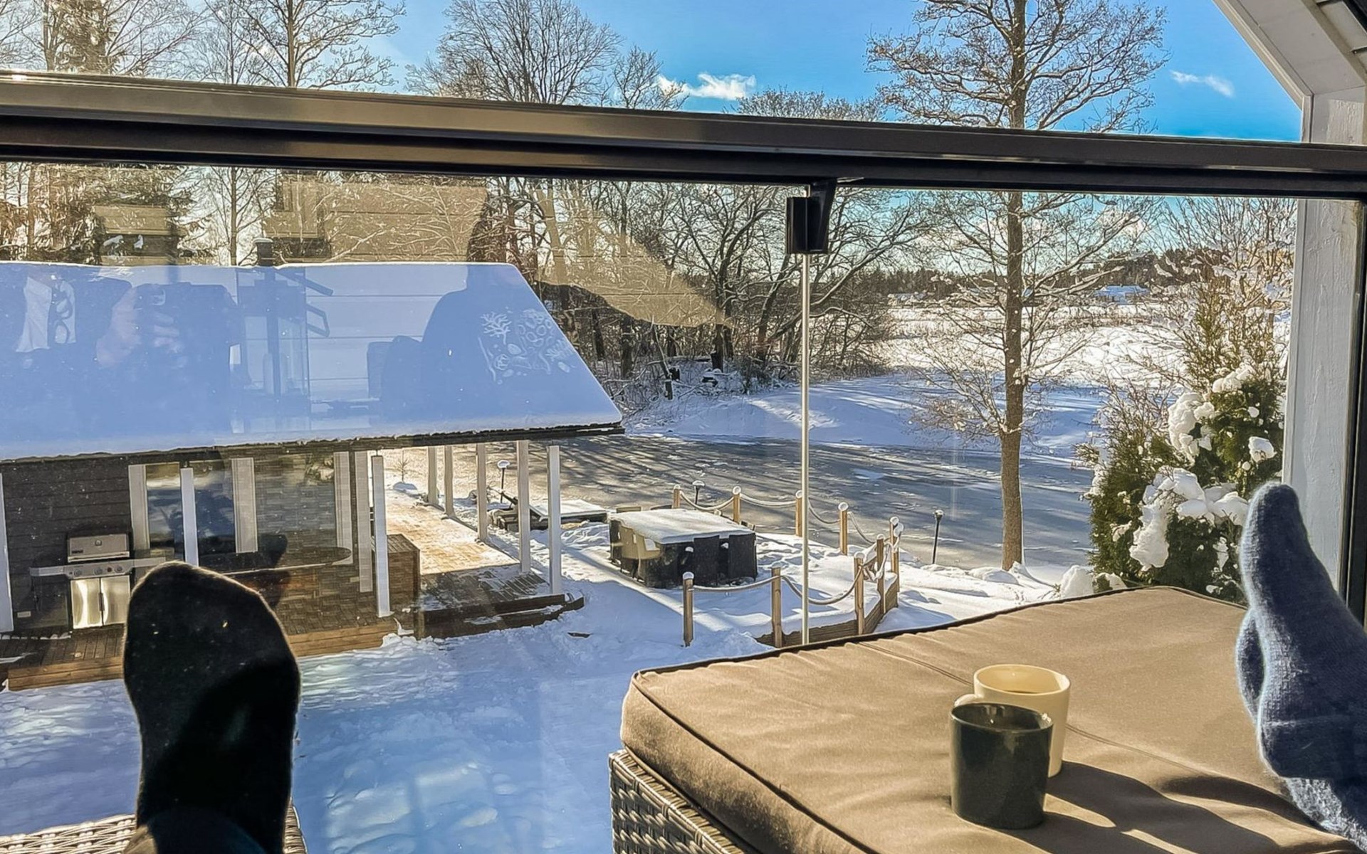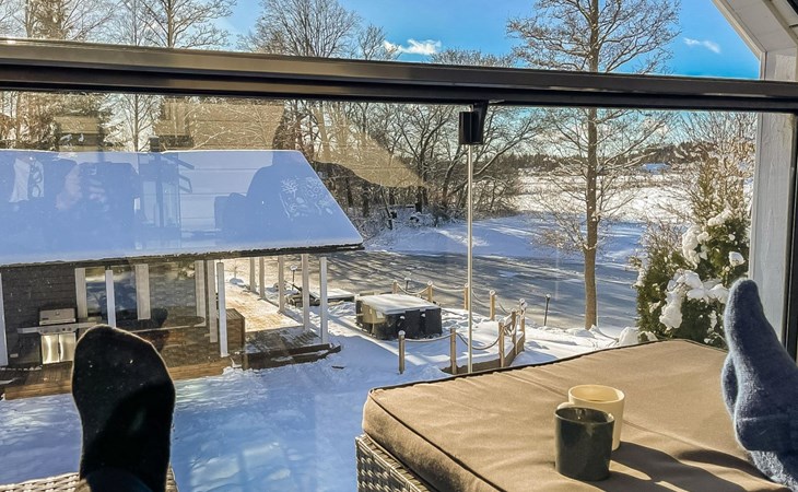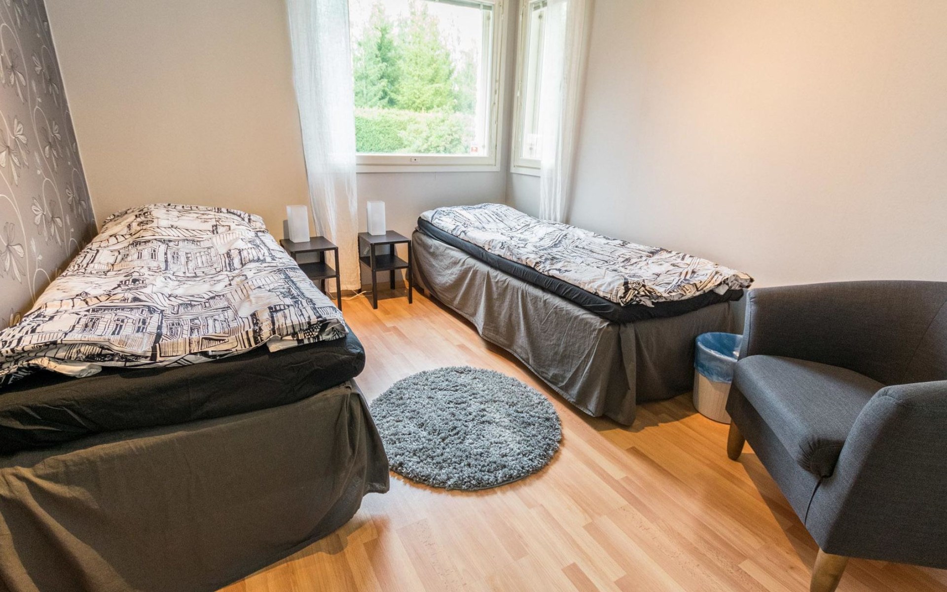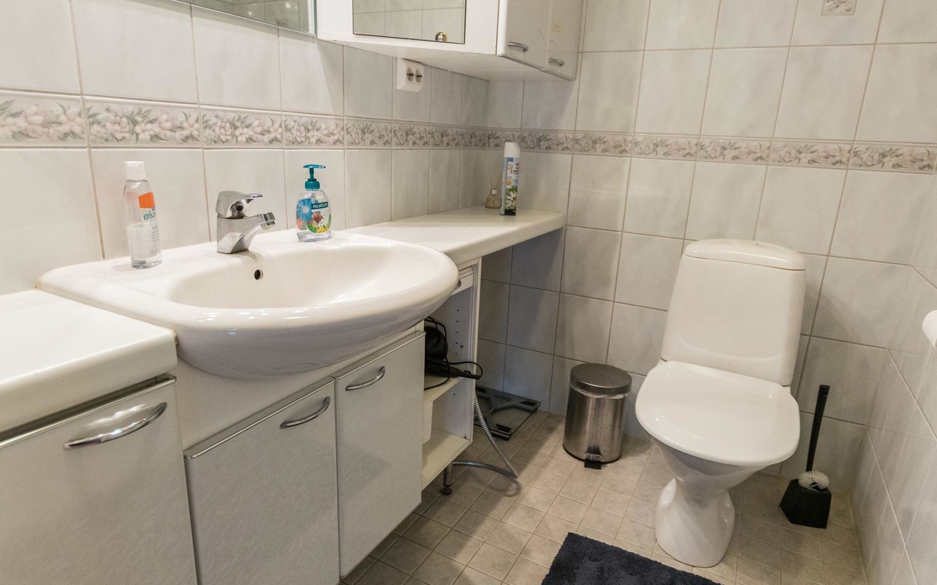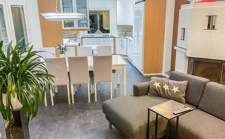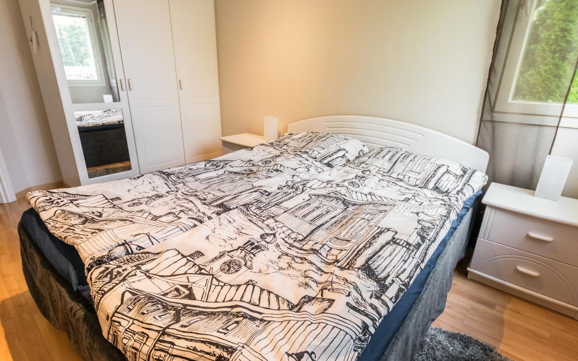 There are spacious living areas in a log cabin; living room/kitchen, bedroom with 200 cm wide double bed, another bedroom with 200 cm wide double bed (Tempur), separate WC with shower cubicle, fireplace, air source heat pump.