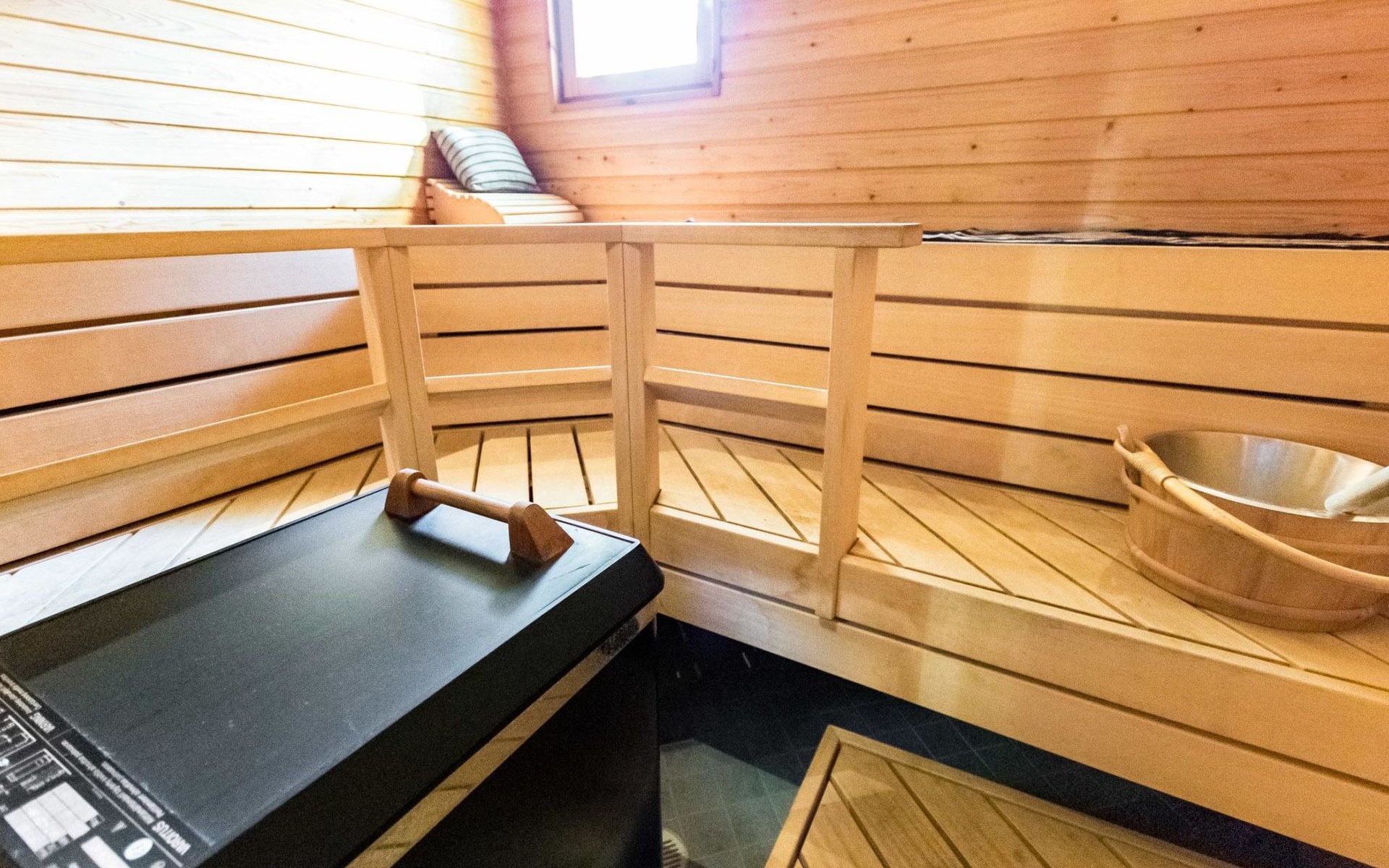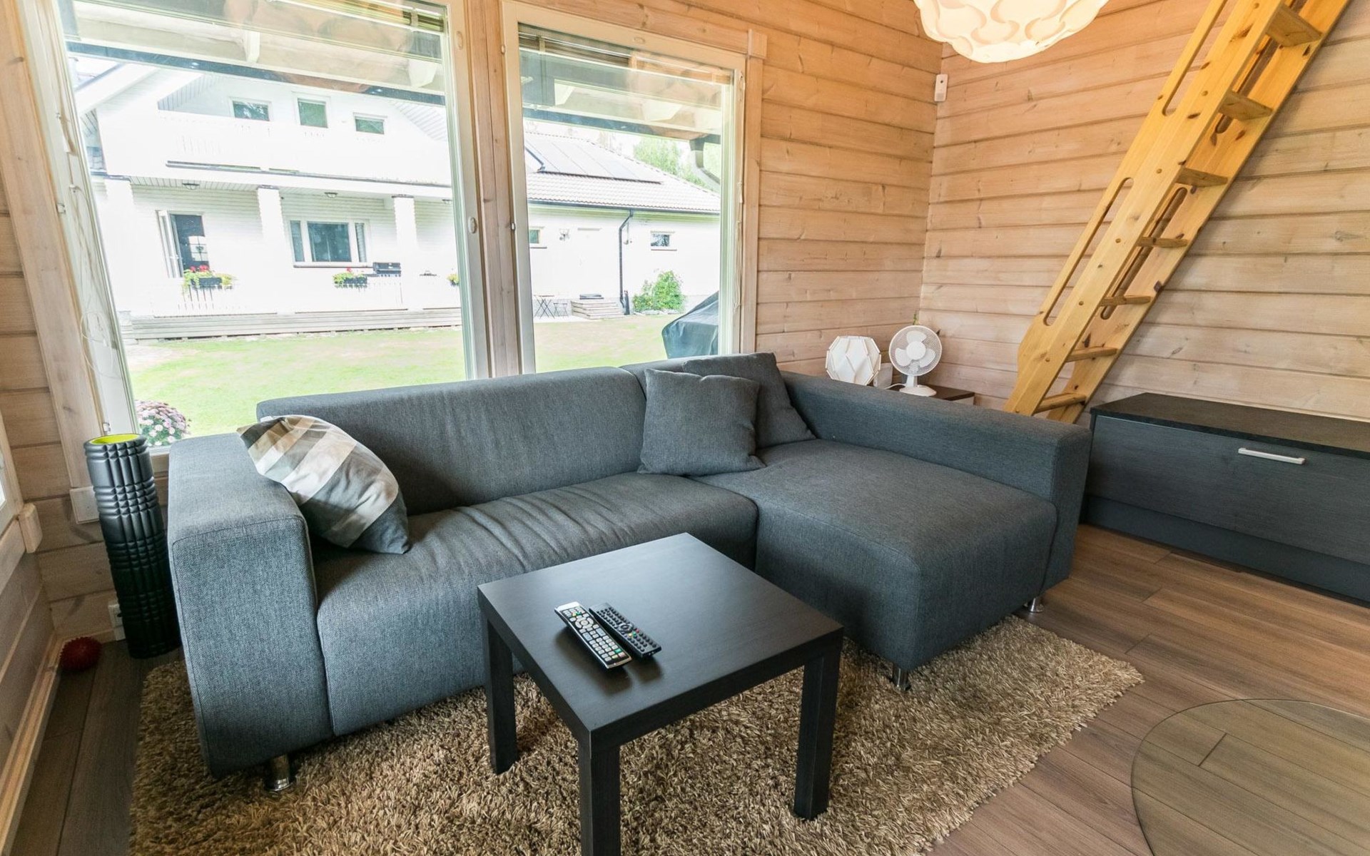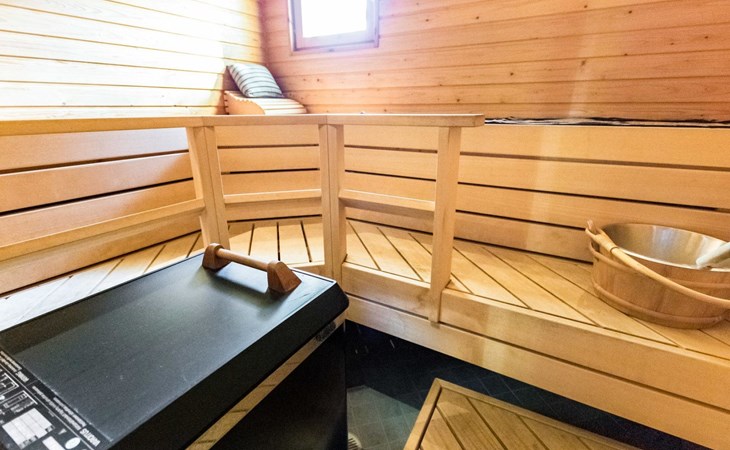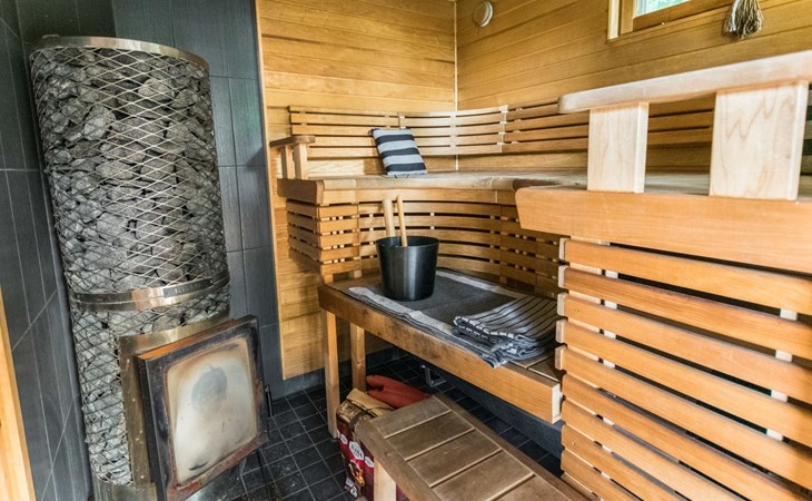 Log-built sauna building 25 m²: wood-heated sauna, TV lounge, 140 wide sofa bed and 2 mattresses, sleeping loft with 120 cm wide bed, separate WC, fridge, dishwasher.