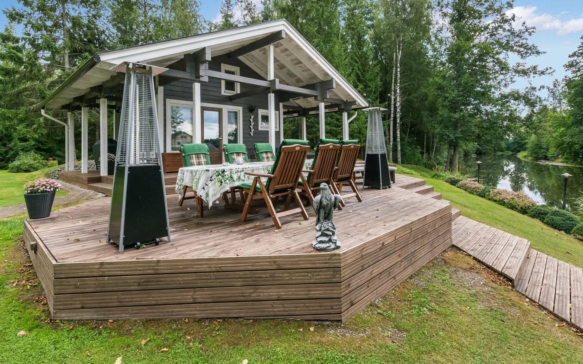 Wide terrace area with elegant furniture, gas grill and outdoor hydro massage bath in front of the log cabin.